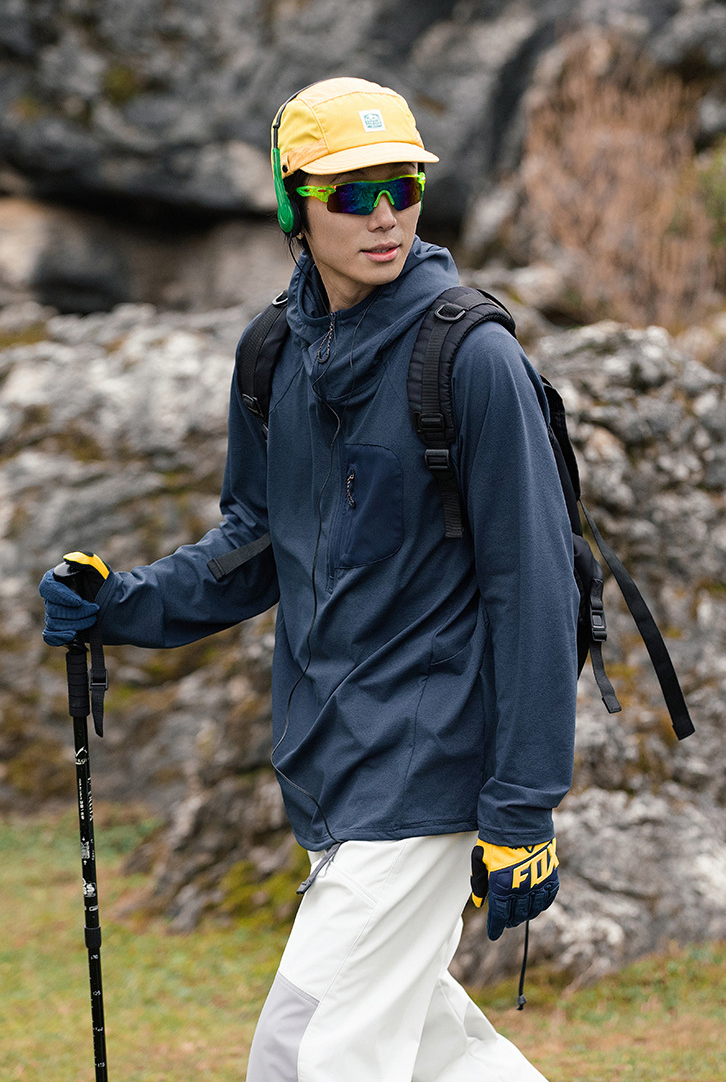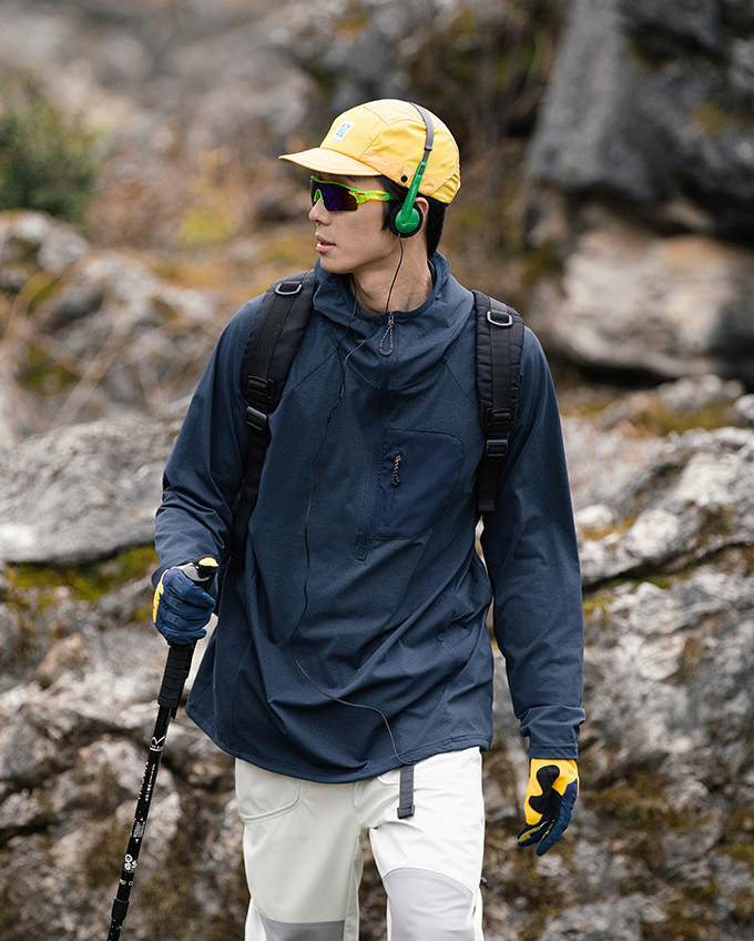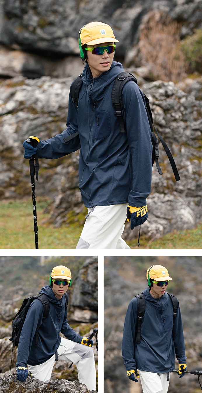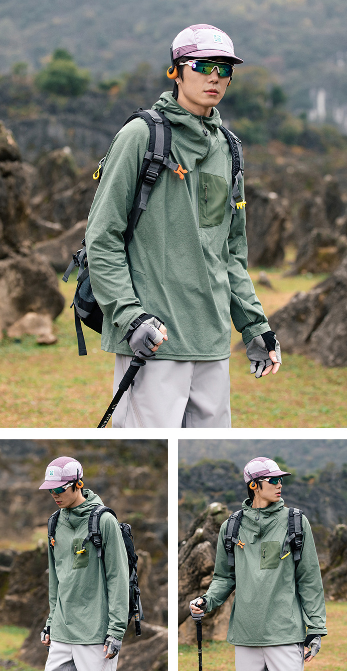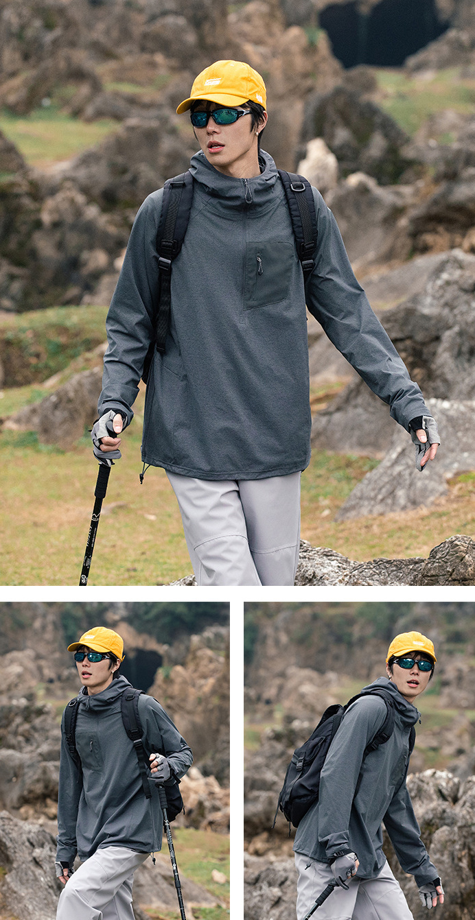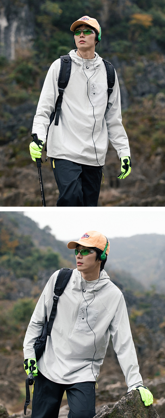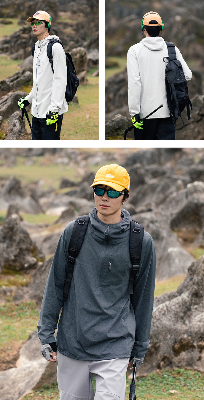 후드 디자인의 아웃도어 빅포켓 티셔츠입니다.