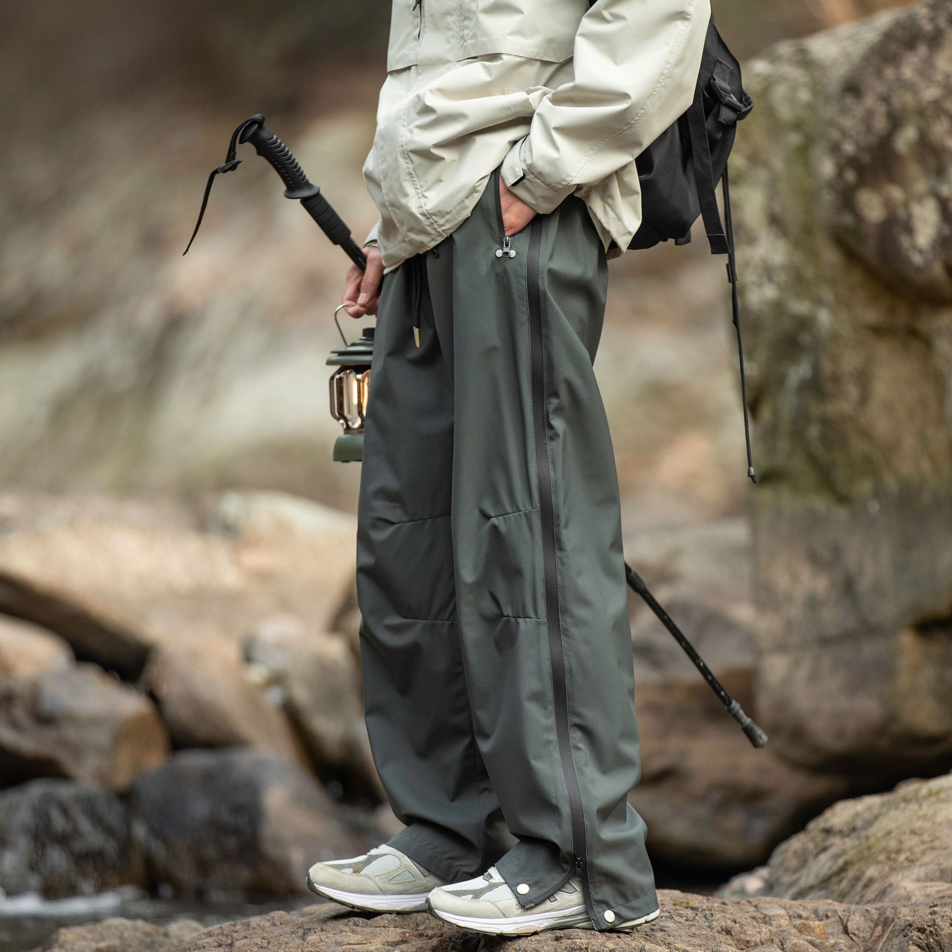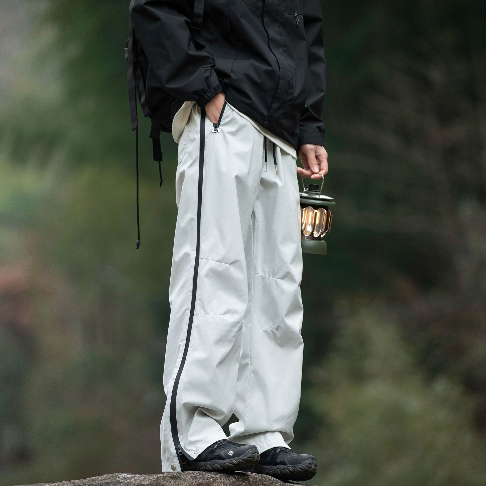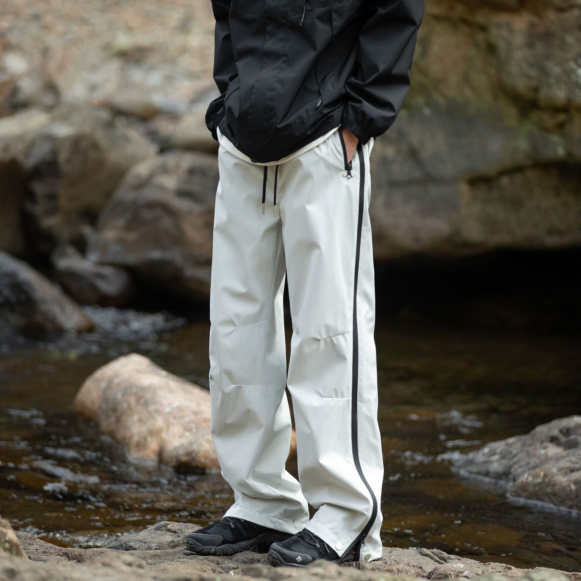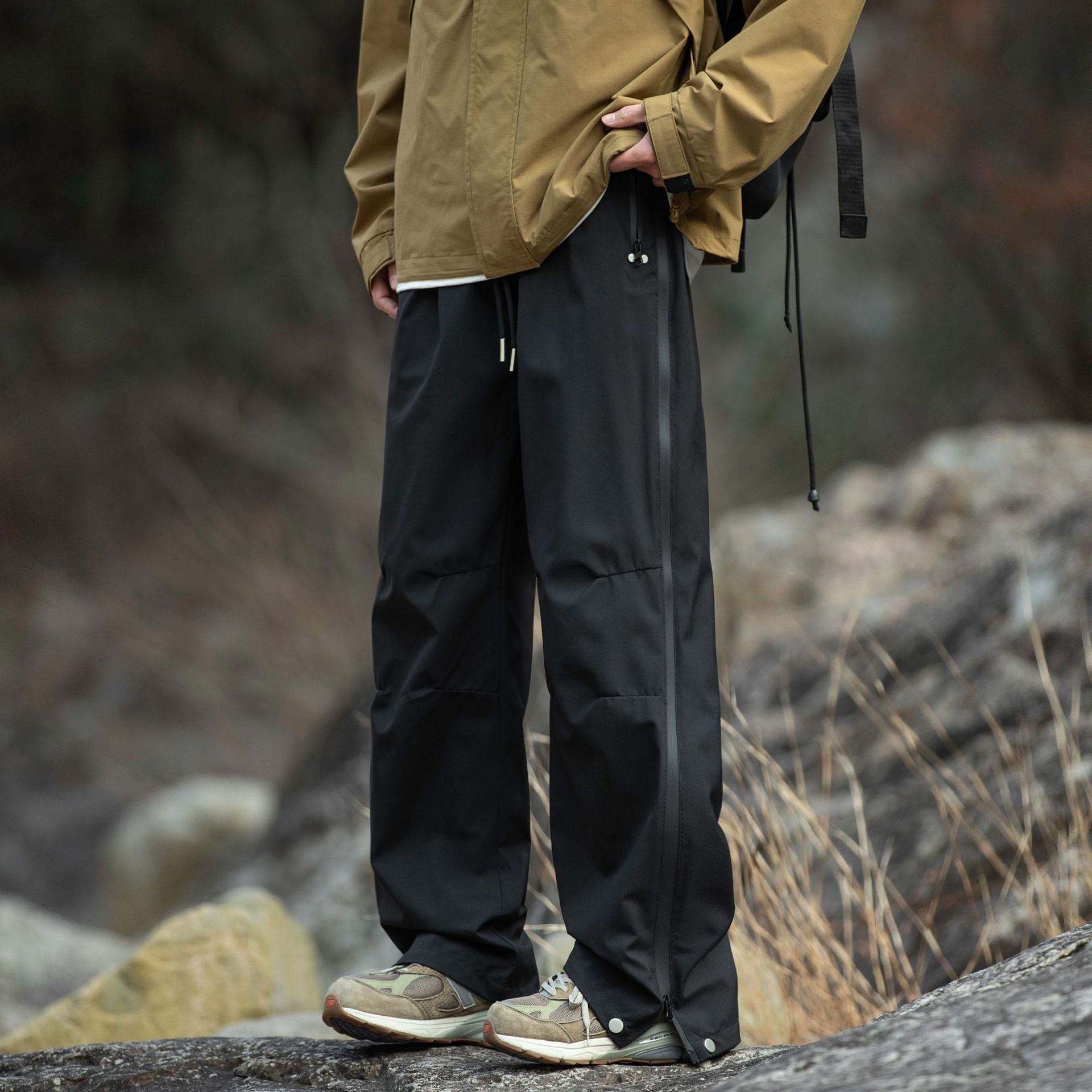 워터프루프 원단의 아웃도어 스트레이트 지퍼 팬츠입니다.