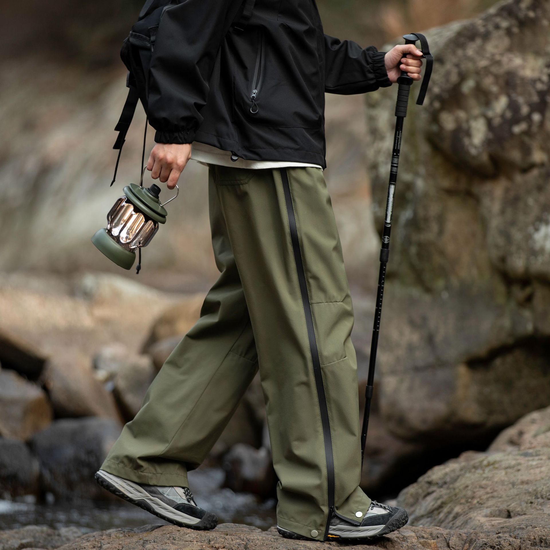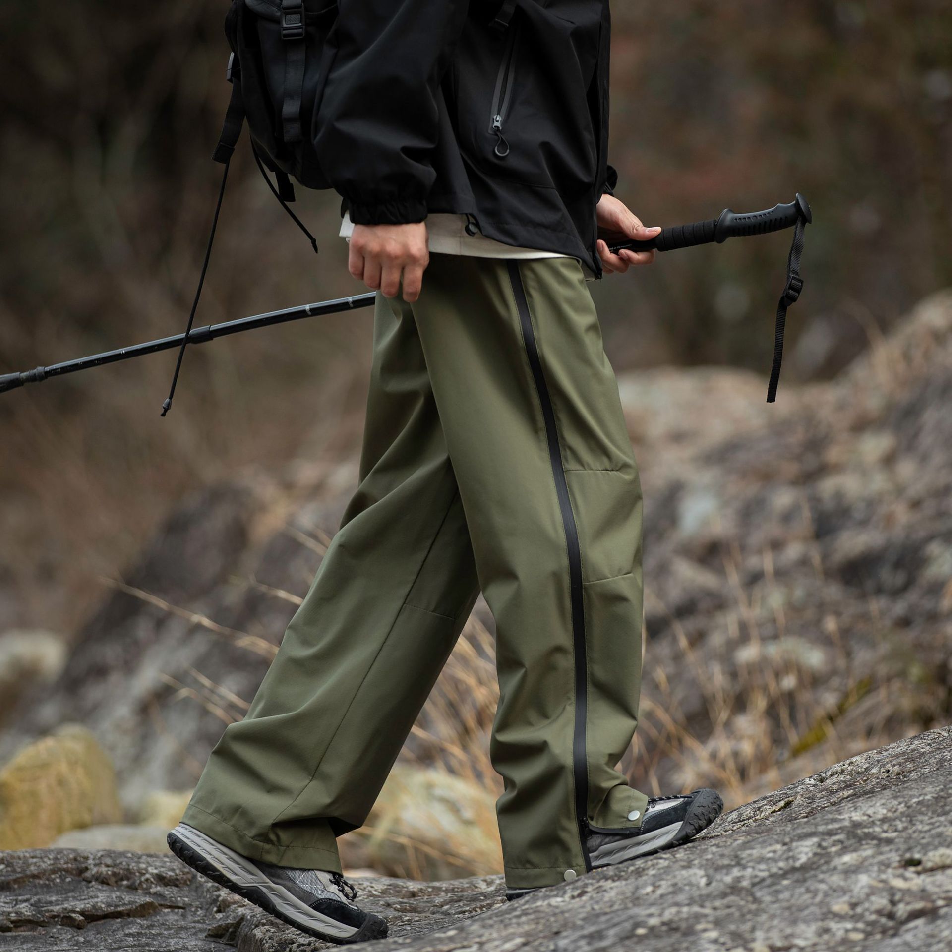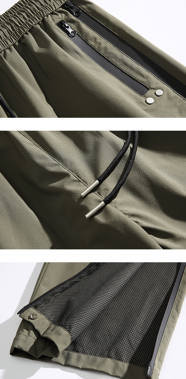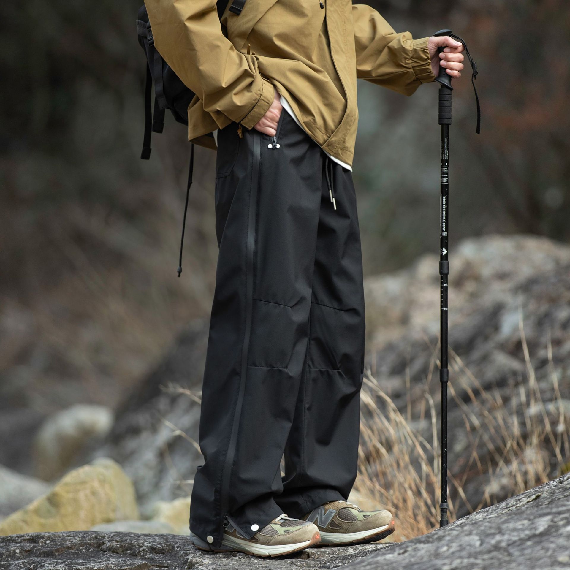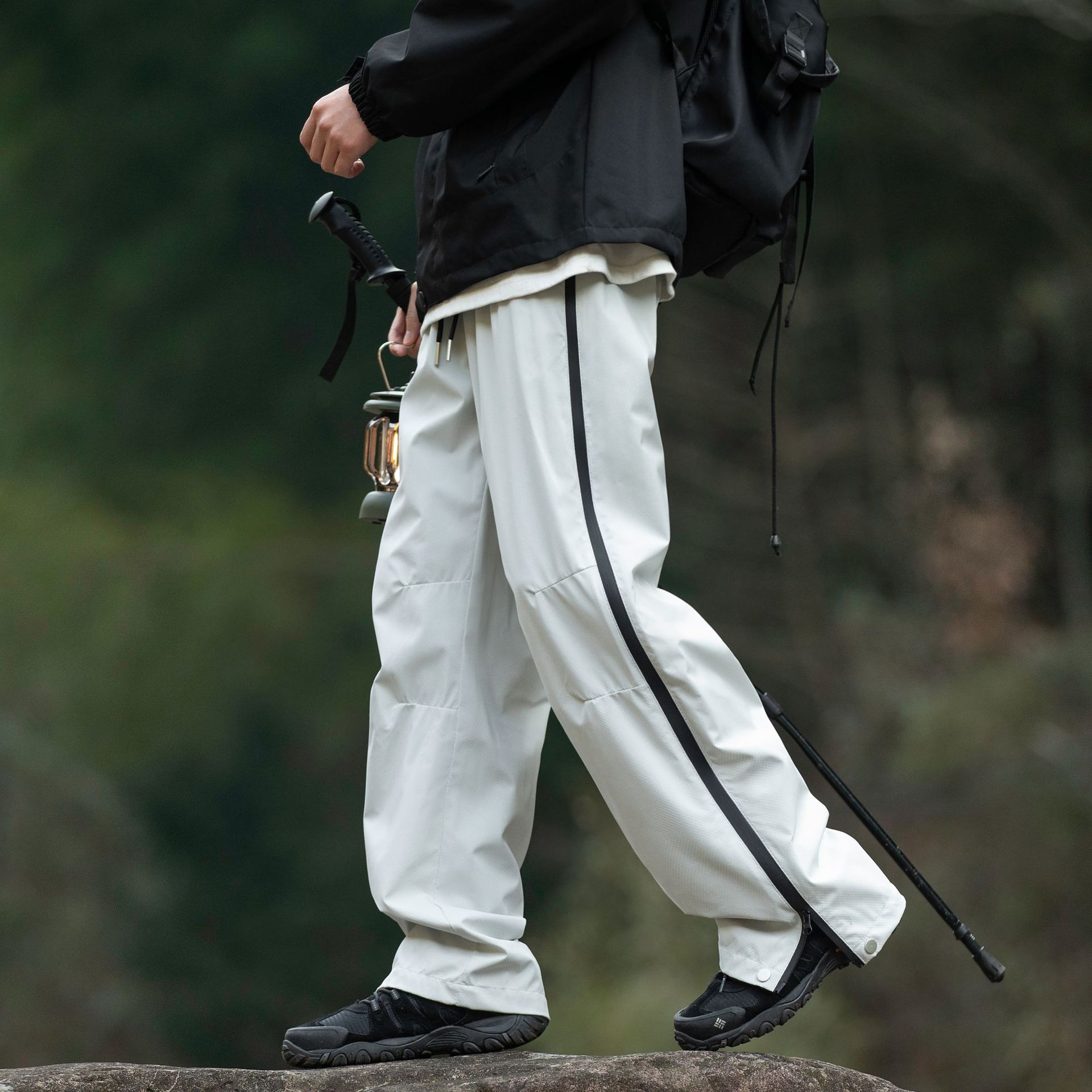 워터프루프 원단의 아웃도어 스트레이트 지퍼 팬츠입니다.