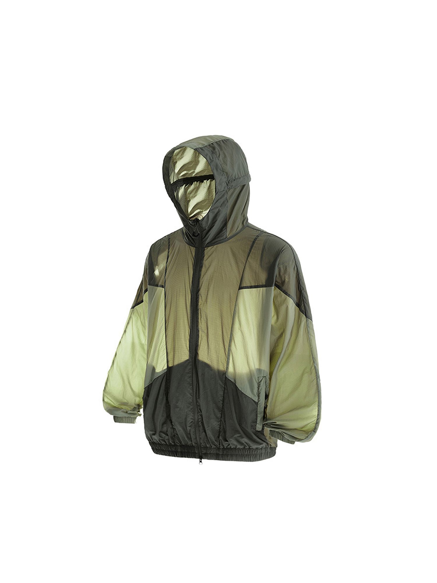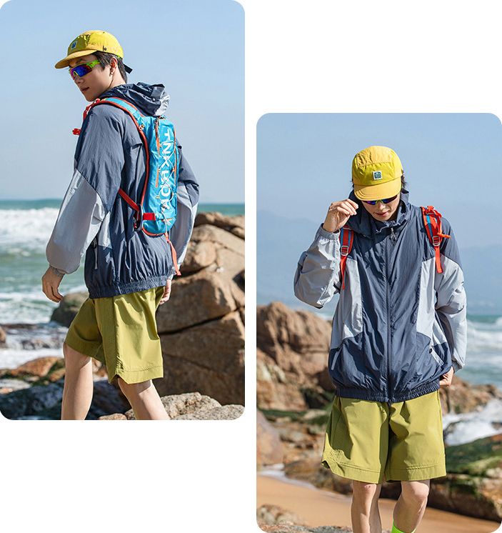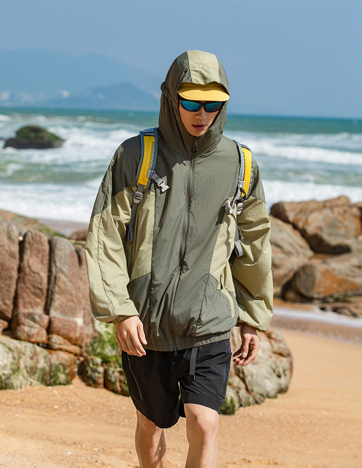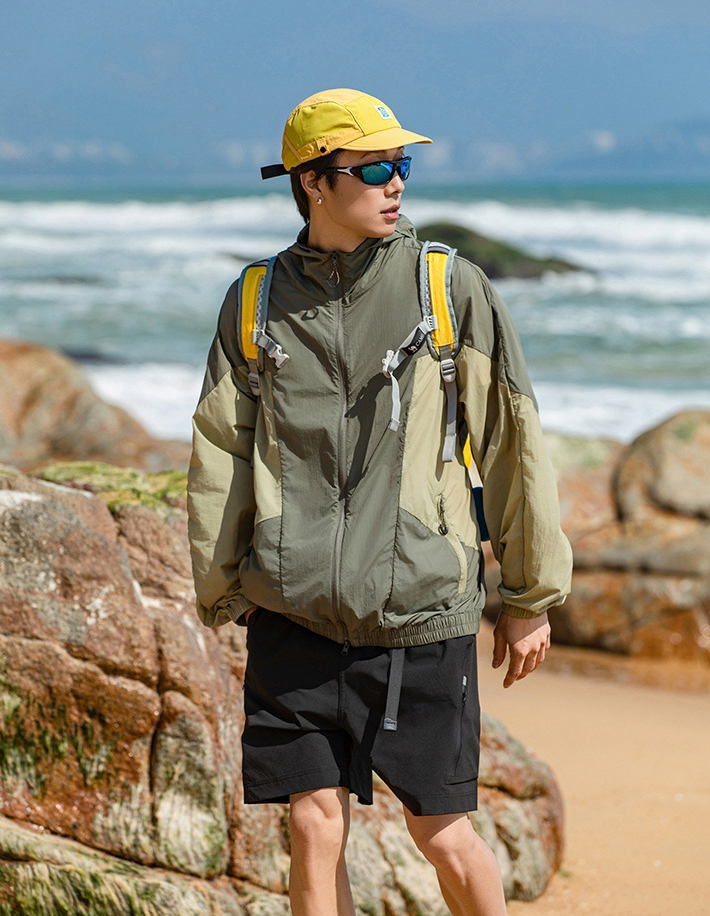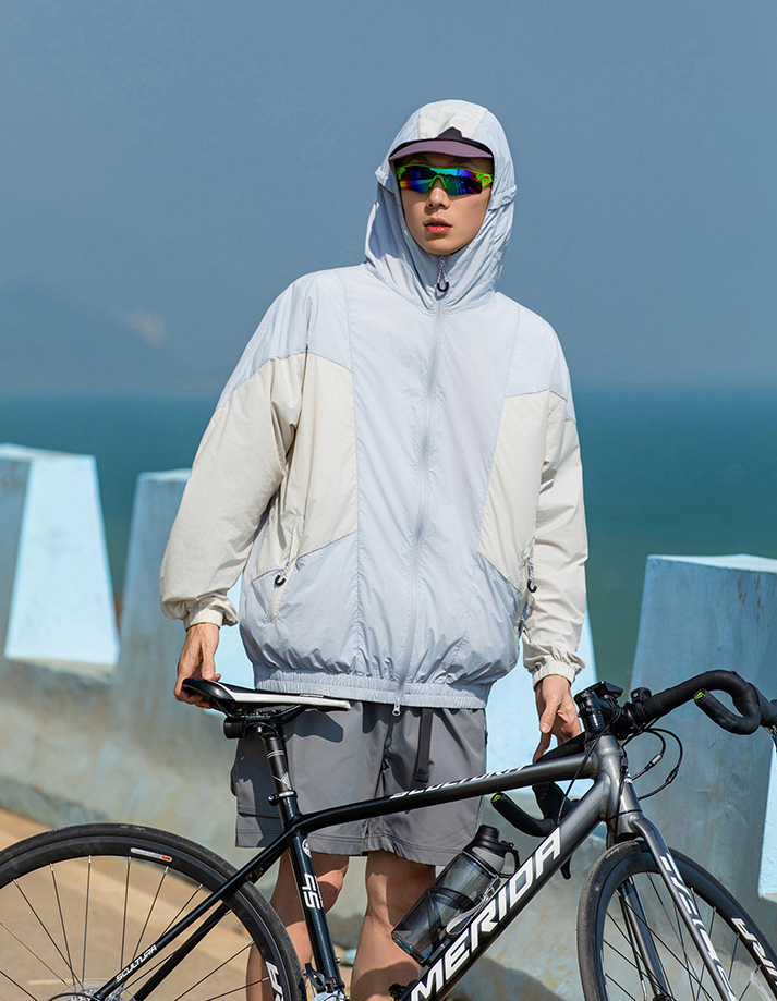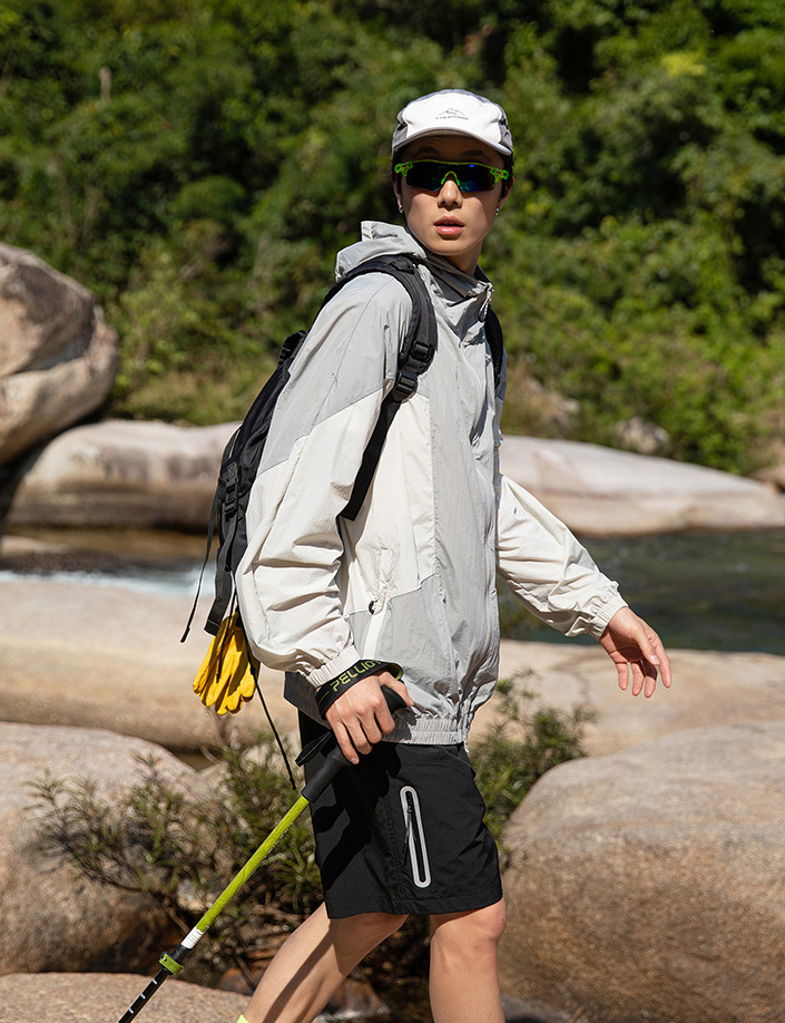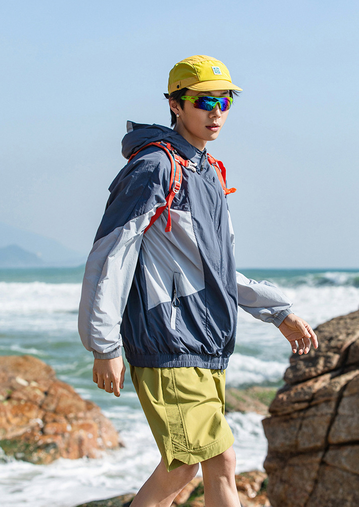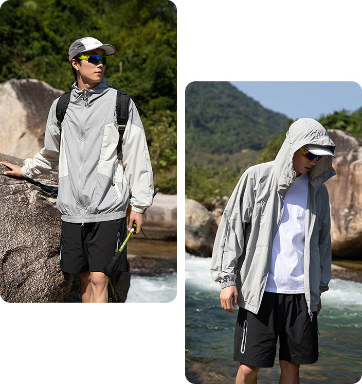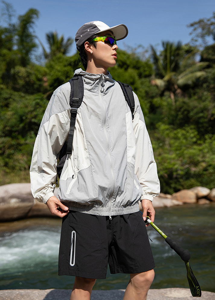 가벼운 소재의 자외선 차단 기능이 있는 후드 윈드브레이커입니다.