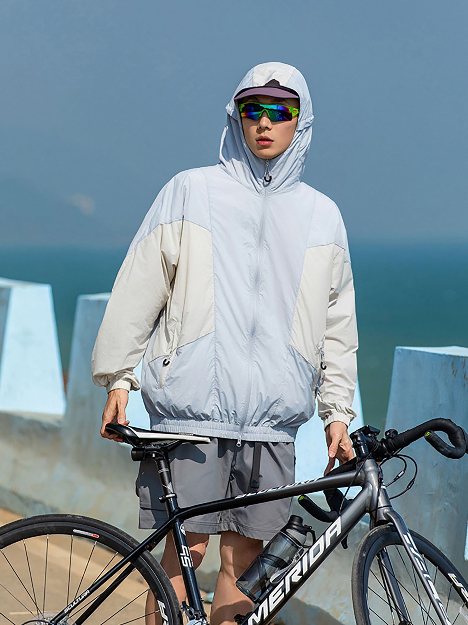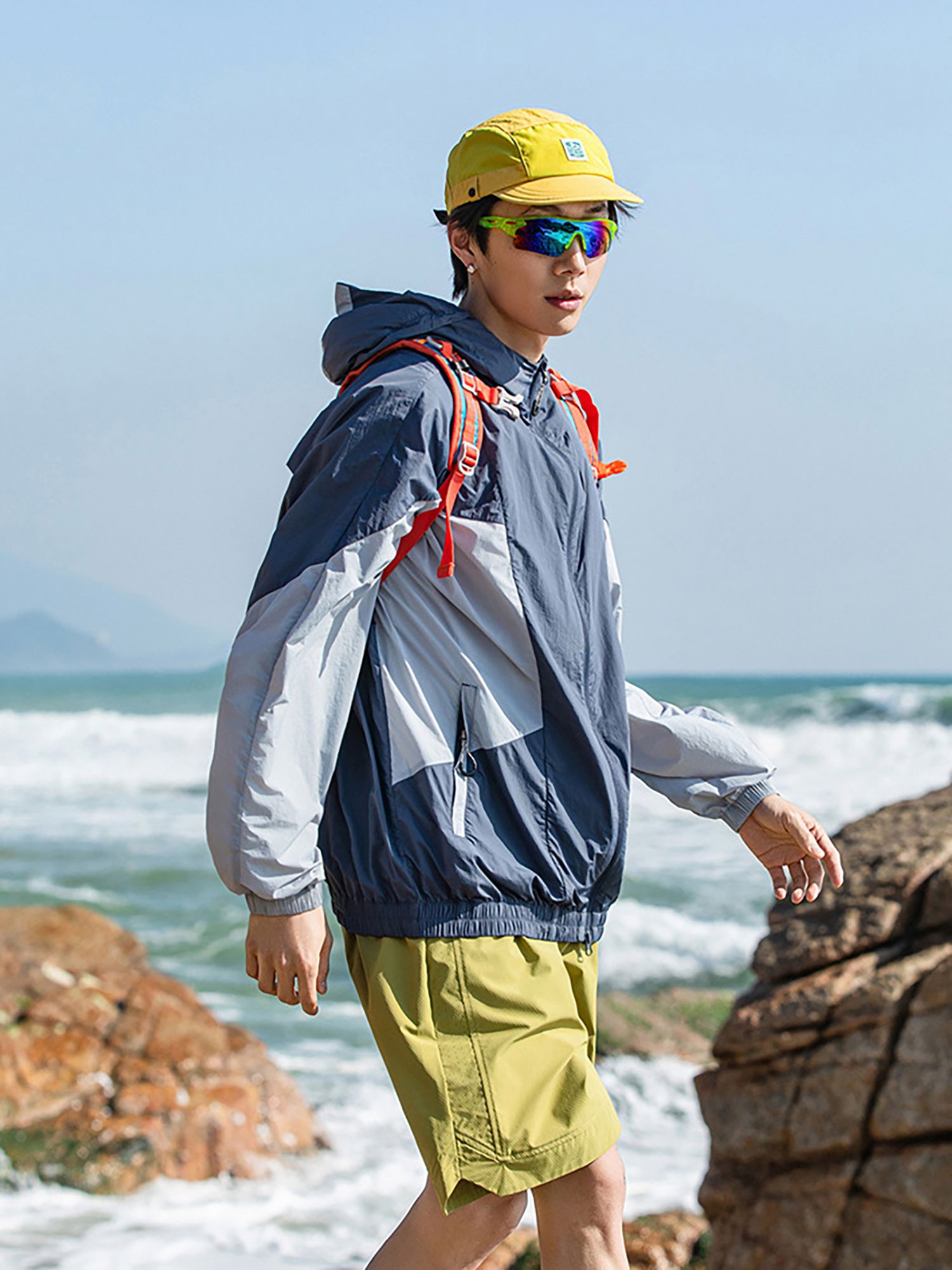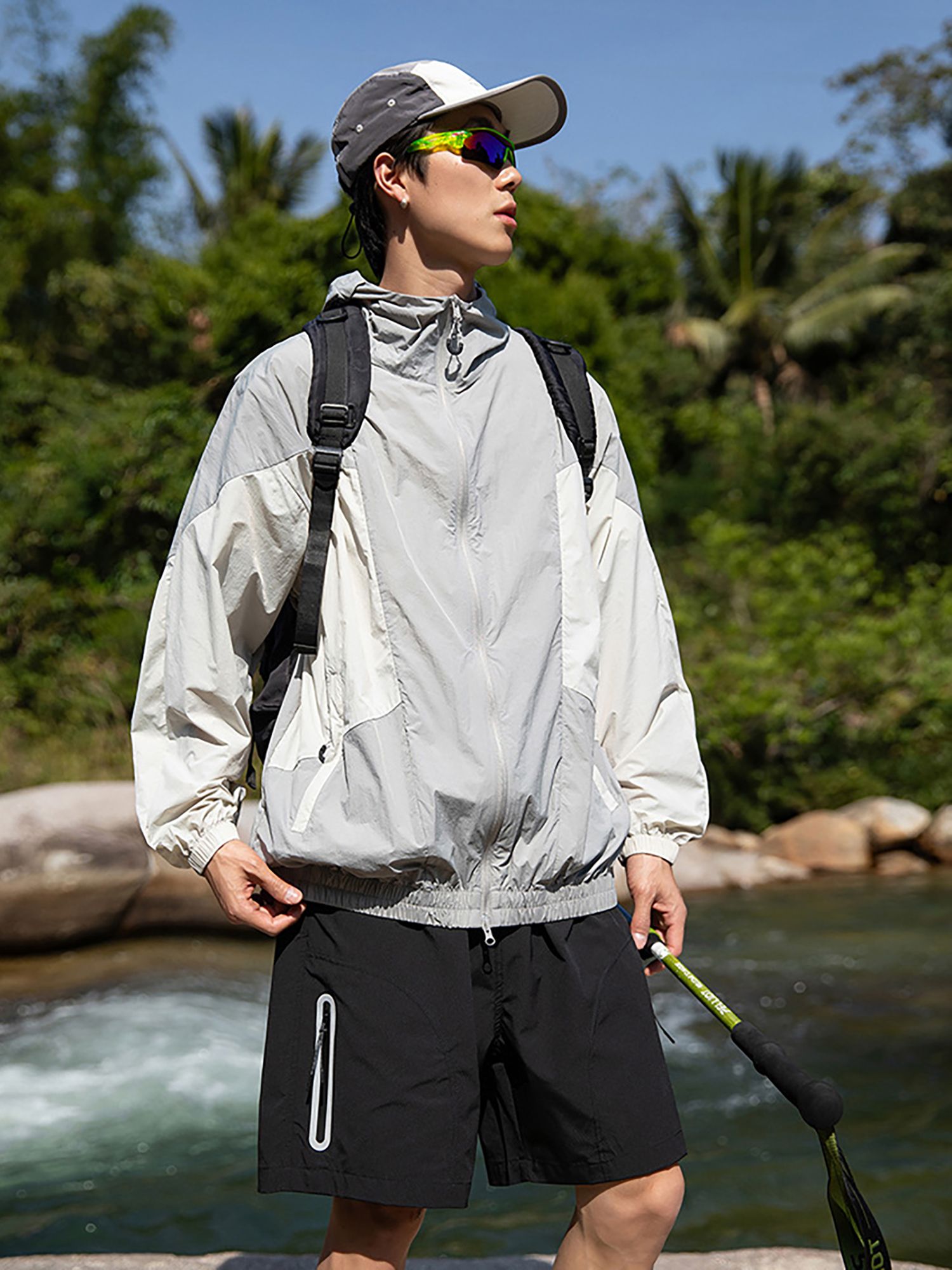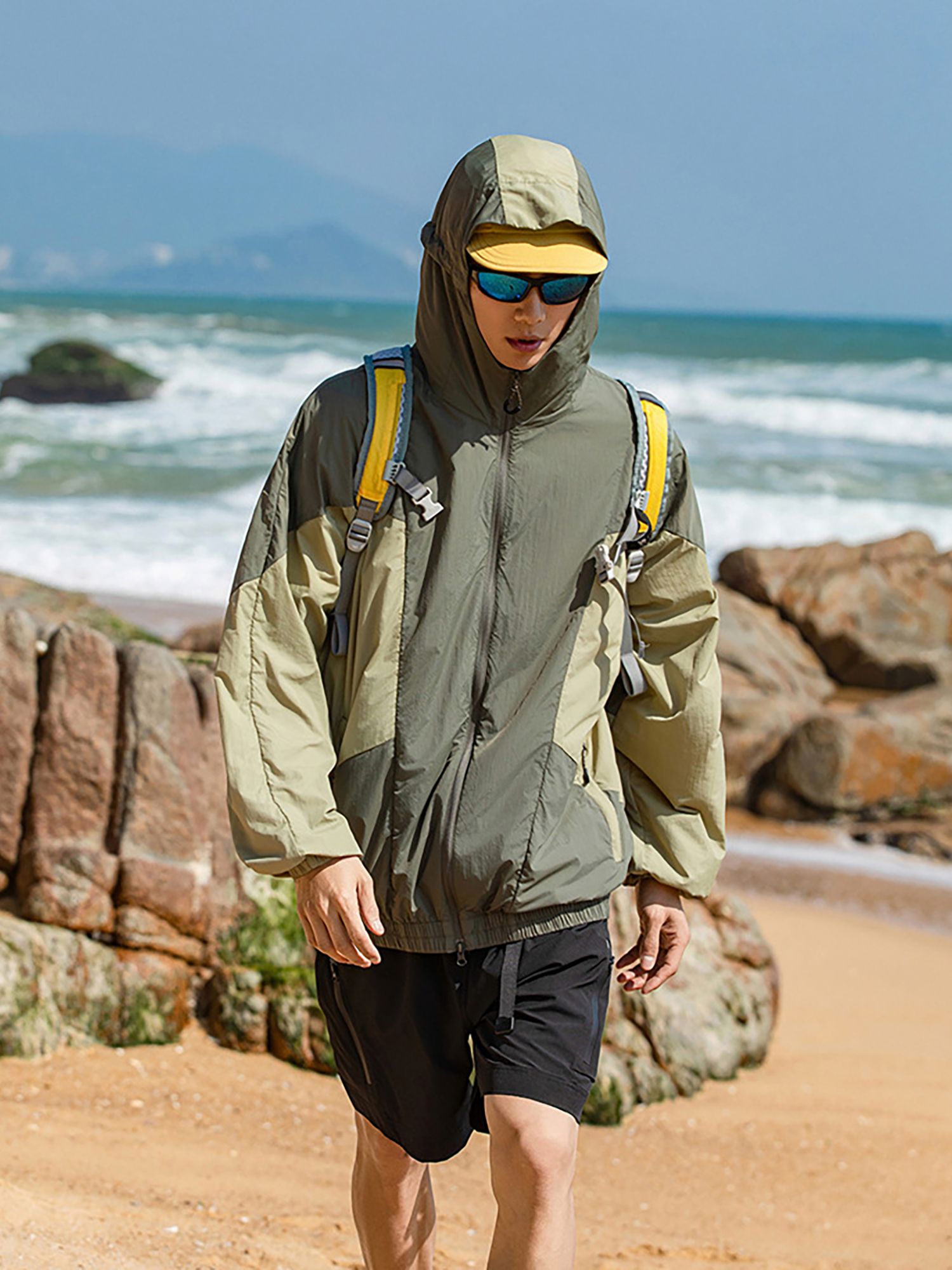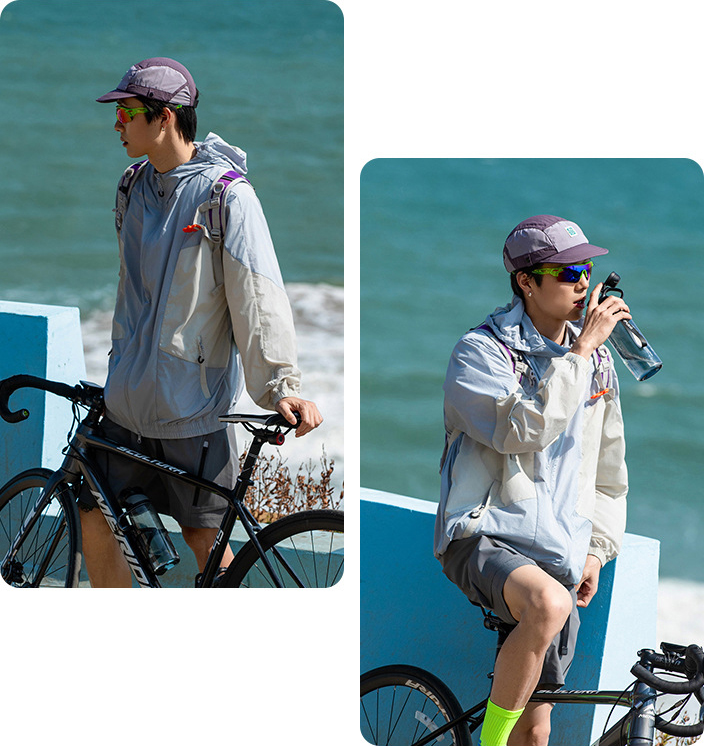 가벼운 소재의 자외선 차단 기능이 있는 후드 윈드브레이커입니다.