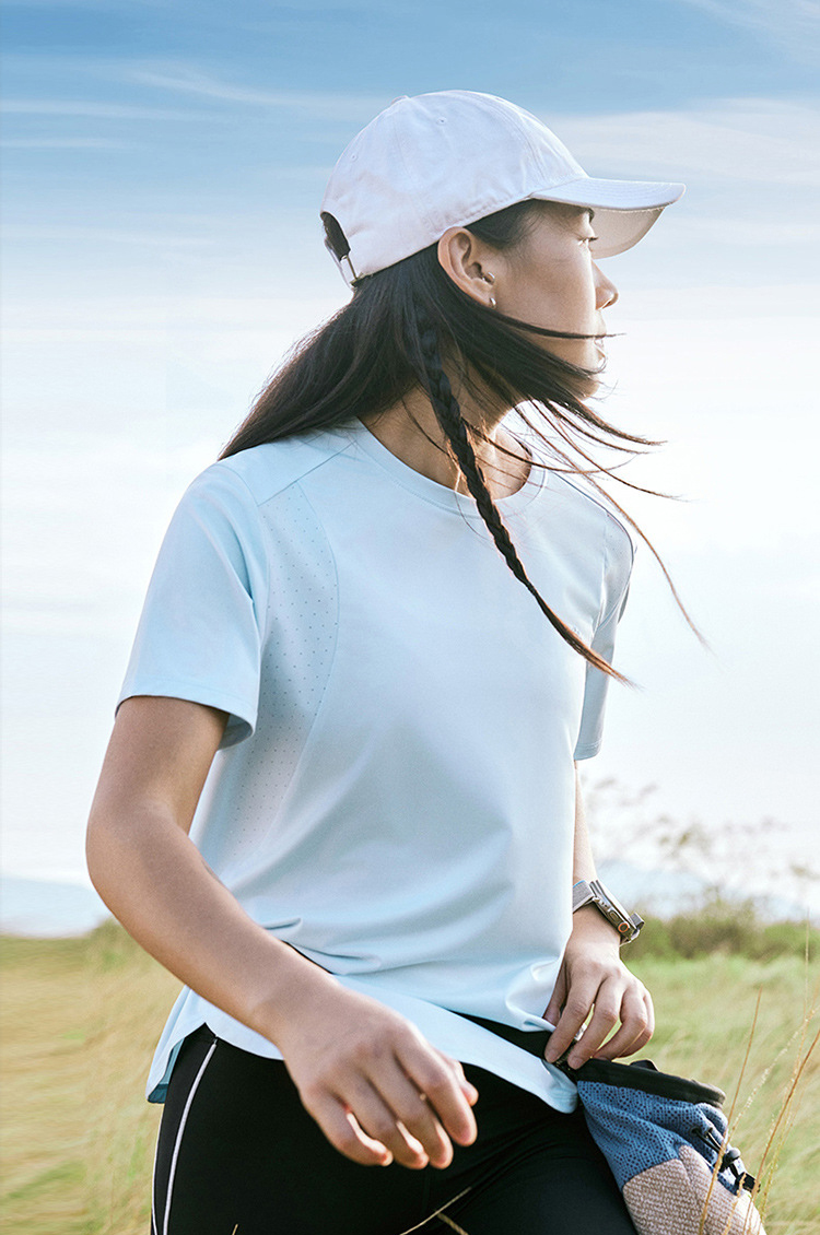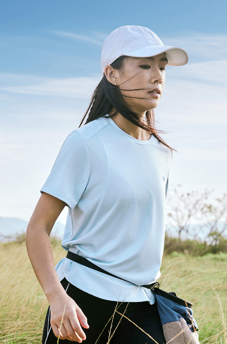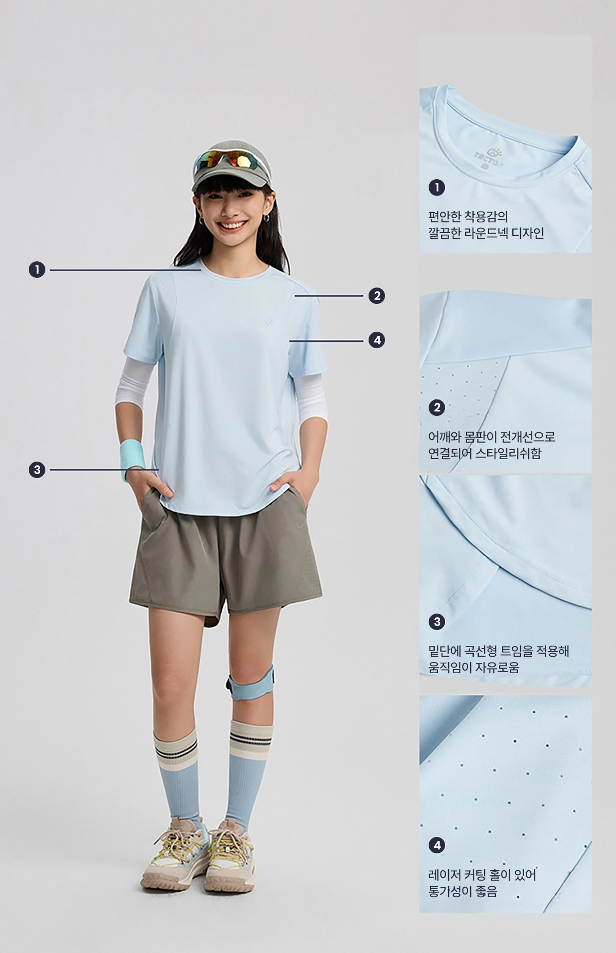 땀 흡수 및 속건 기능이 우수하여 여름철 러닝, 하이킹, 트레킹에 적합한 티셔츠입니다.
