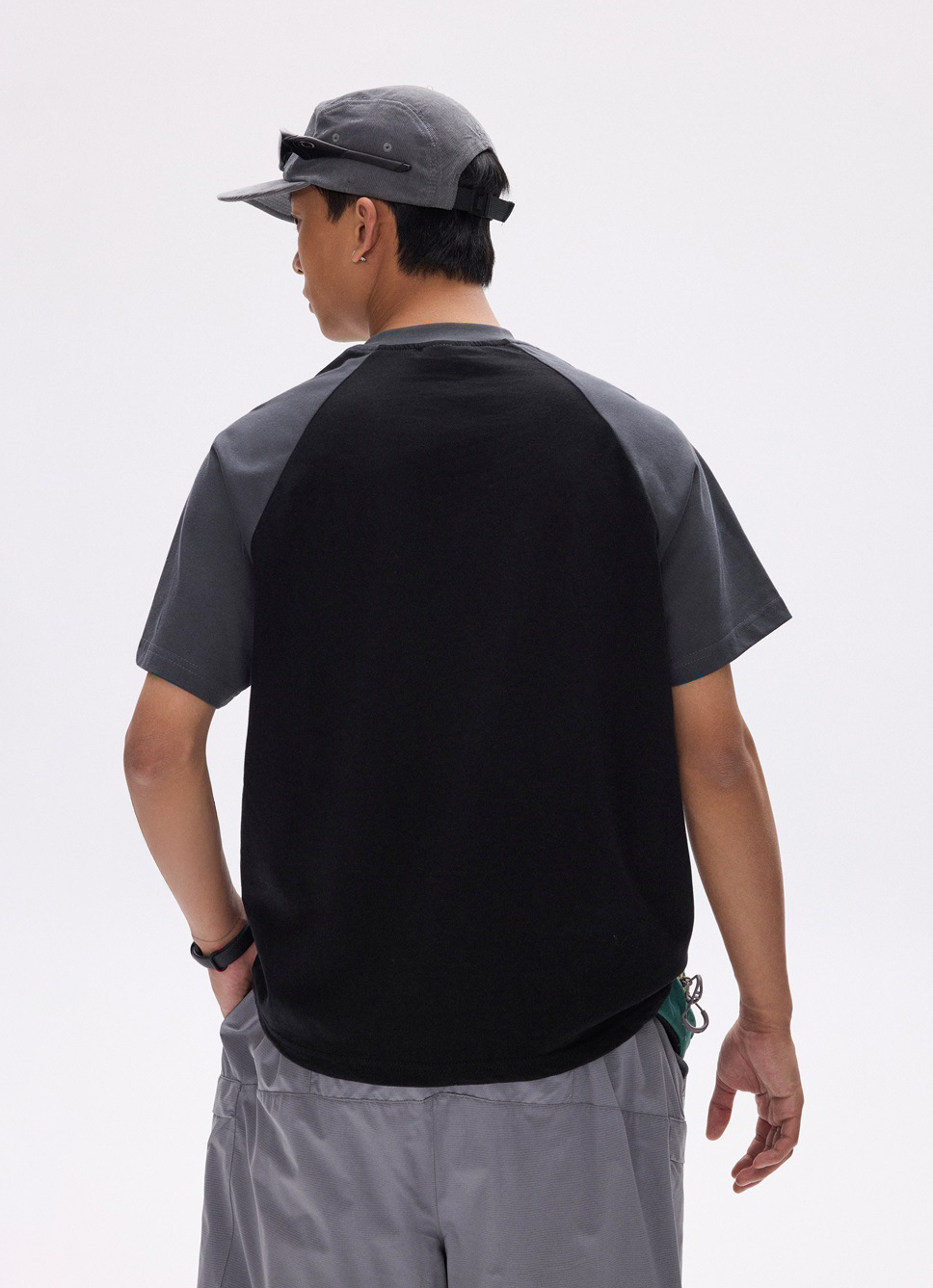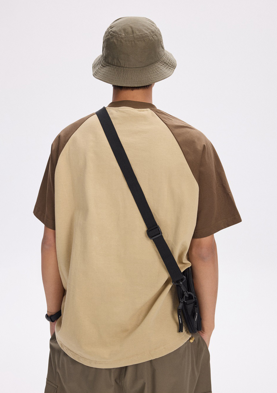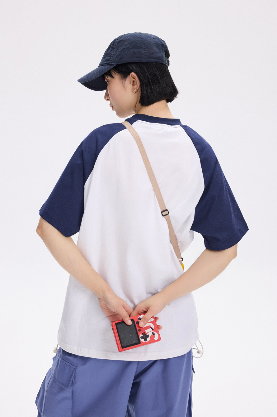 데일리 아웃도어 스타일의 유니섹스 래글런 티셔츠입니다.
