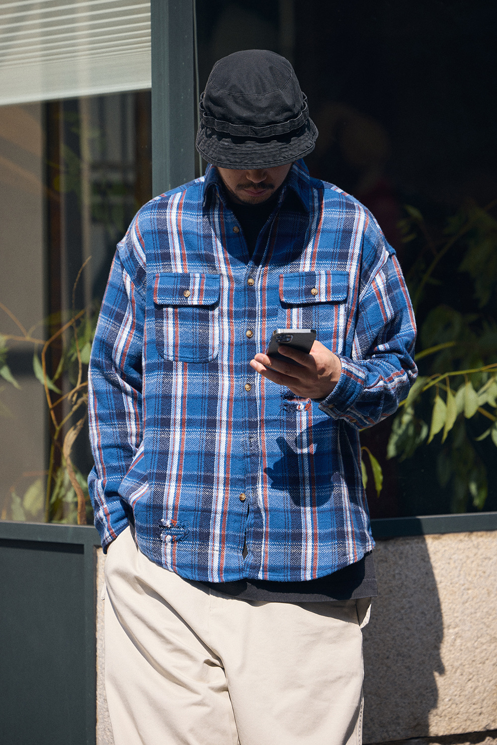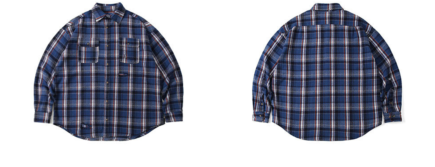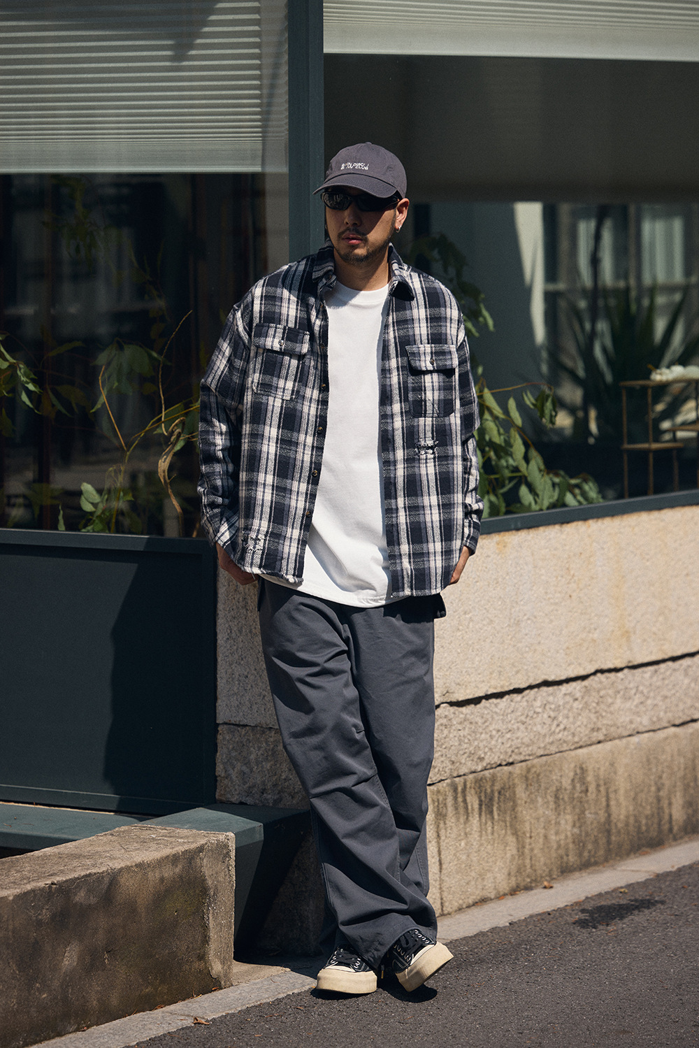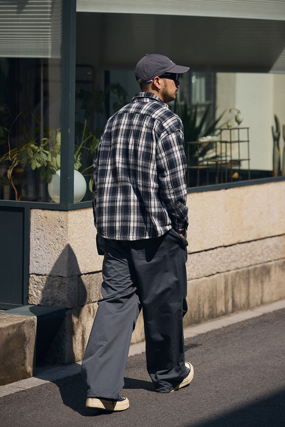 클래식한 체크 패턴과 넉넉한 오버사이즈 핏의 워크셔츠입니다.