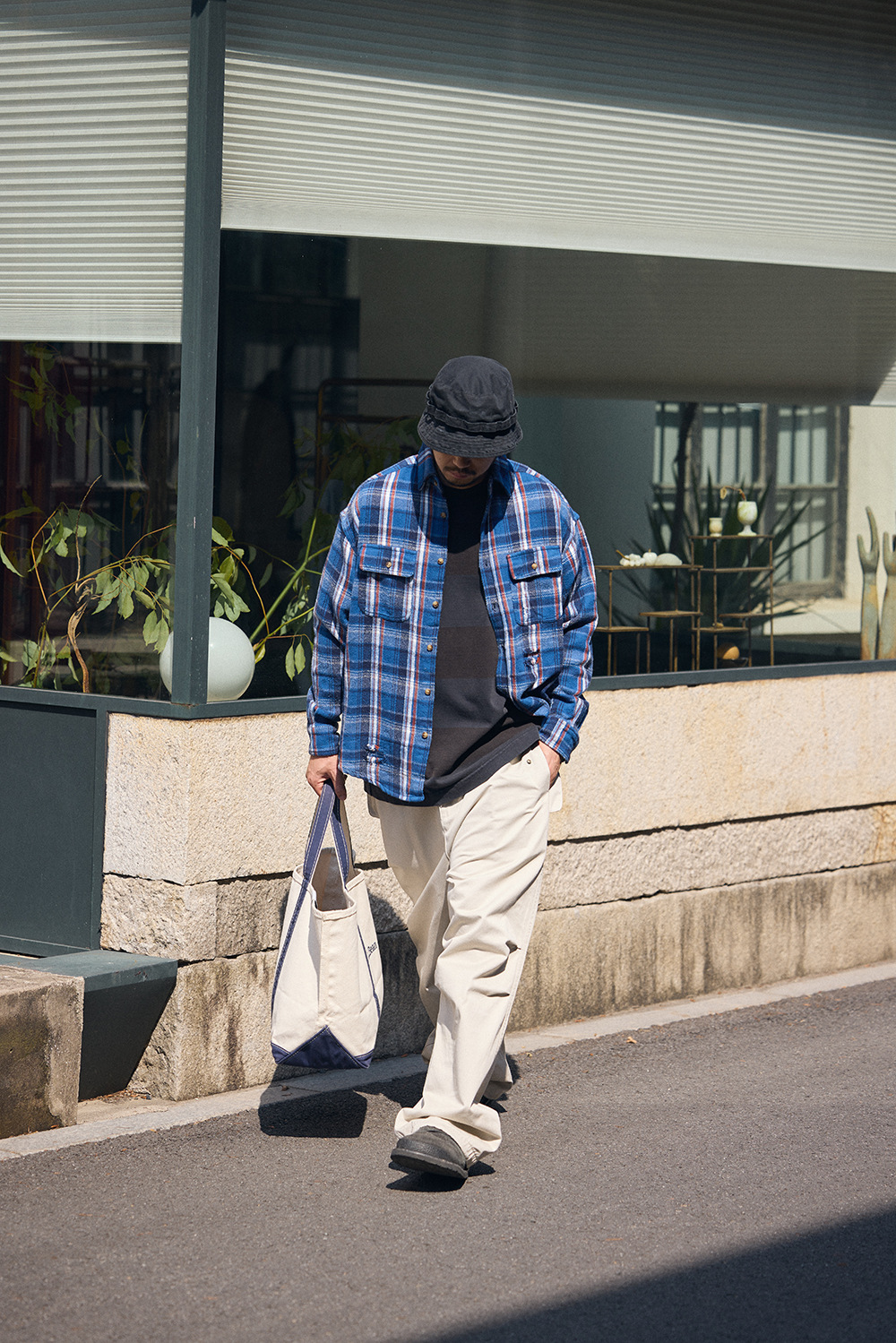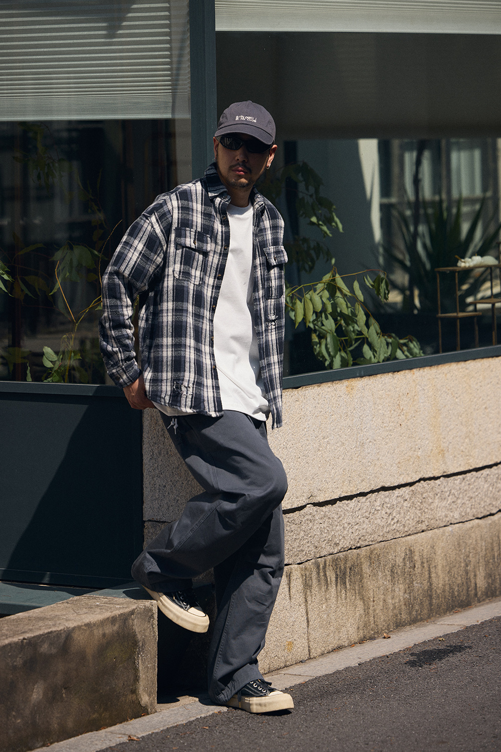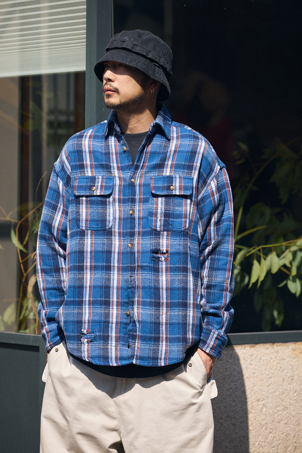 클래식한 체크 패턴과 넉넉한 오버사이즈 핏의 워크셔츠입니다.