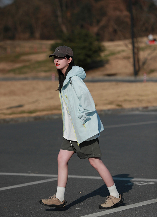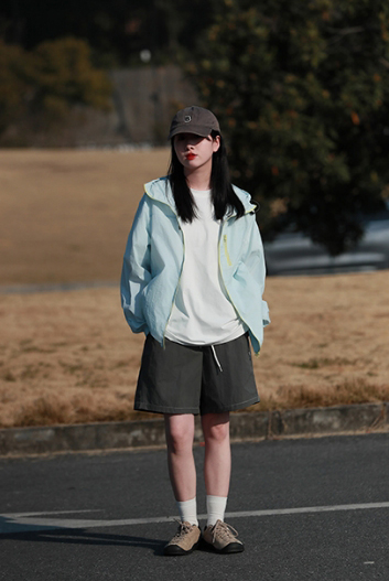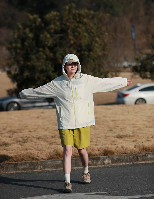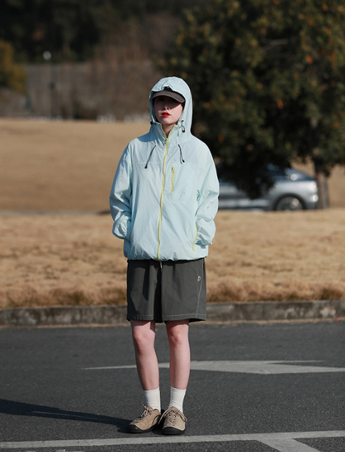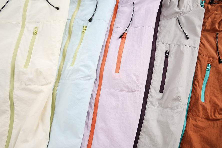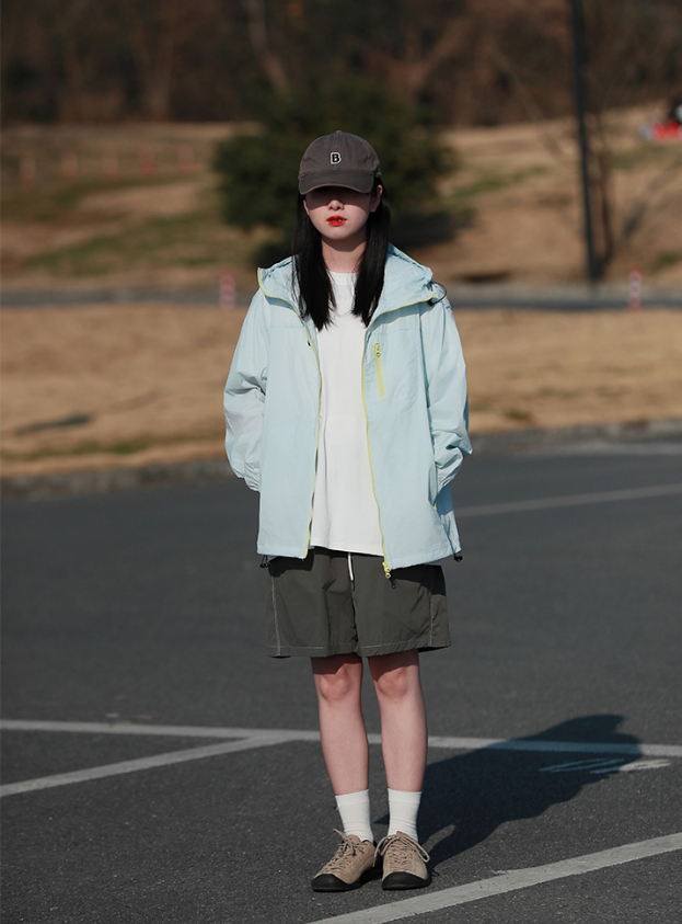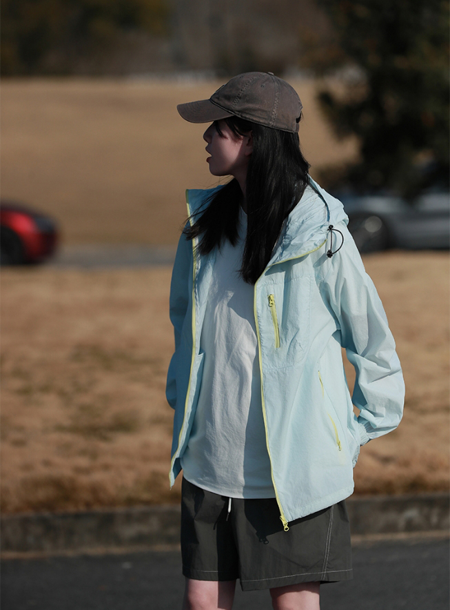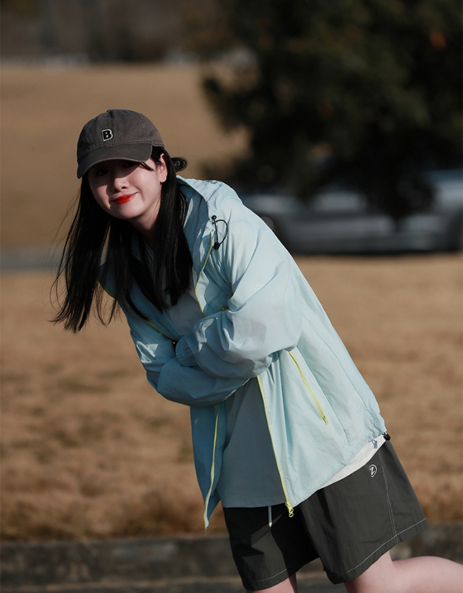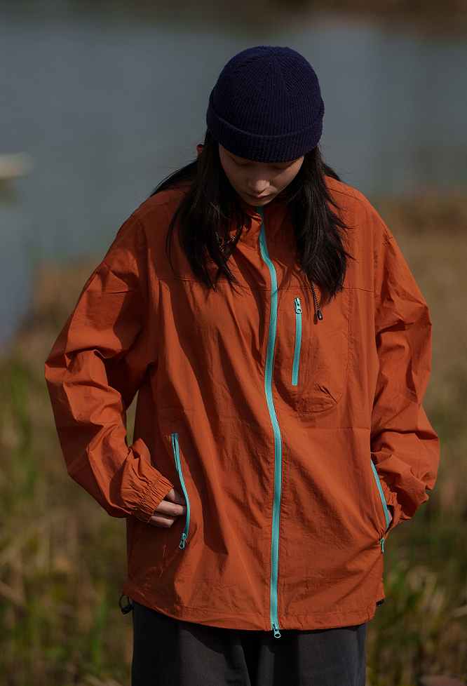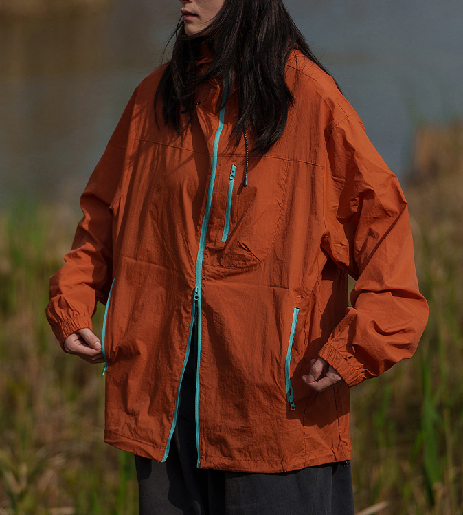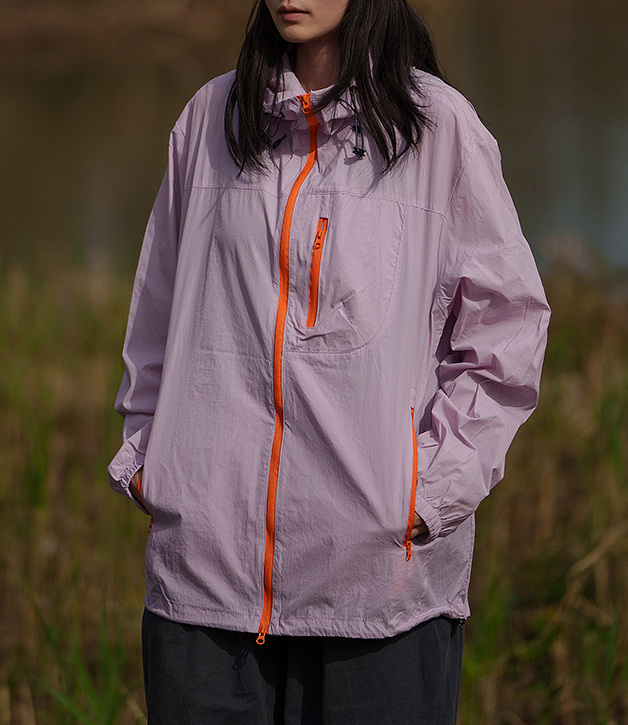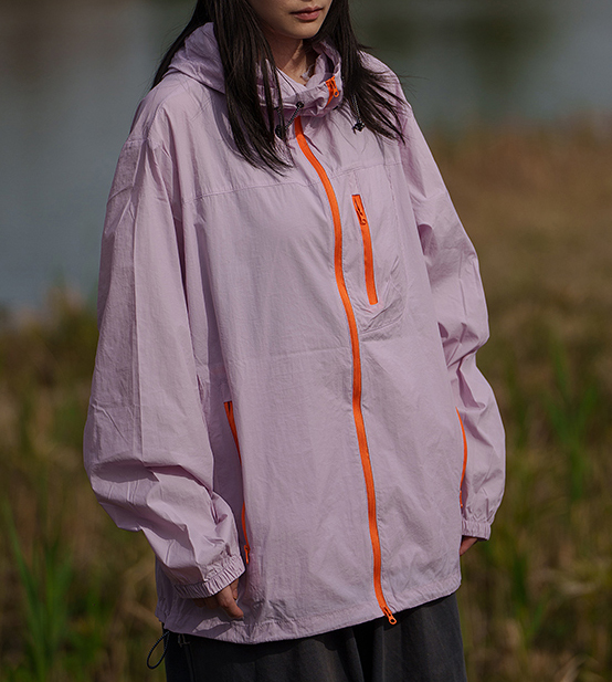 간절기 일상 속에서 가볍게 착용하기 좋은 컬러풀 후드 바람막이 자켓입니다.