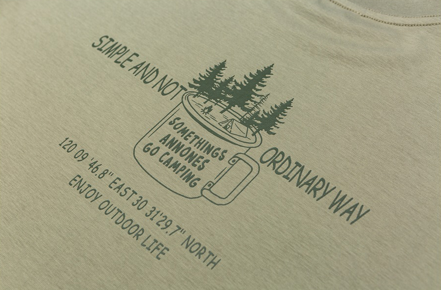 - 캠핑 머그와 나무 일러스트로 아웃도어 감성의 백 프린트 디자인