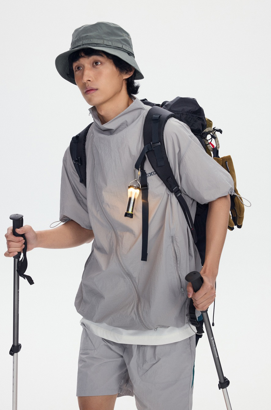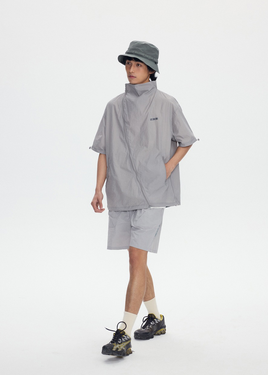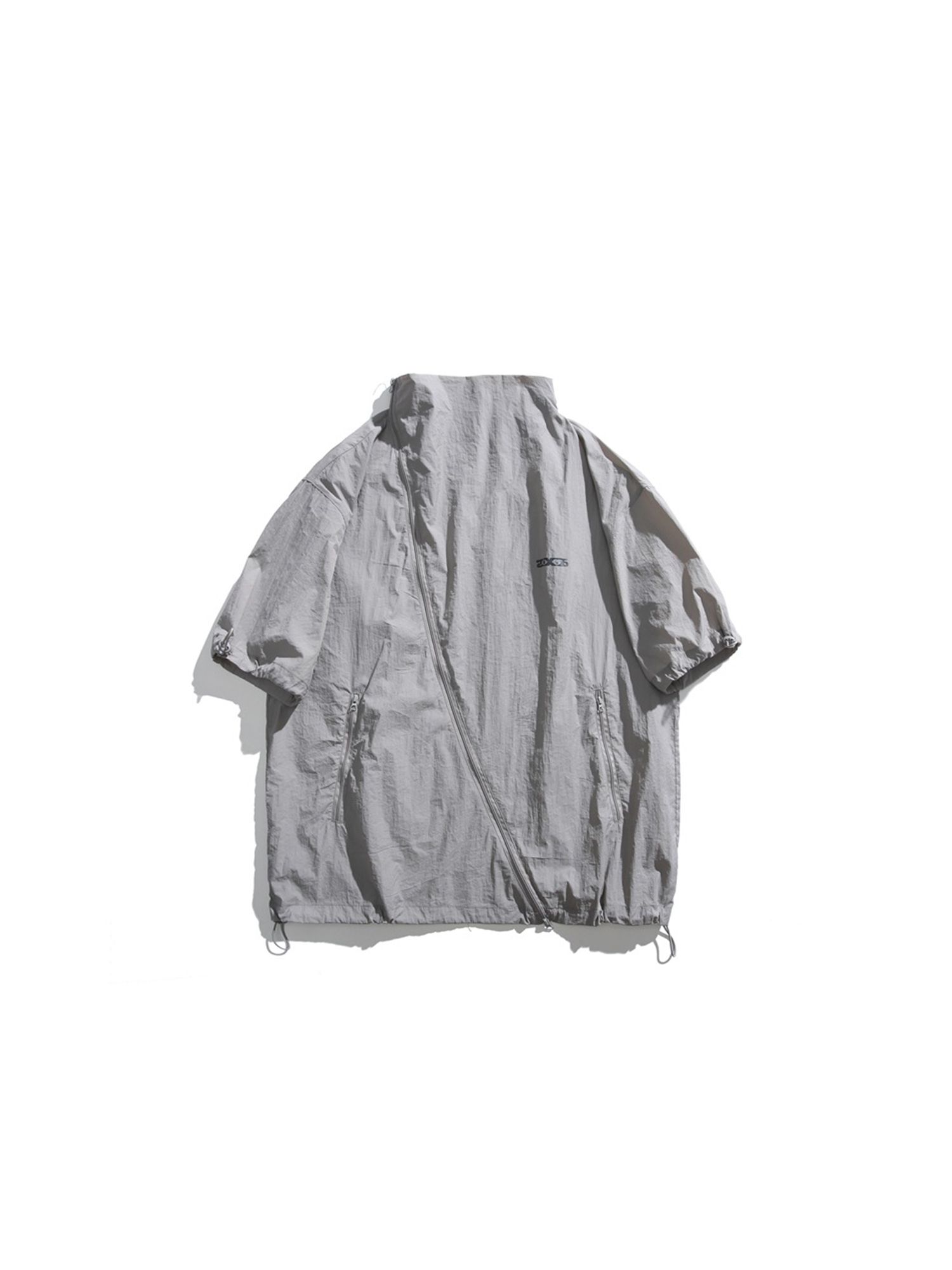 사선 지퍼 디테일과 스트링 포인트가 어우러진 루즈핏 하프슬리브 윈드 아노락입니다.
