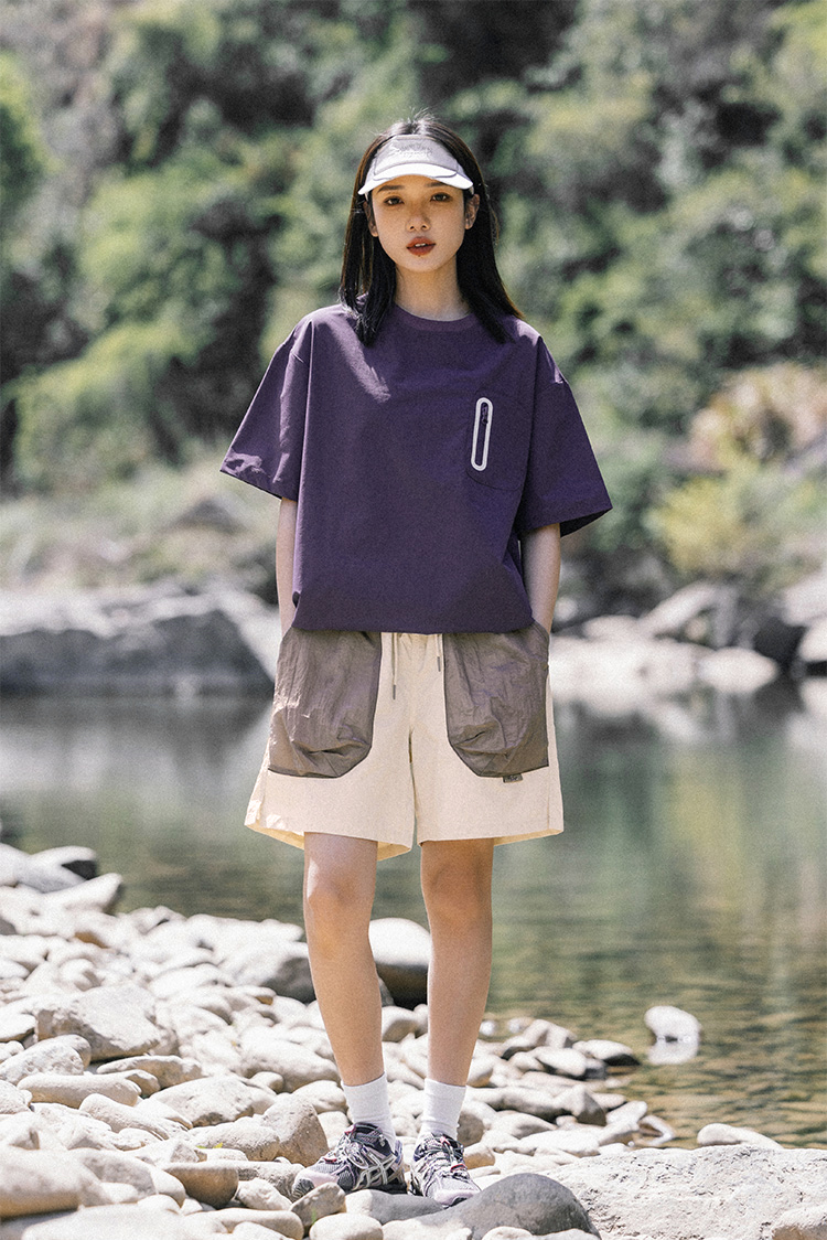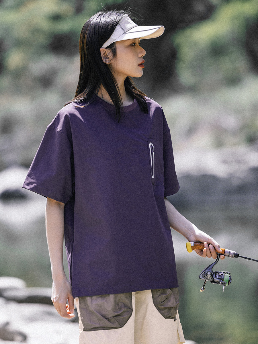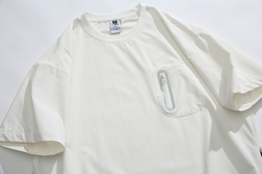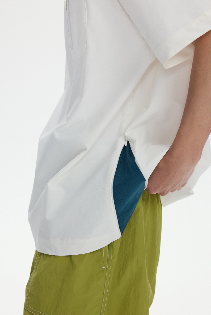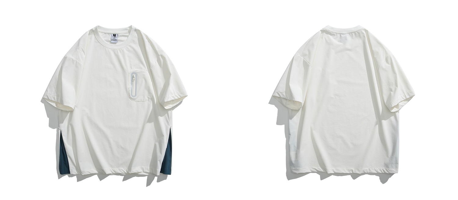 배색 포인트와 지퍼 포켓 디테일이 돋보이는 오버핏 반팔 티셔츠입니다.