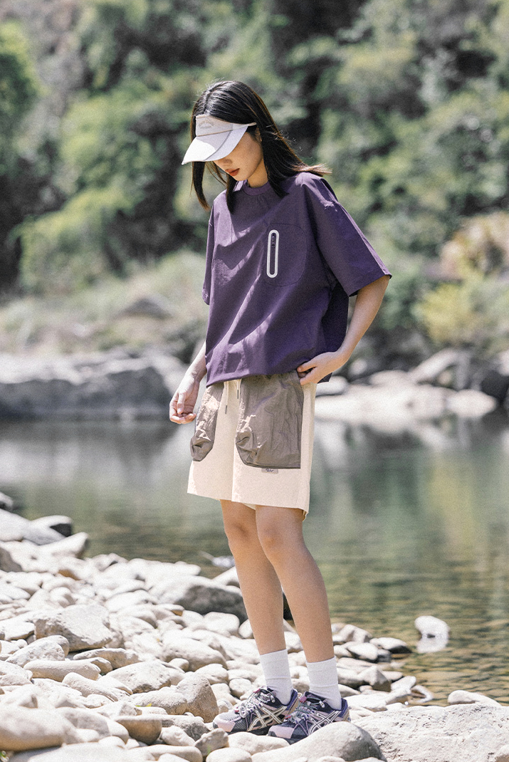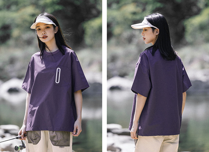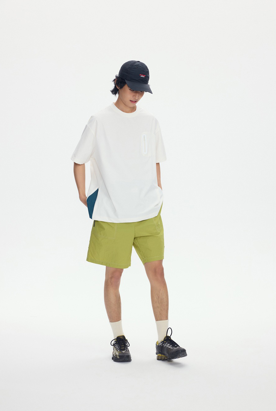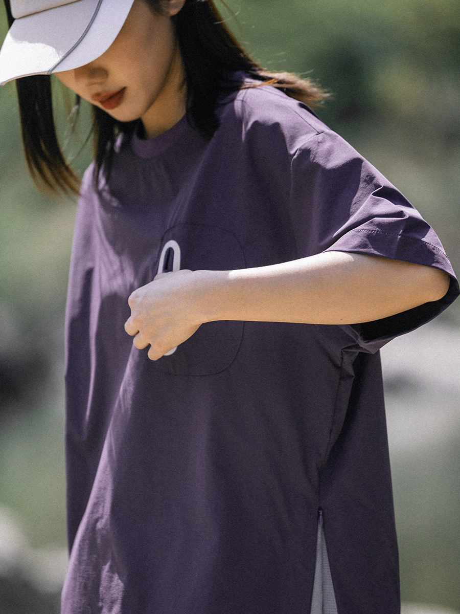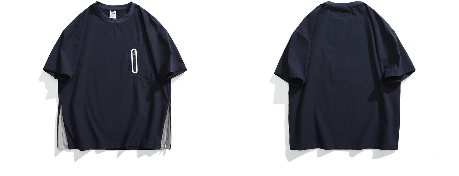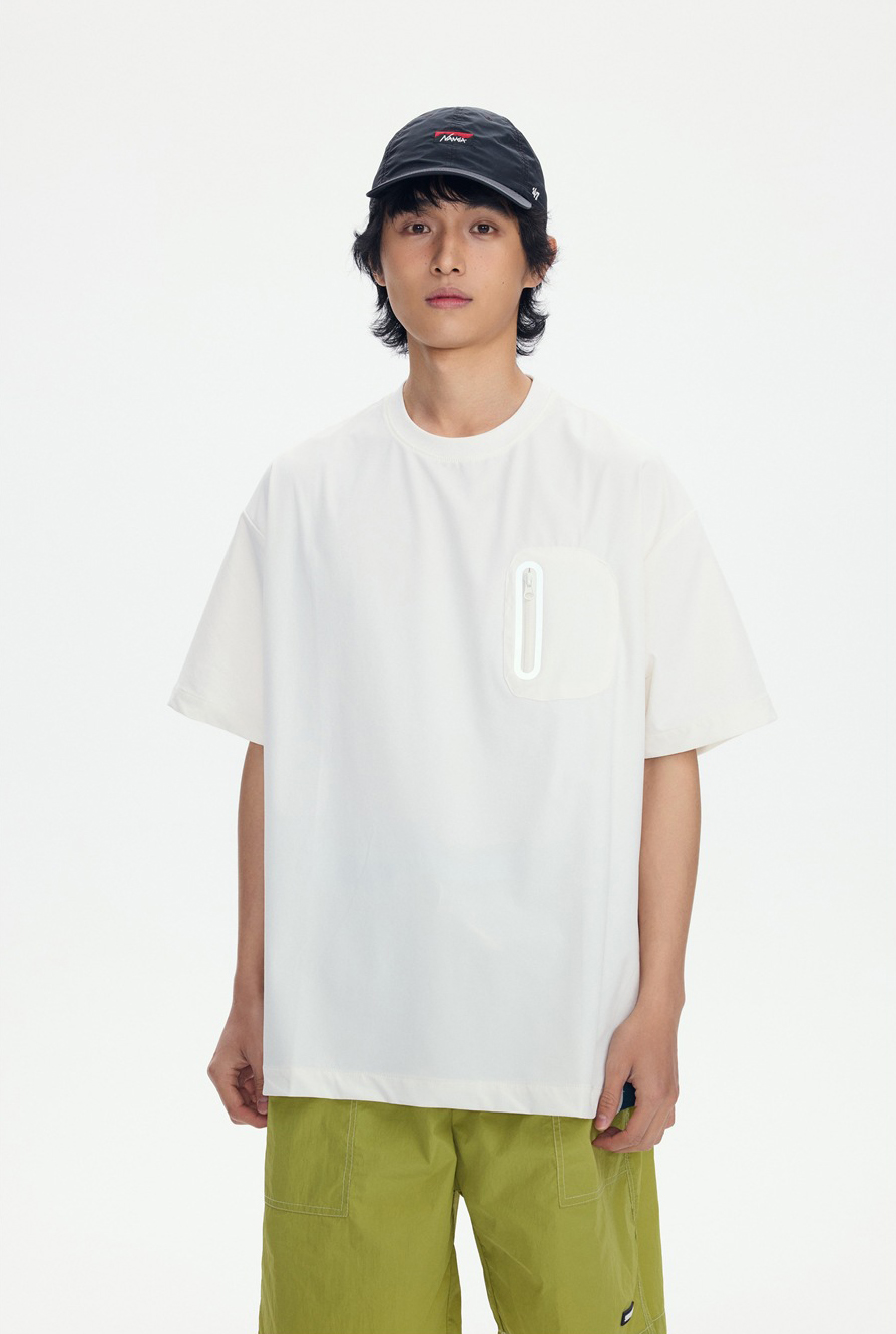 배색 포인트와 지퍼 포켓 디테일이 돋보이는 오버핏 반팔 티셔츠입니다.