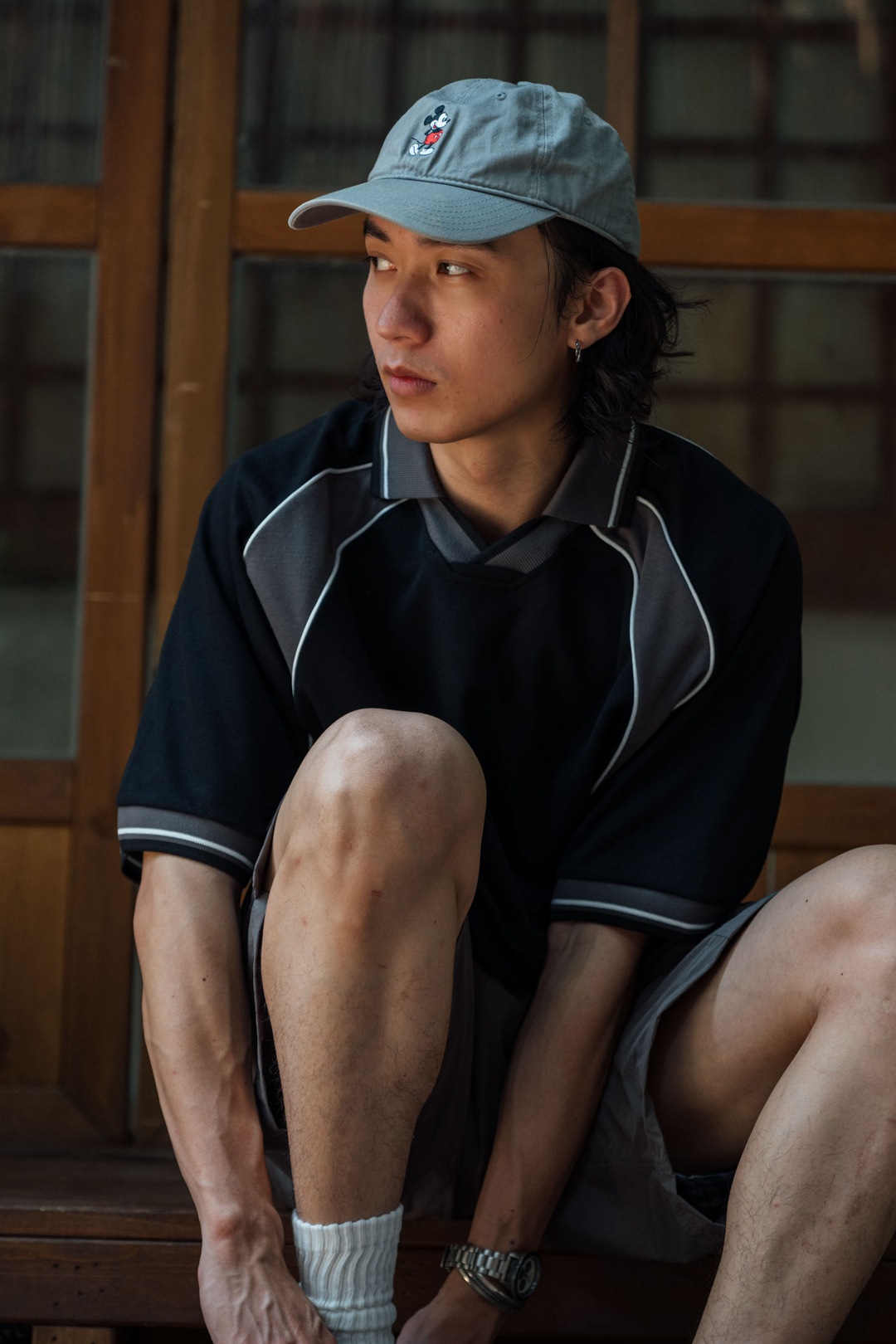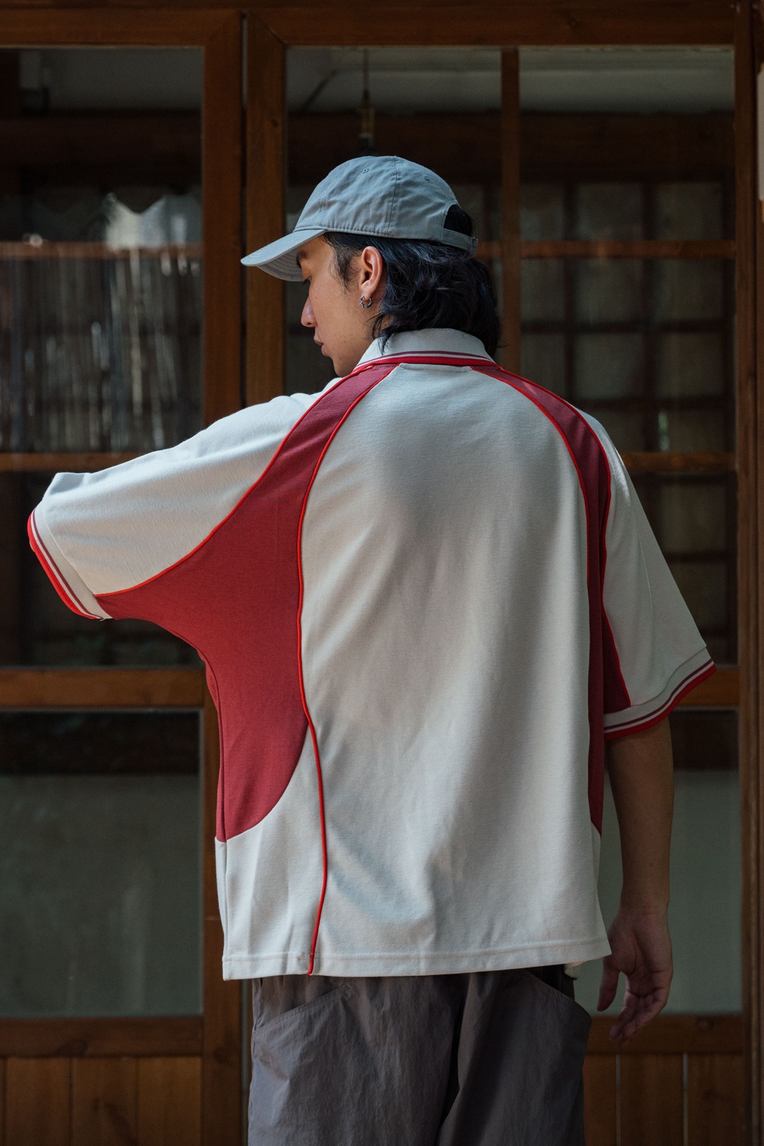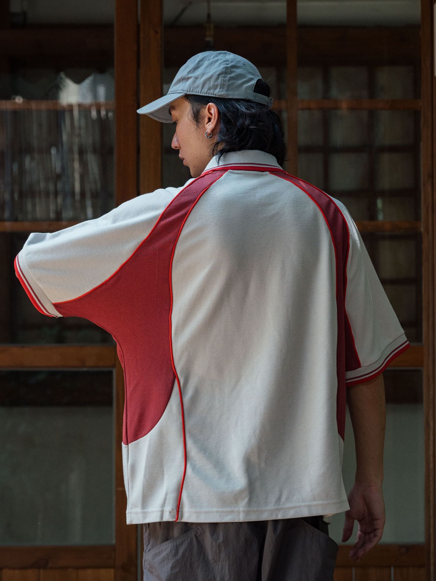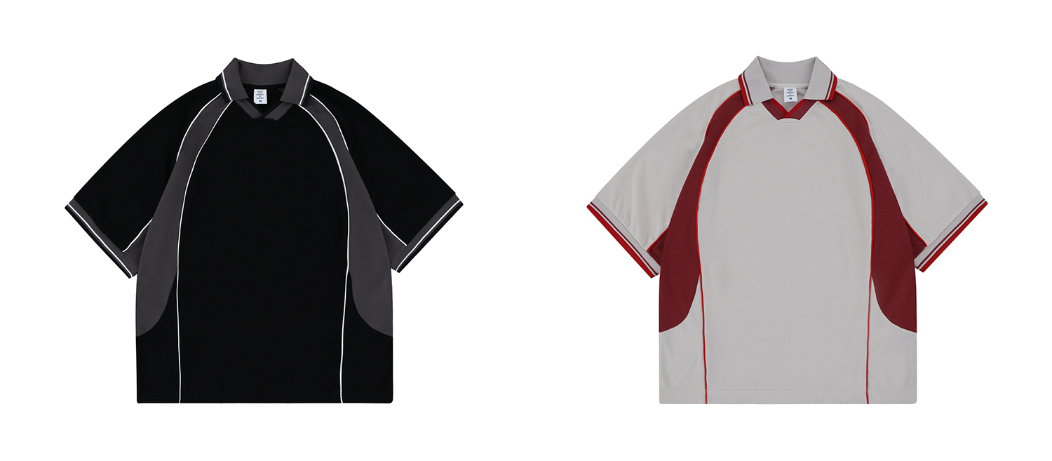 스포티한 배색 라인과 시원한 기능성 소재가 돋보이는 반오픈 칼라 티셔츠입니다.