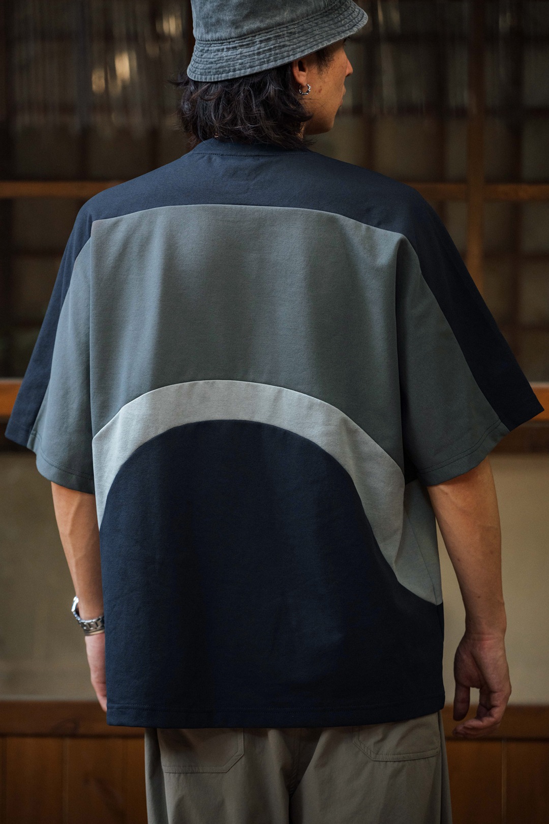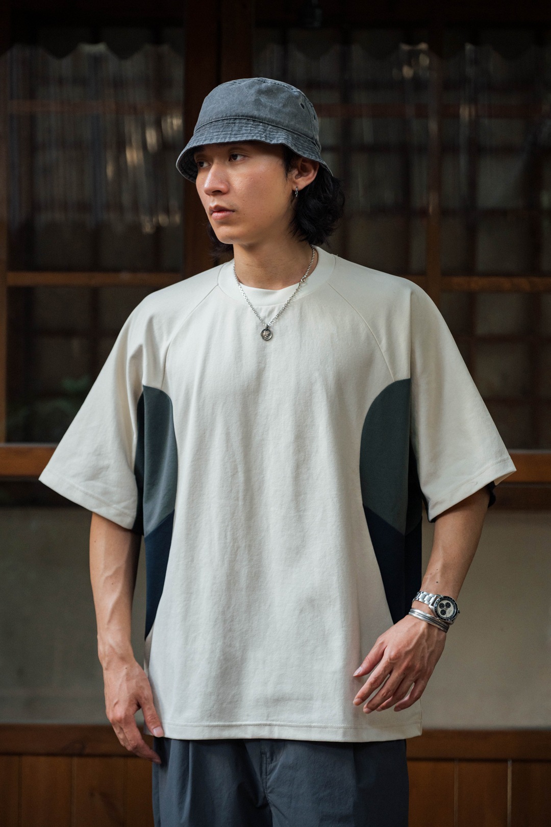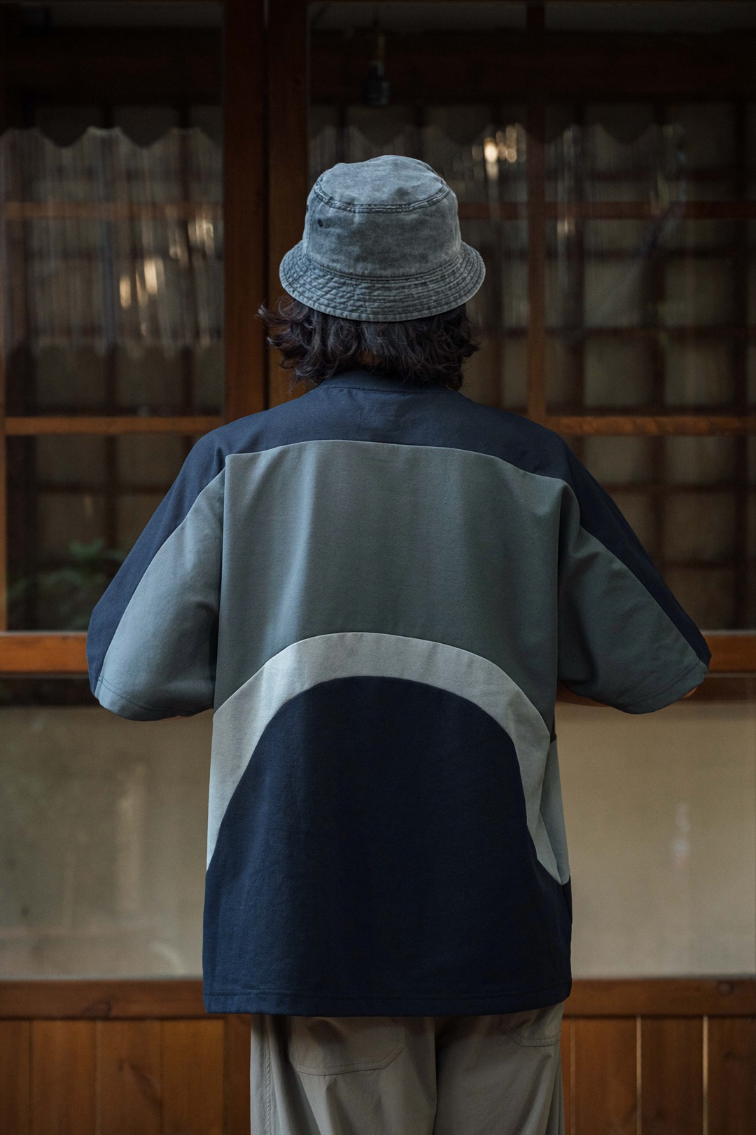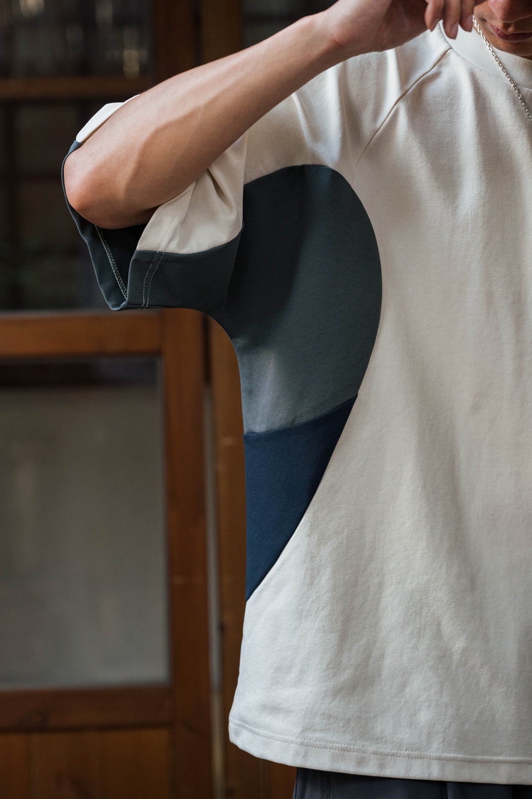 입체적인 컬러 블록으로 감각적인 포인트를 더한 배색 반팔 티셔츠입니다.