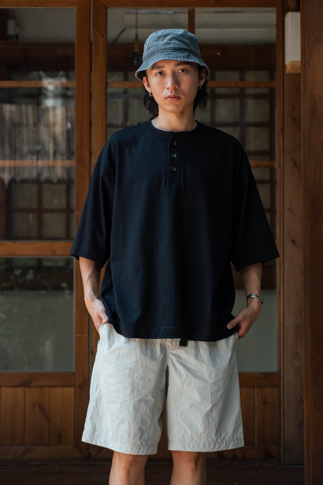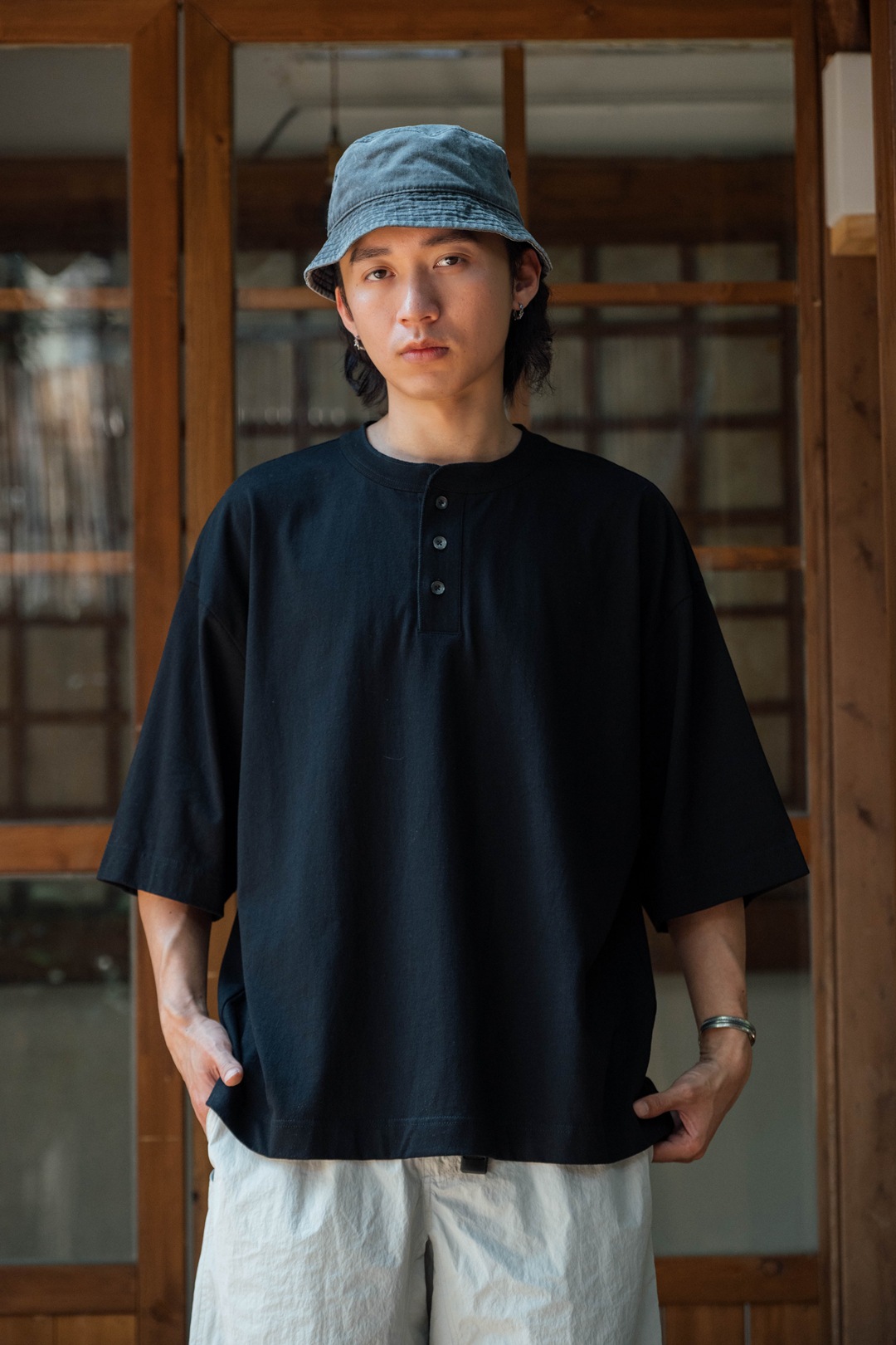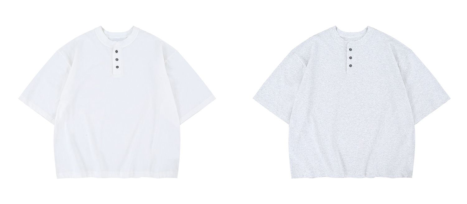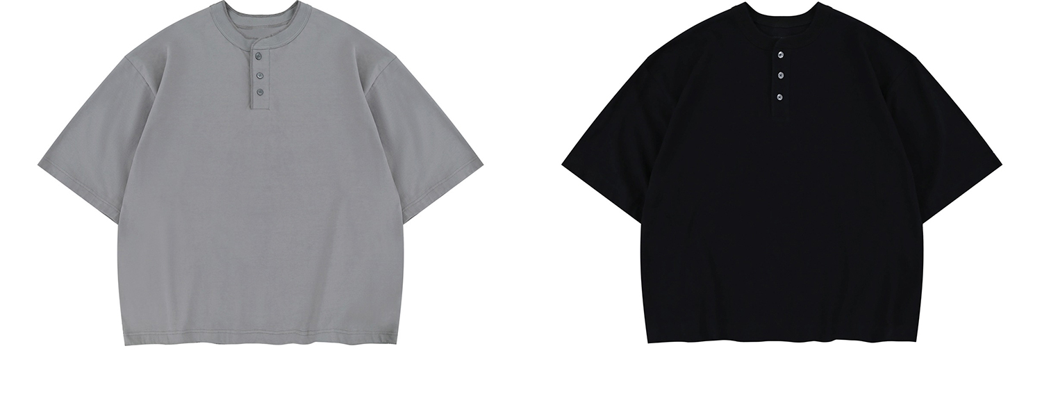 깔끔한 헨리넥 버튼 디테일과 여유로운 핏으로 편안하게 즐기기 좋은 반팔 티셔츠입니다.