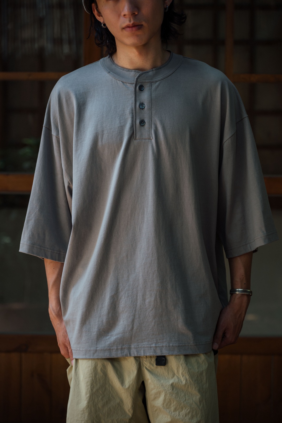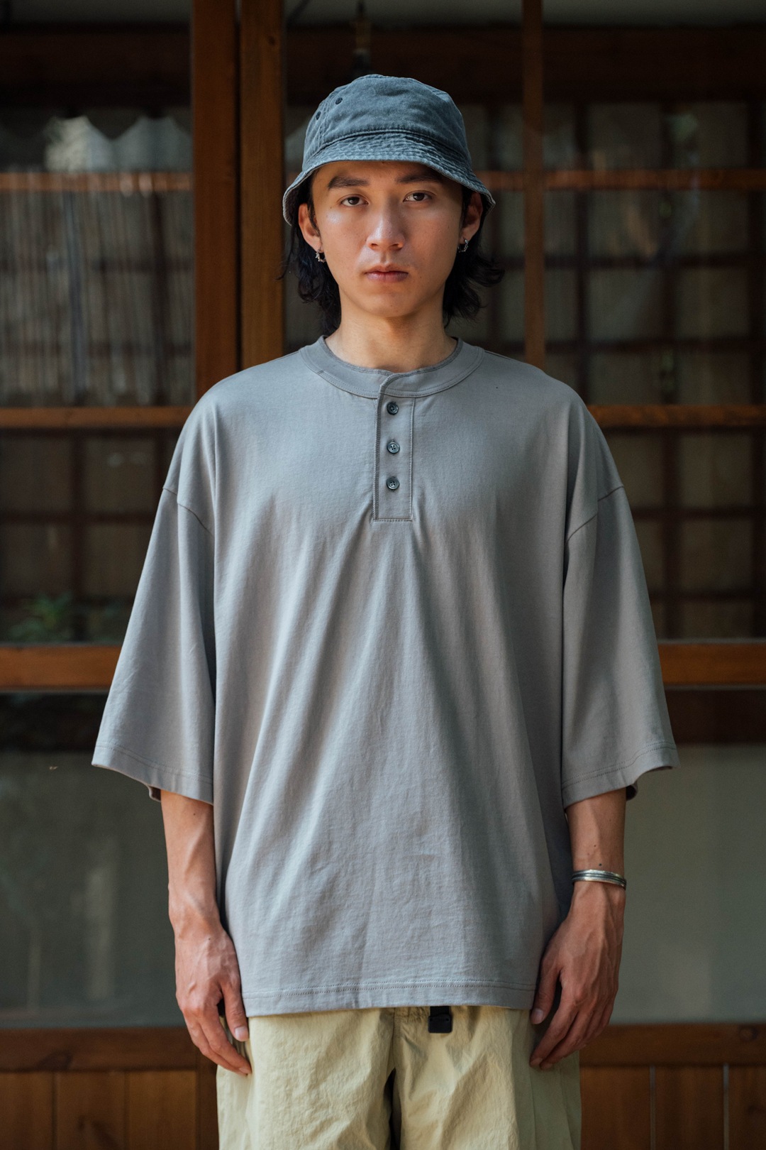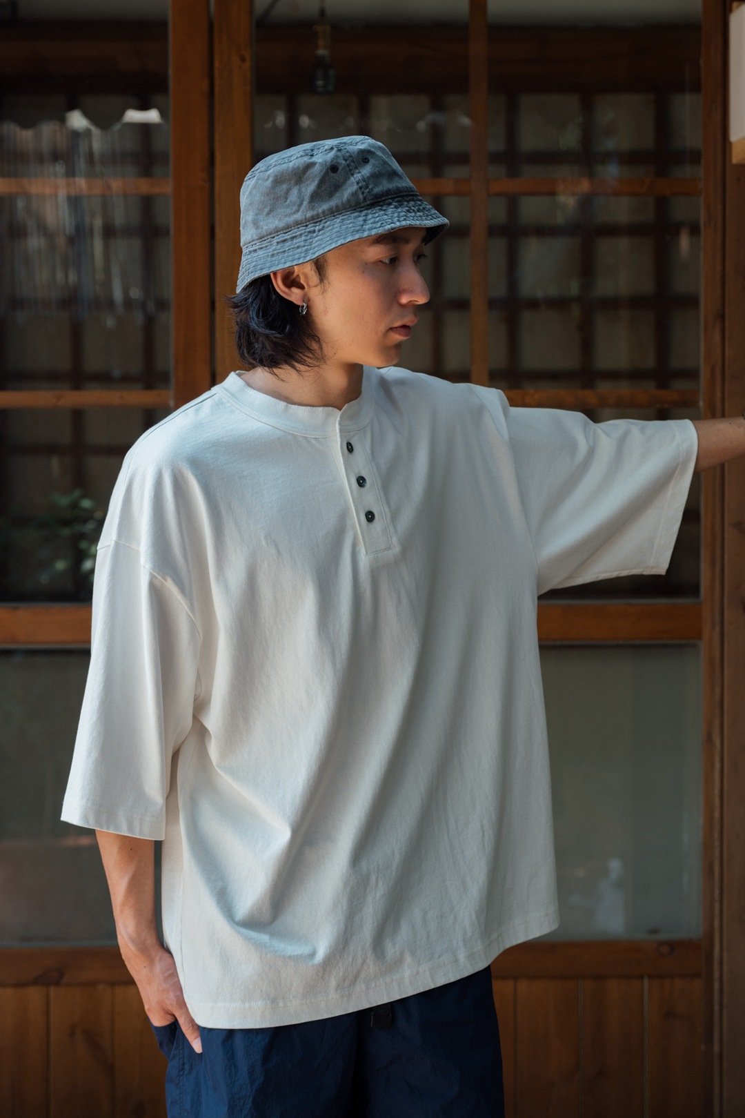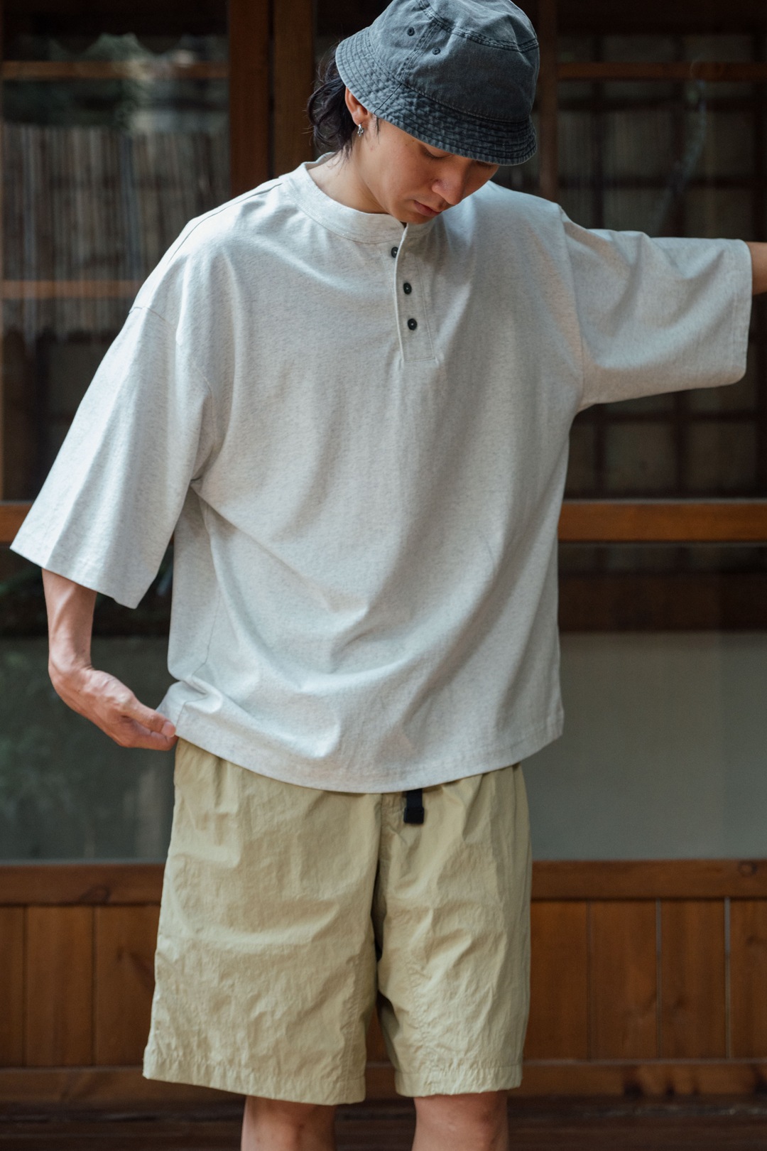 깔끔한 헨리넥 버튼 디테일과 여유로운 핏으로 편안하게 즐기기 좋은 반팔 티셔츠입니다.
