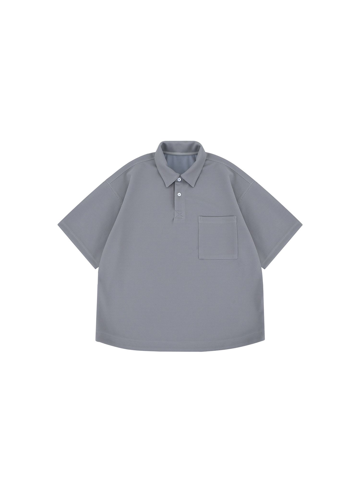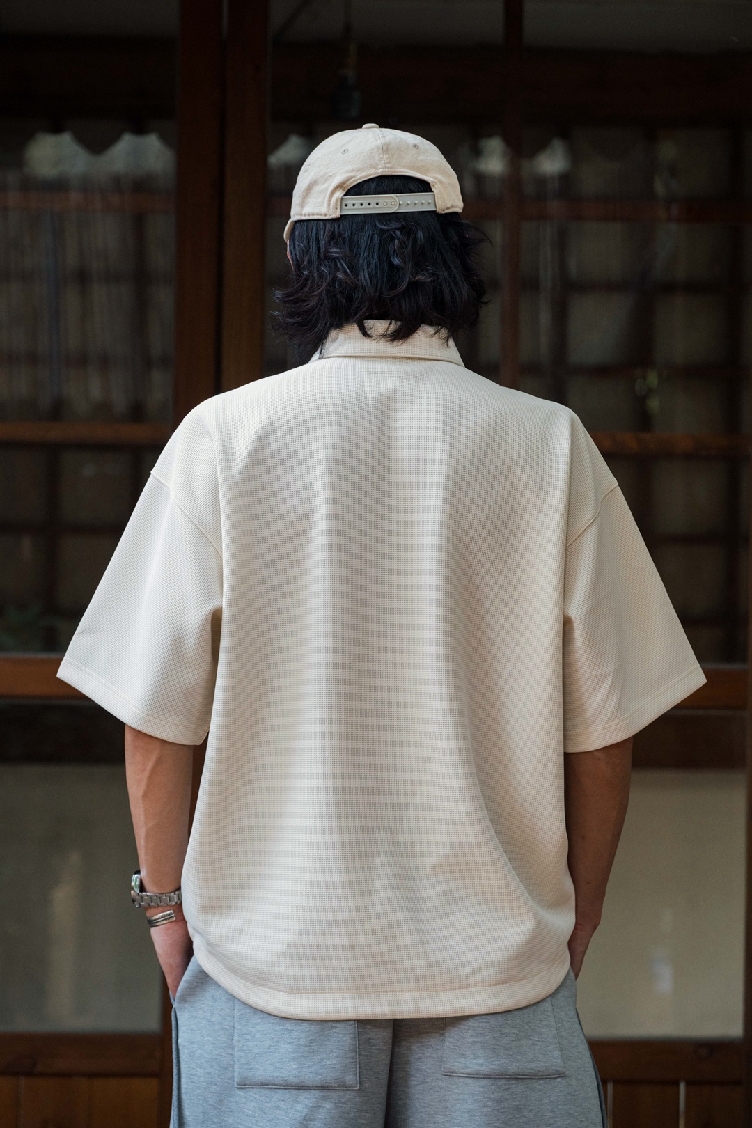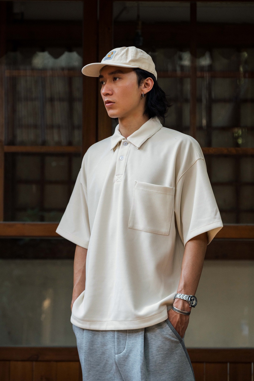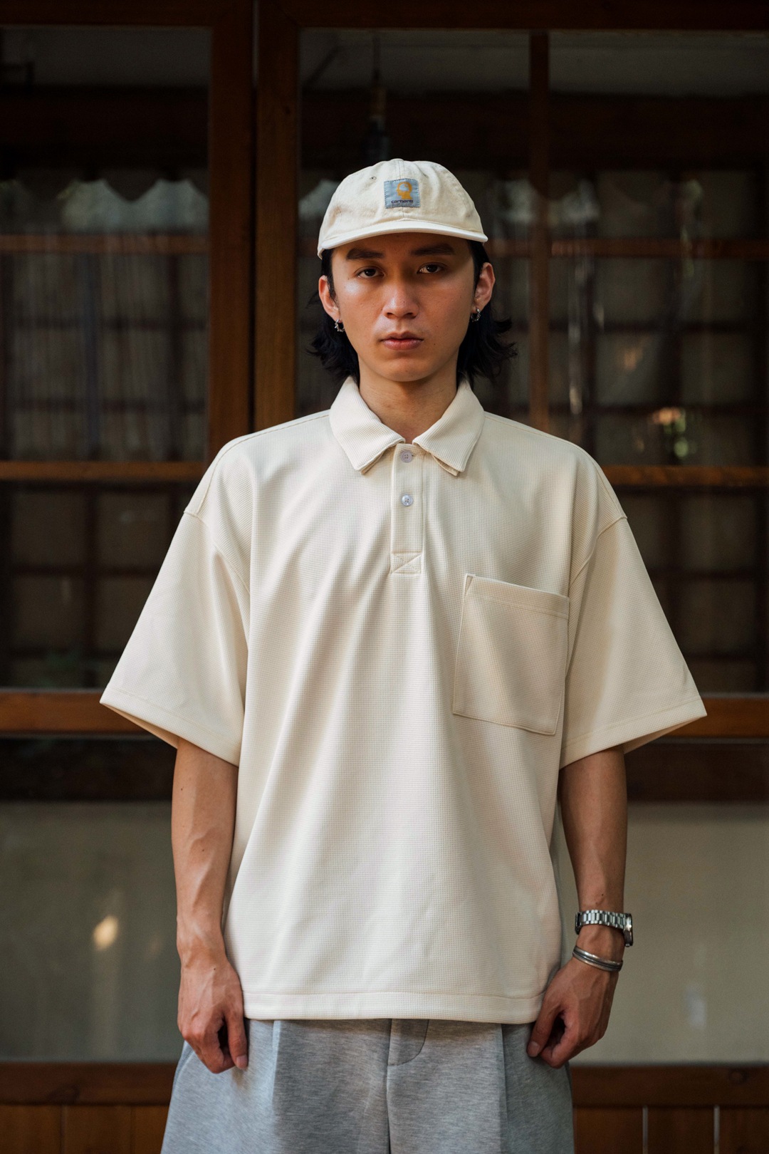 잔잔한 체크 텍스처와 여유 있는 실루엣이 돋보이는 반팔 카라 폴로 셔츠입니다.