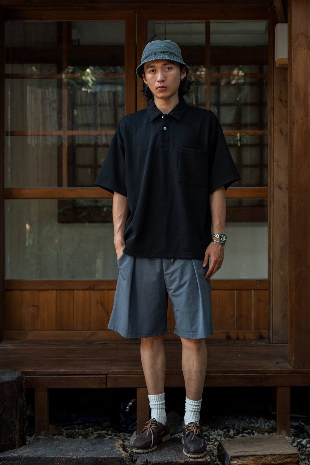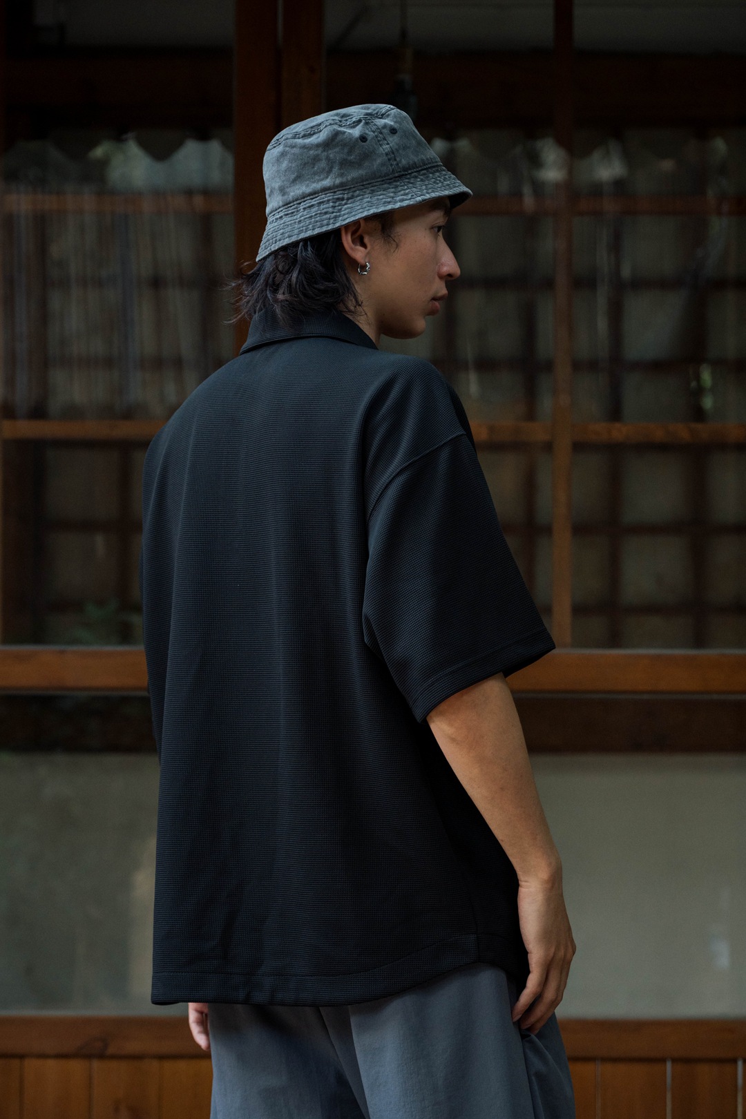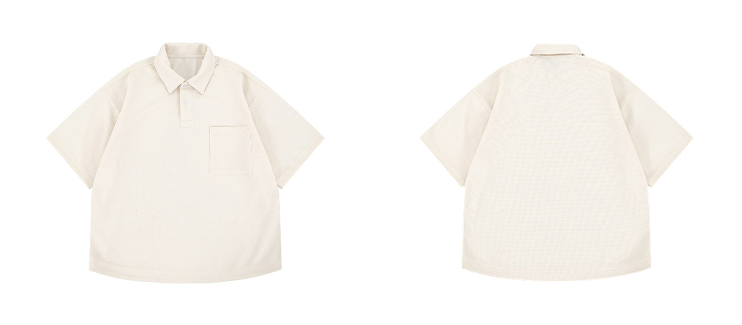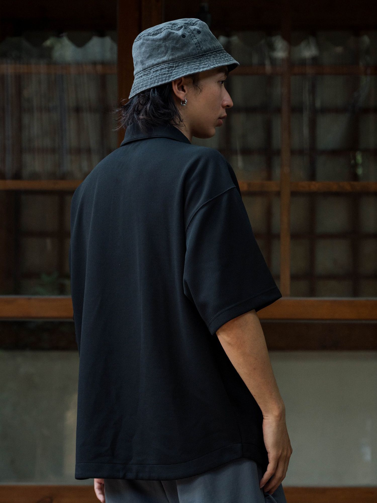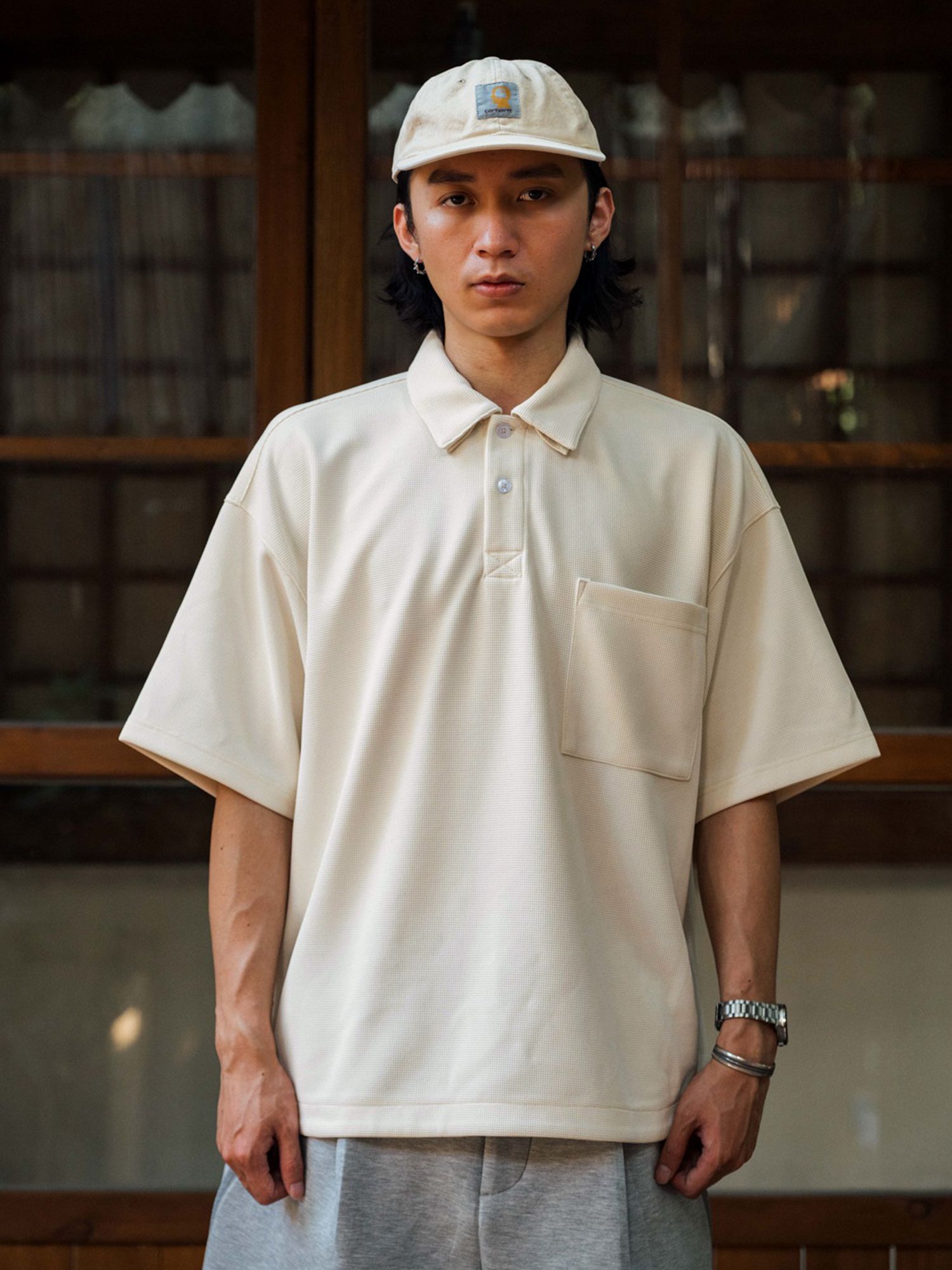 잔잔한 체크 텍스처와 여유 있는 실루엣이 돋보이는 반팔 카라 폴로 셔츠입니다.