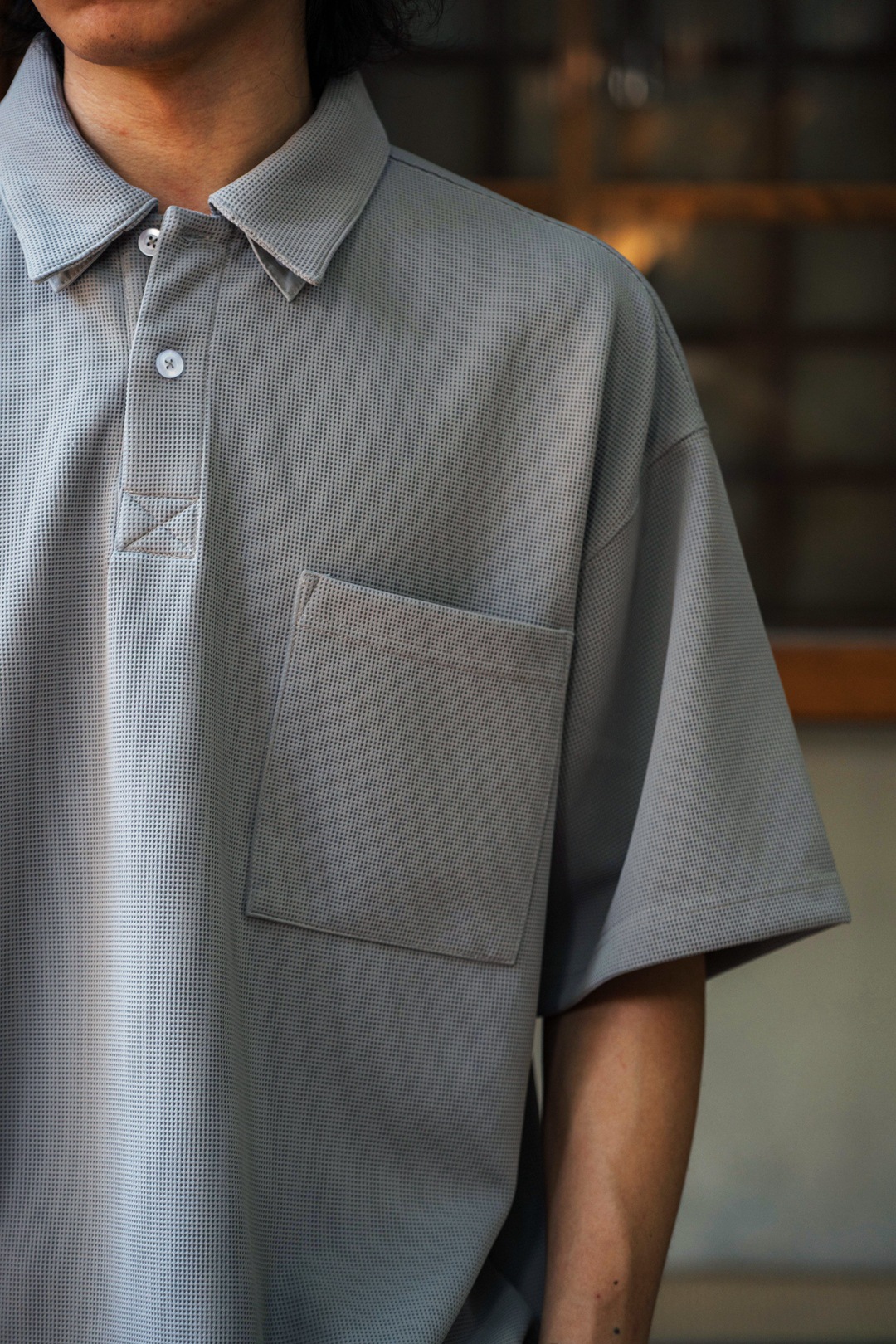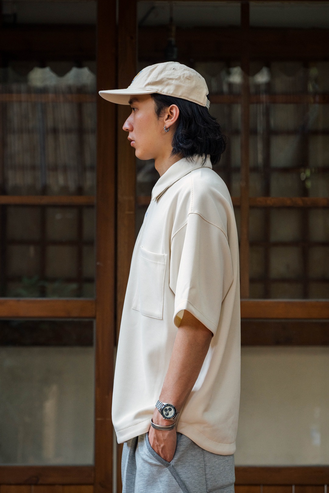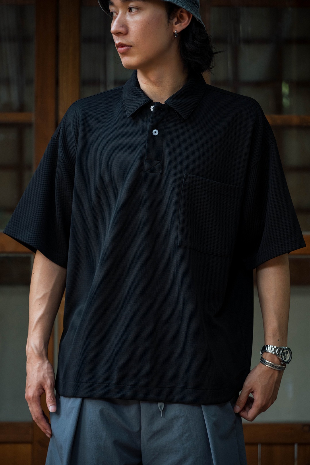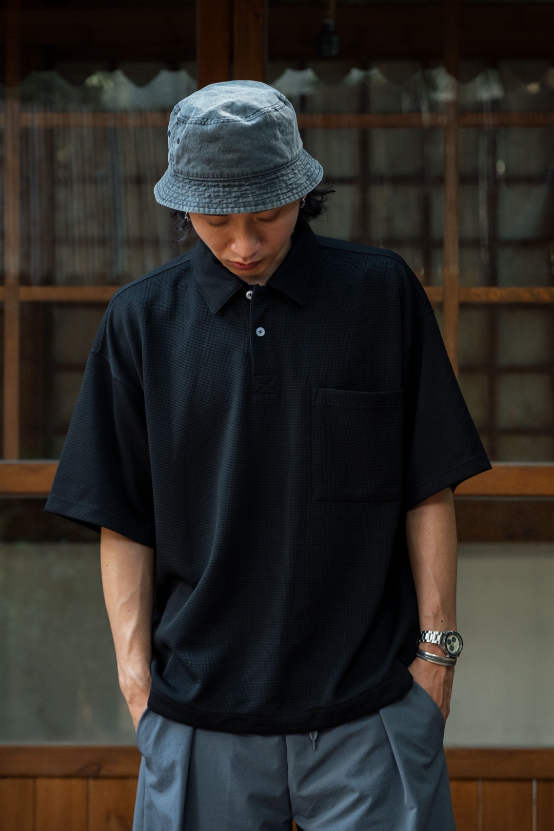 잔잔한 체크 텍스처와 여유 있는 실루엣이 돋보이는 반팔 카라 폴로 셔츠입니다.