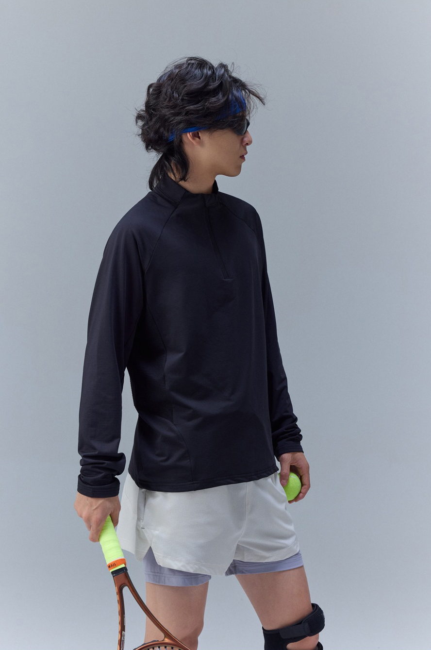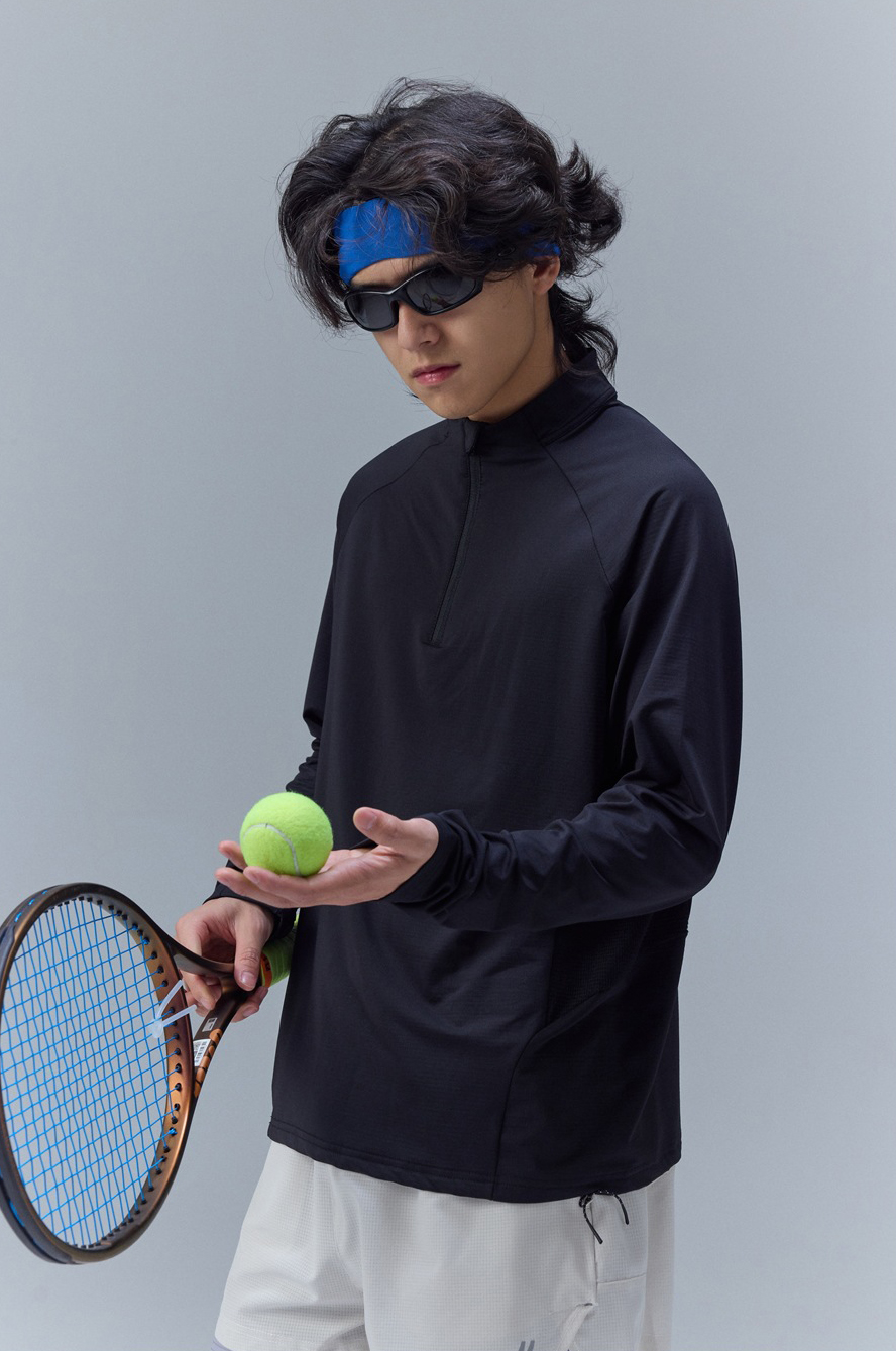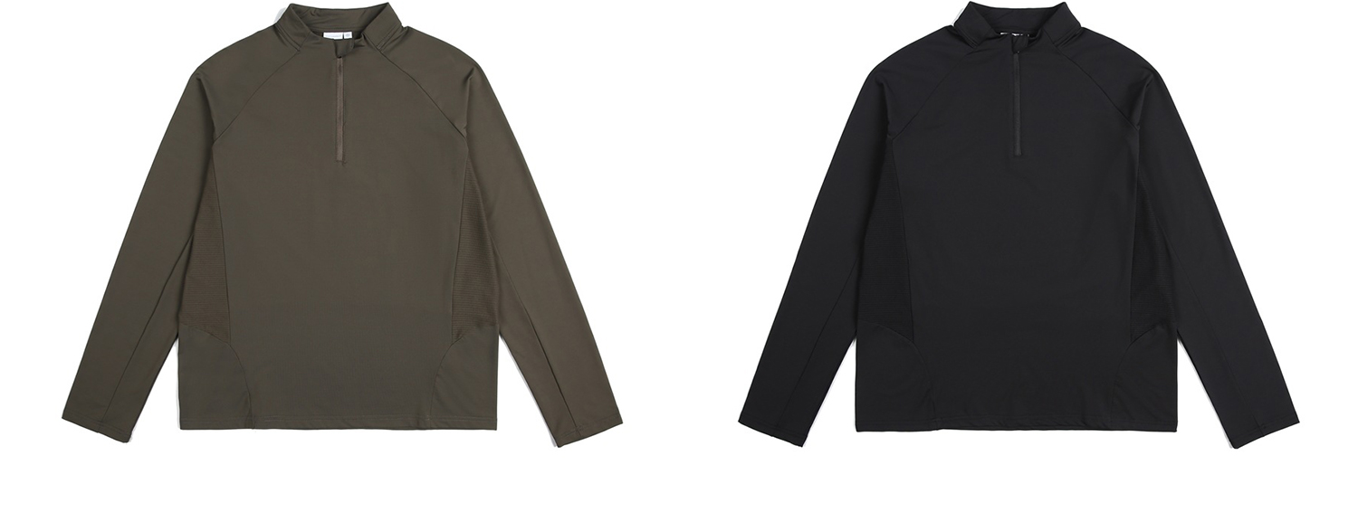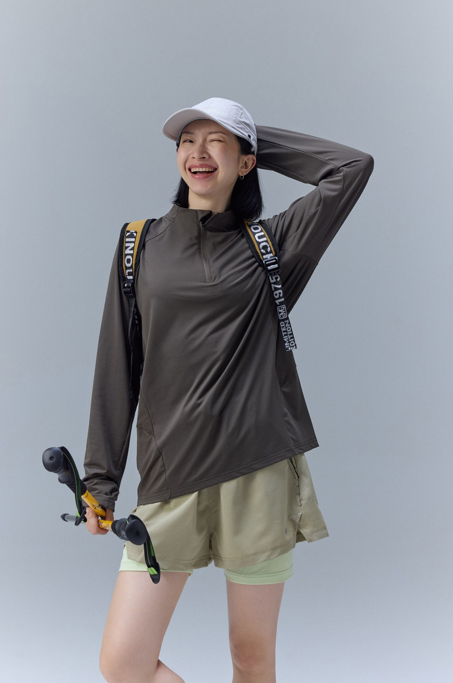 활동적인 무드를 살려주는 하프 집업 디자인의 아웃도어 롱슬리브 탑입니다.