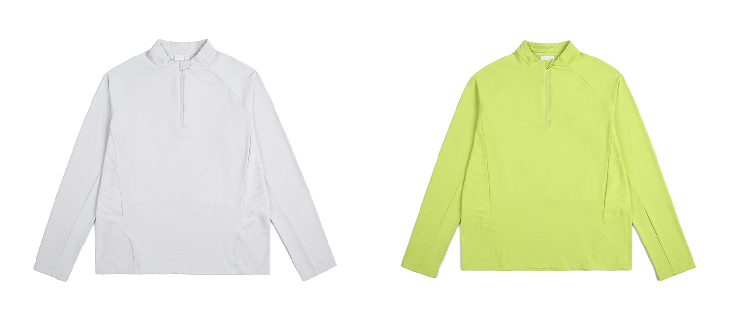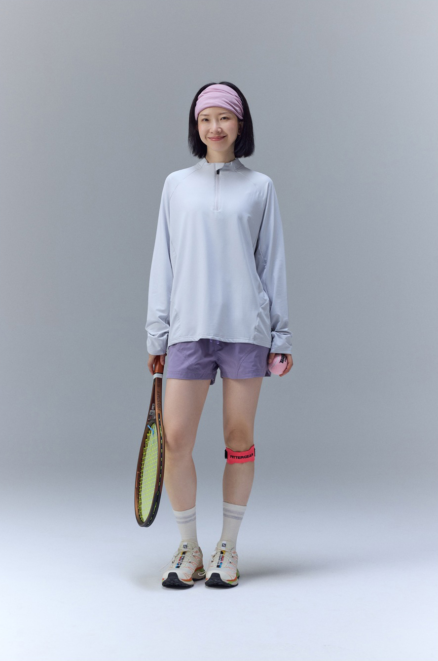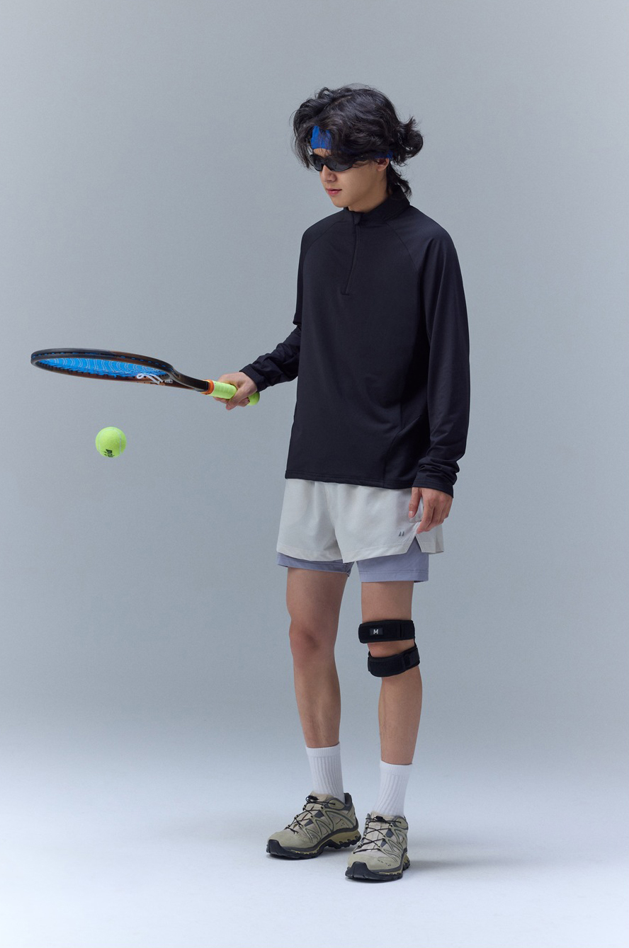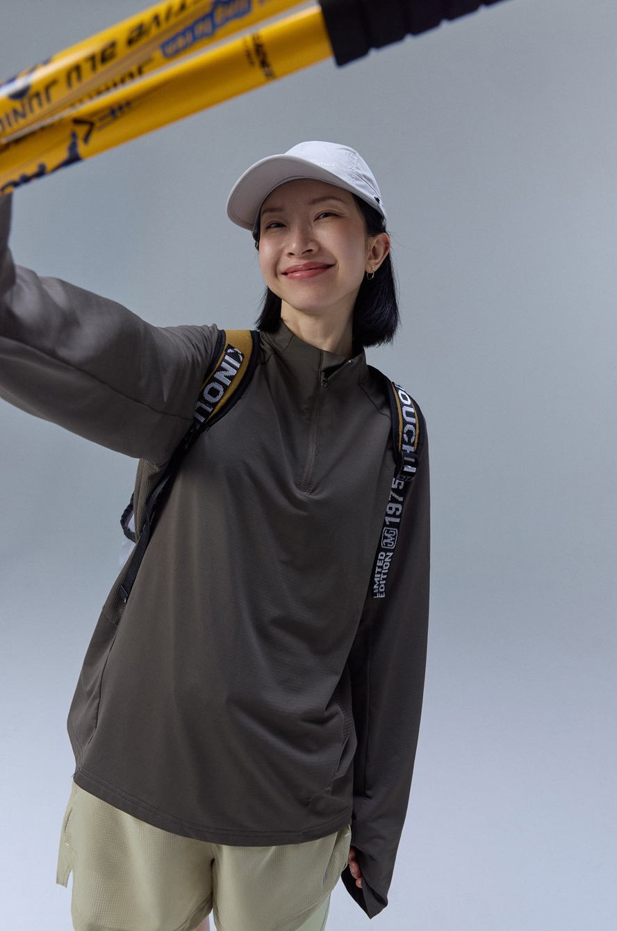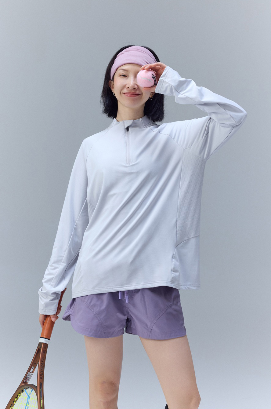 활동적인 무드를 살려주는 하프 집업 디자인의 아웃도어 롱슬리브 탑입니다.