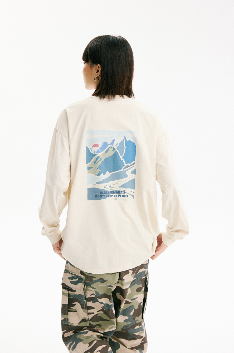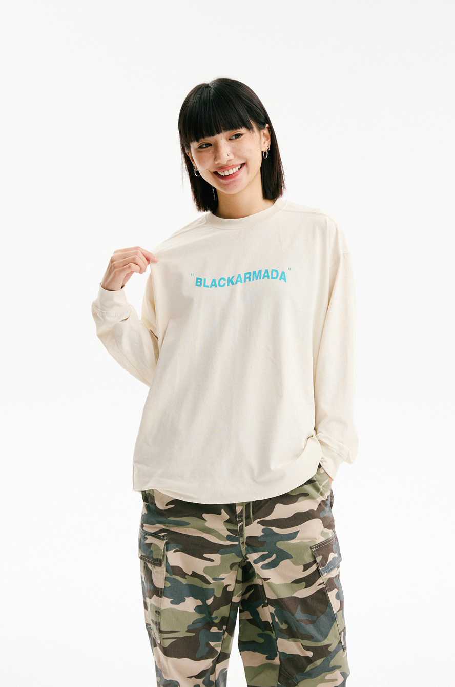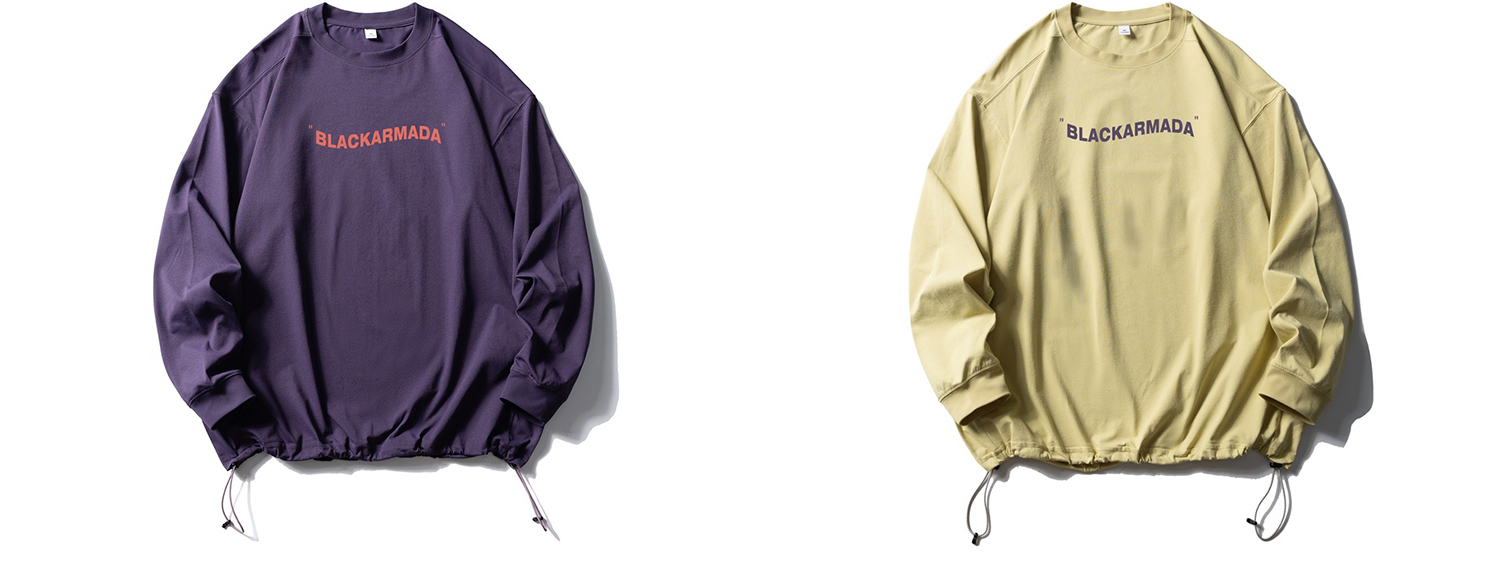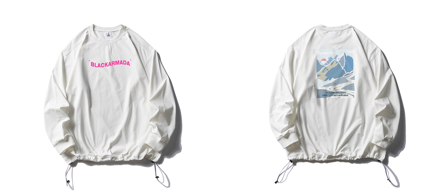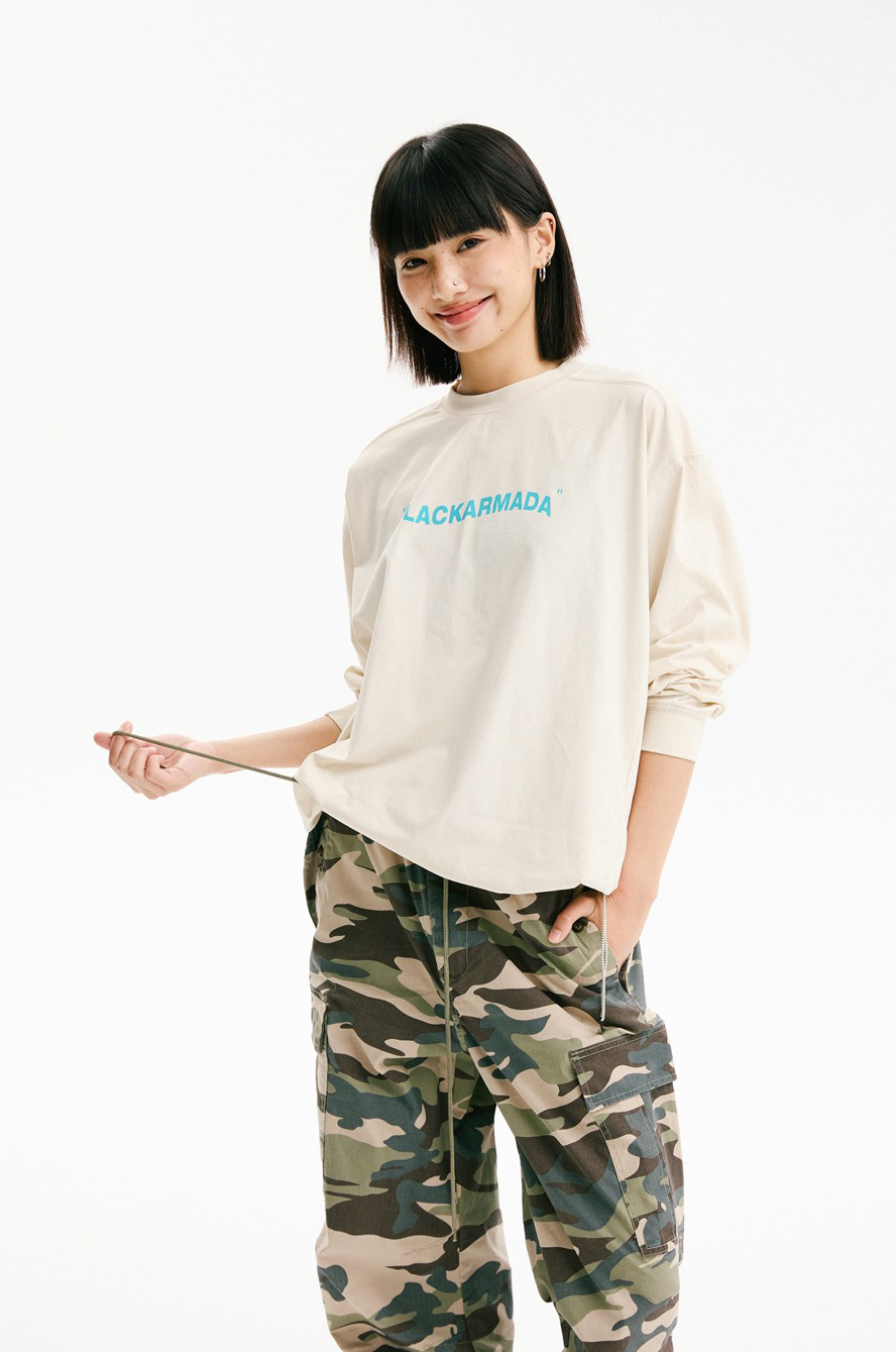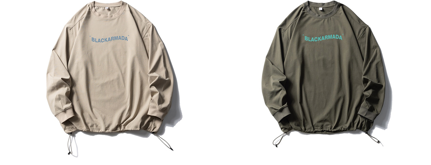 프론트 레터링과 백 프린트가 감각적인 포인트가 되는 드로스트링 롱슬리브 티셔츠입니다.
