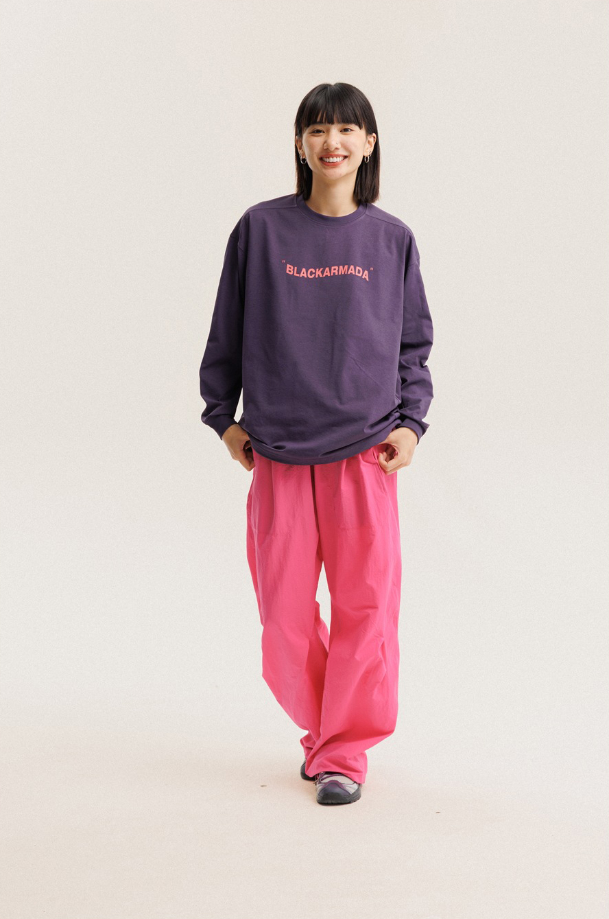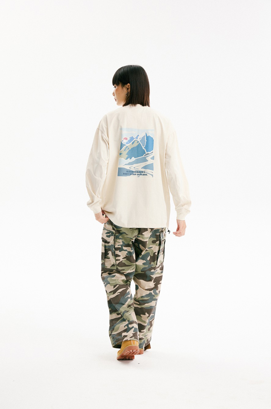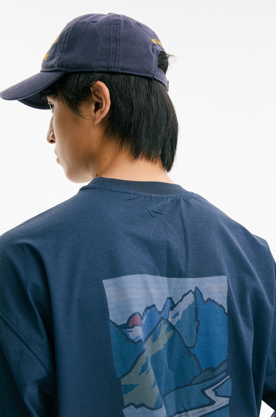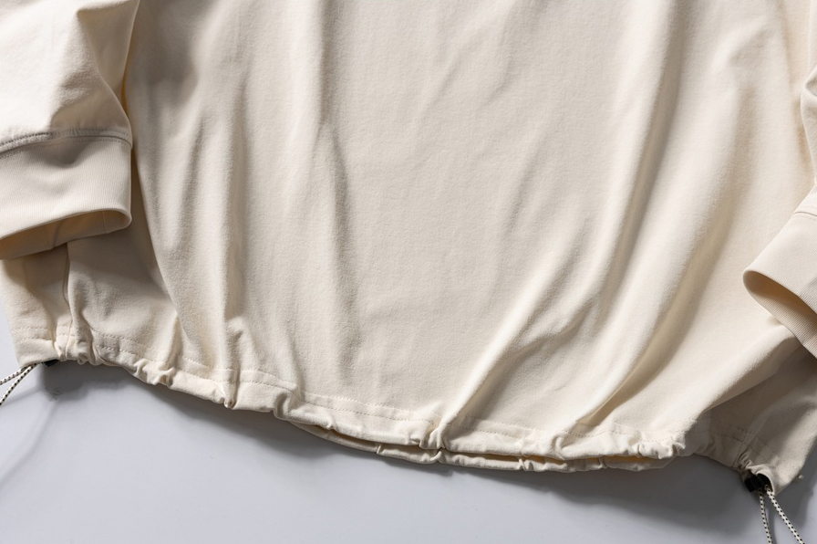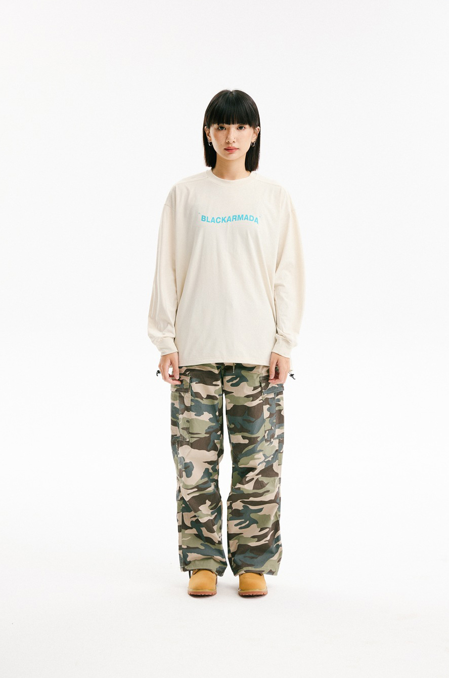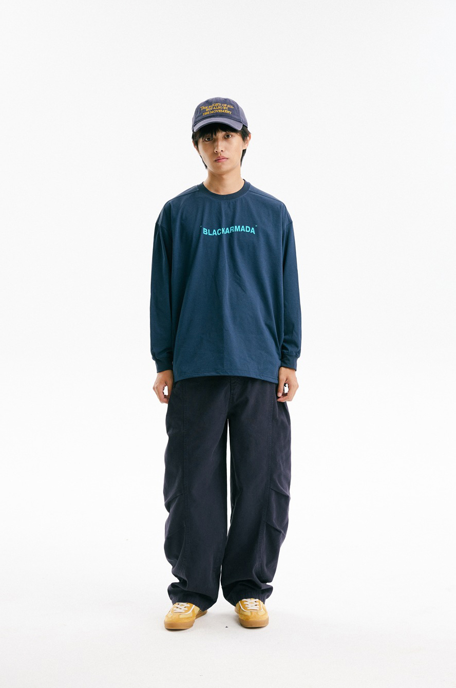 프론트 레터링과 백 프린트가 감각적인 포인트가 되는 드로스트링 롱슬리브 티셔츠입니다.