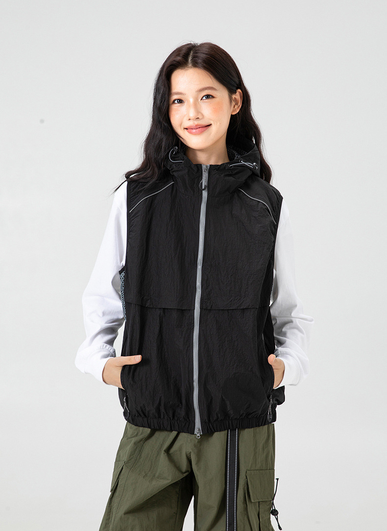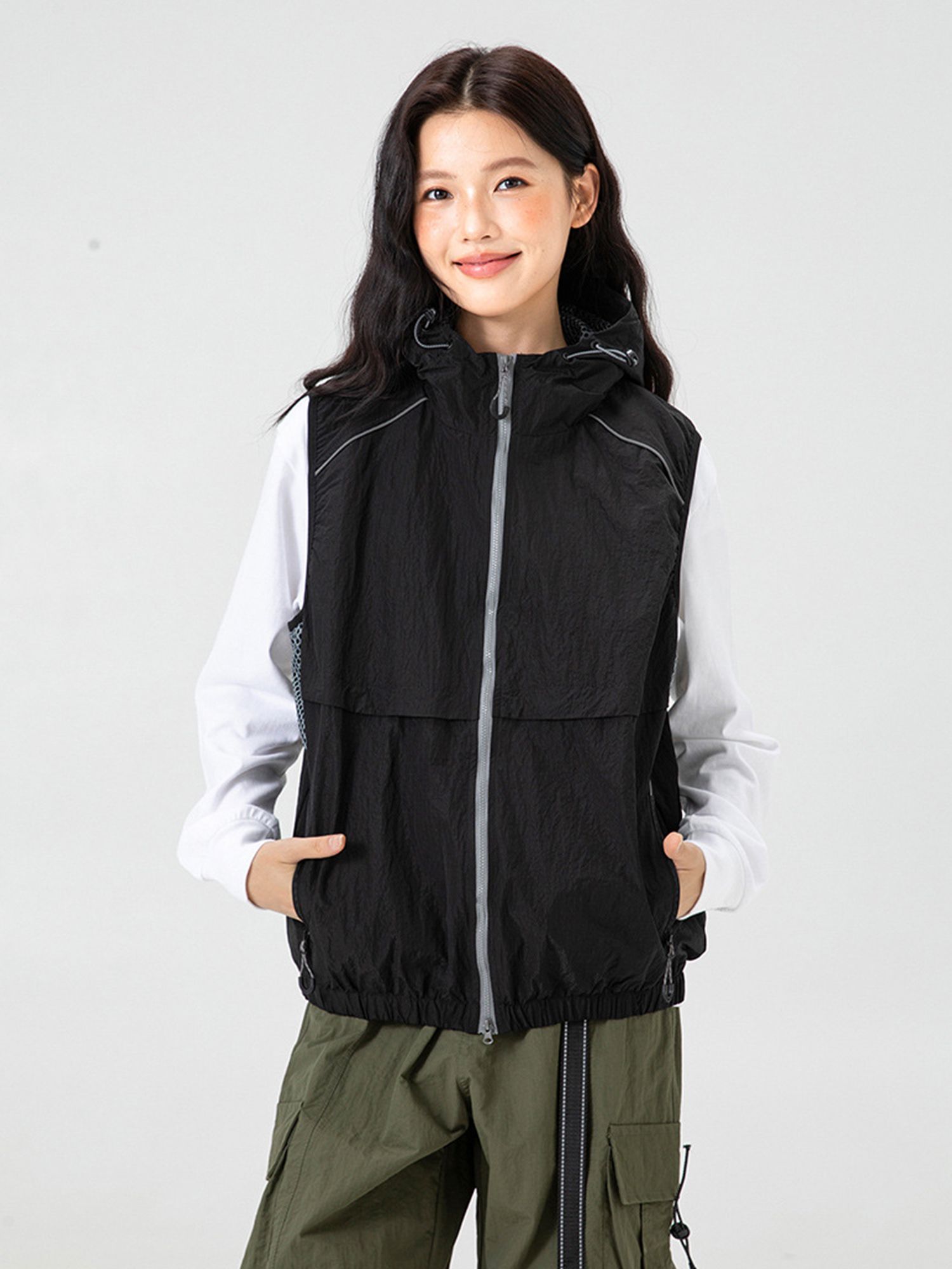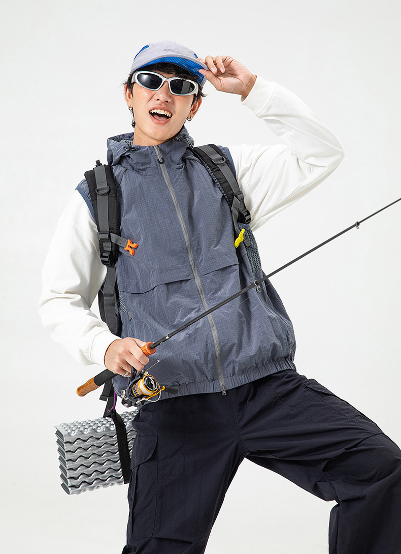 생활 방수 기능과 가벼운 착용감을 갖춘 후드형 아웃도어 베스트입니다.