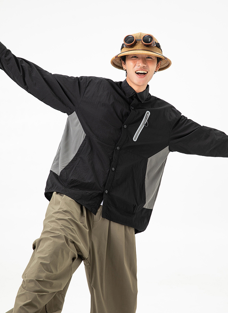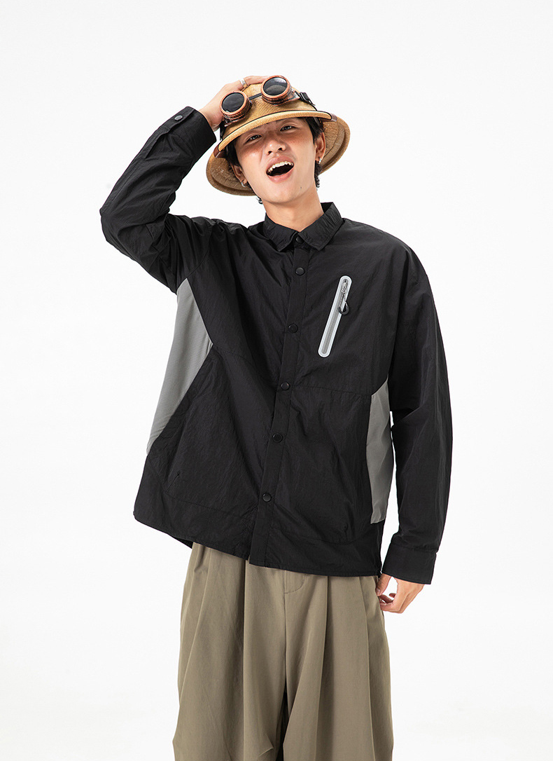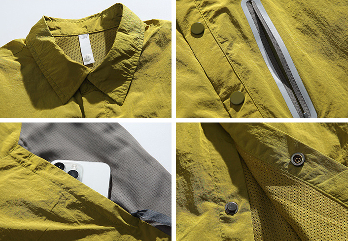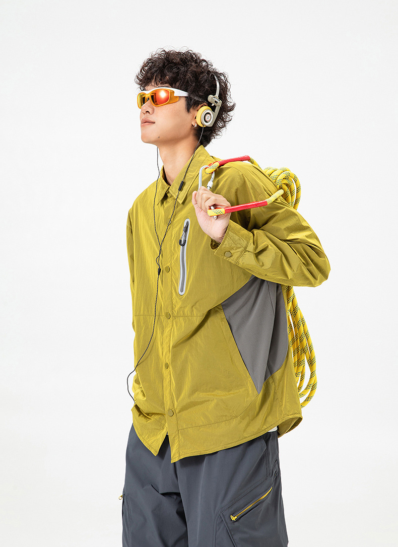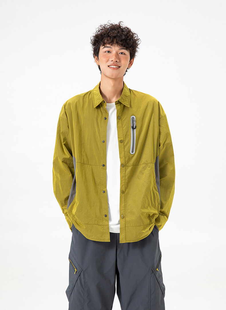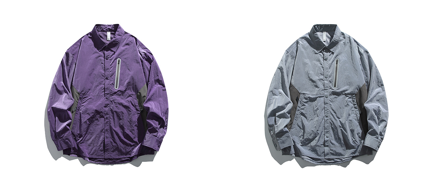 생활 방수와 내구성을 갖춘 메탈릭 나일론 셔츠 자켓입니다.