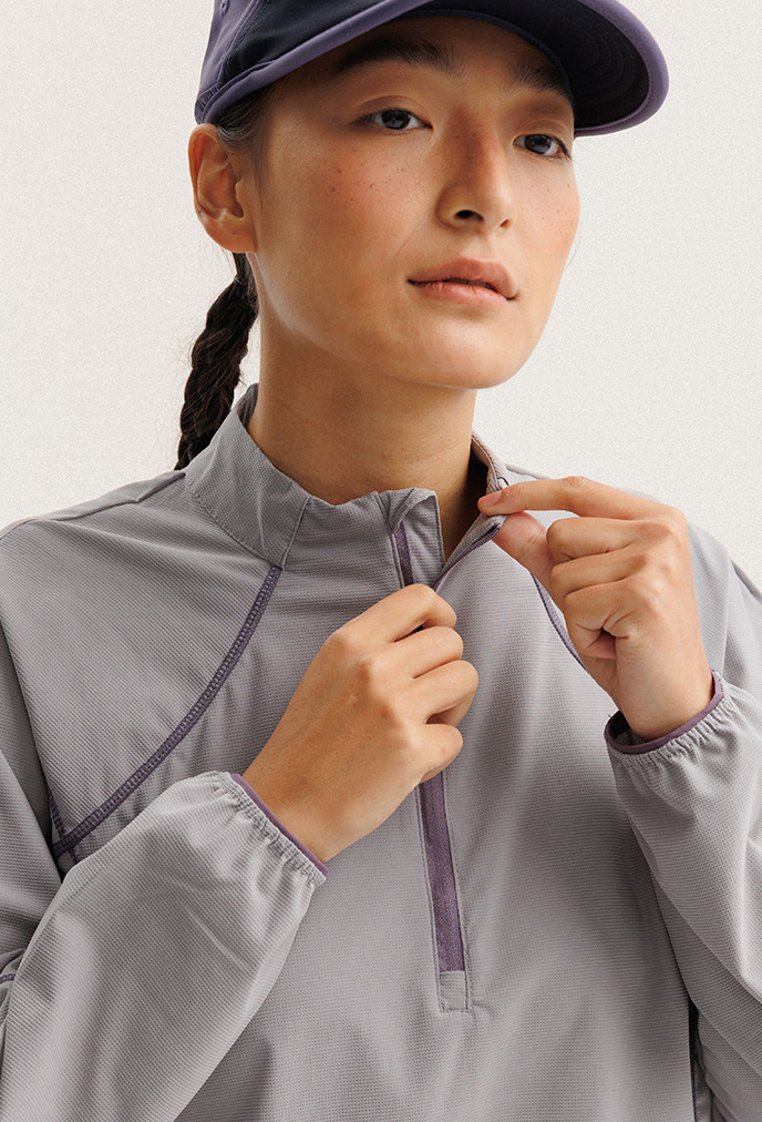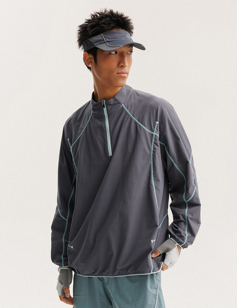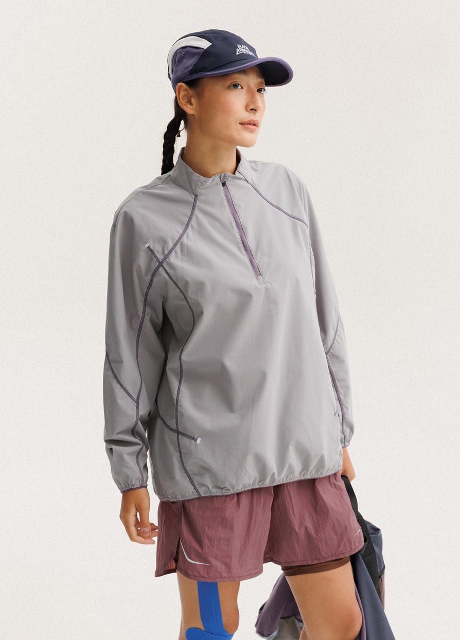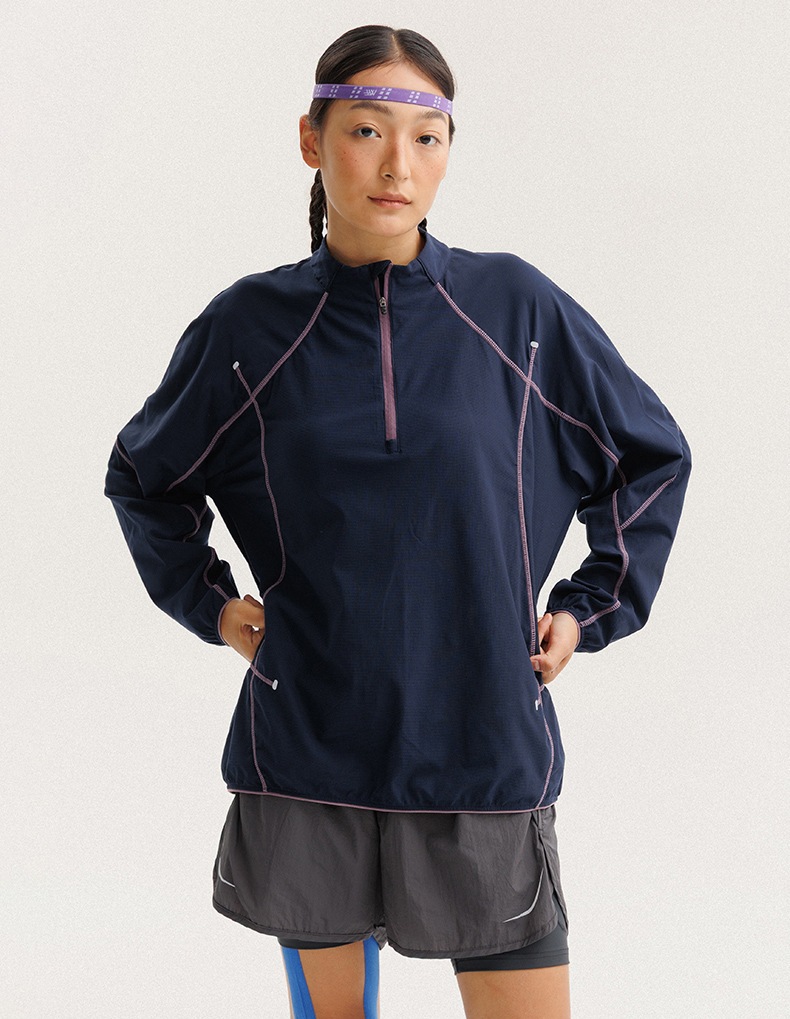 입체적인 배색 스티치 라인으로 활동적인 무드를 살린 하프집업 경량 맨투맨 셔츠입니다.