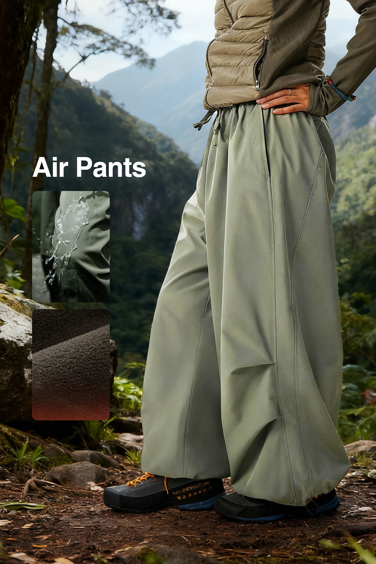 방수 겉감과 포근한 기모 안감을 더해 아웃도어 활동에도 따뜻하고 편안하게 입는 와이드 에어팬츠입니다.