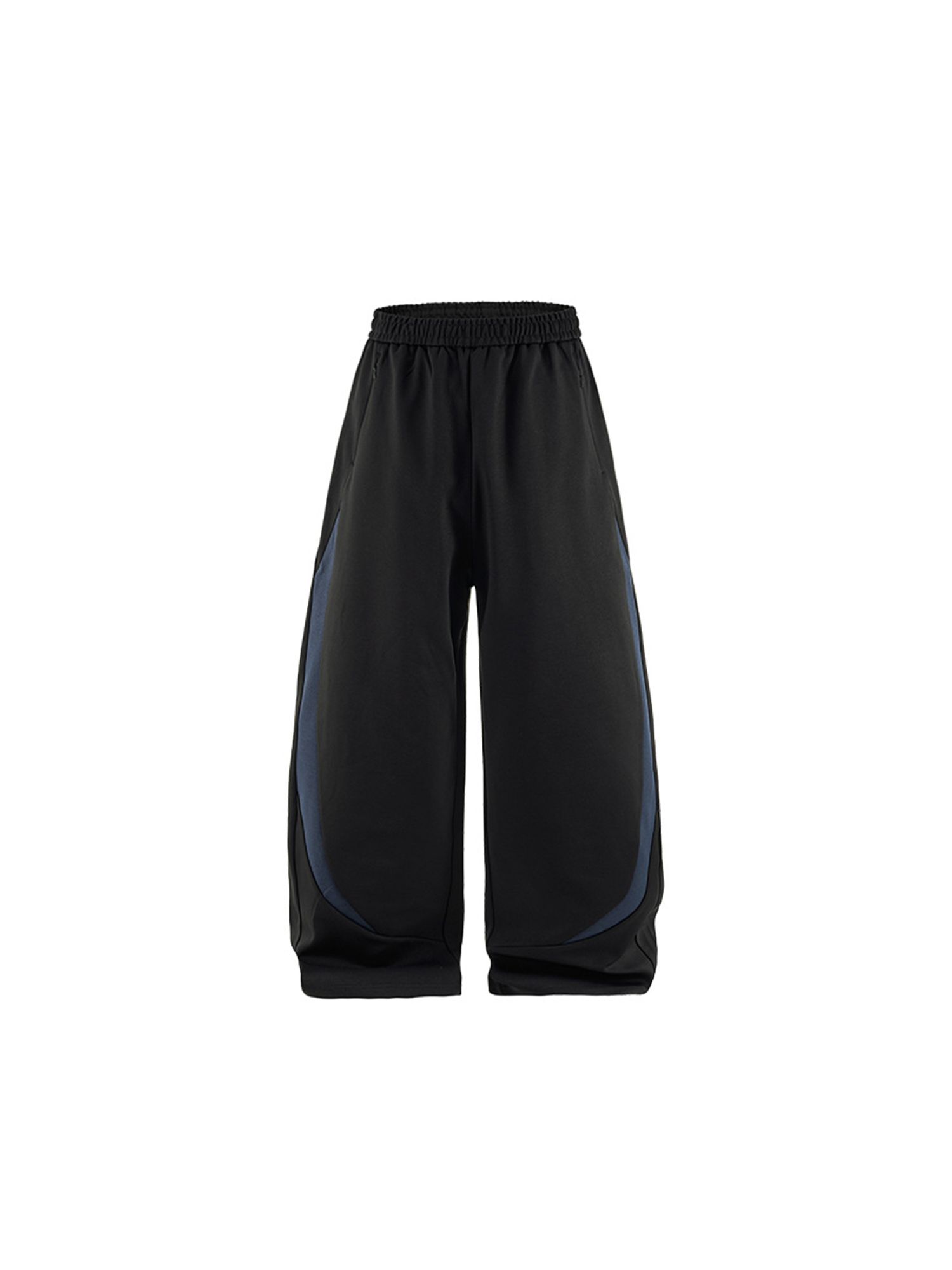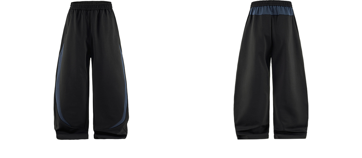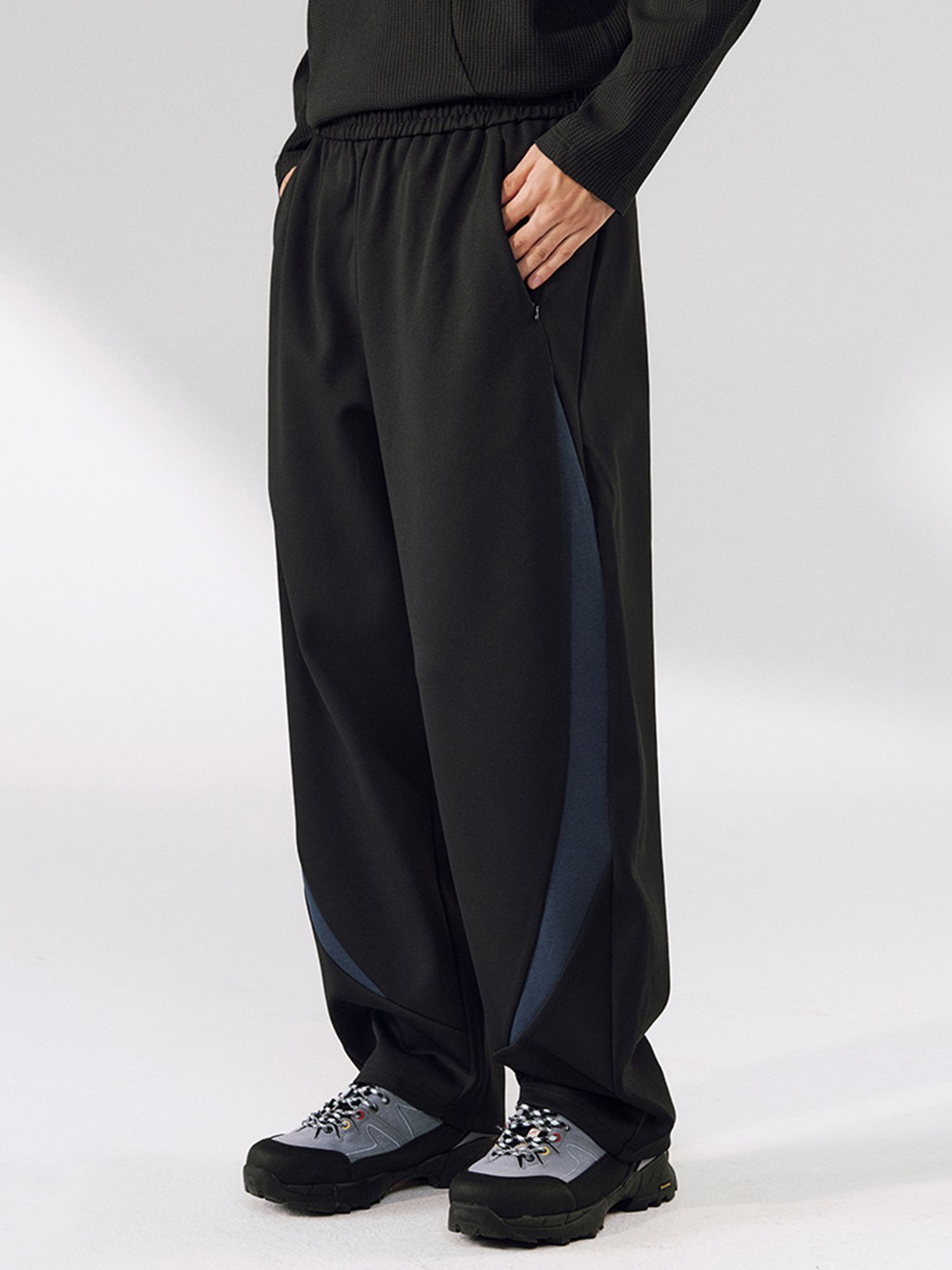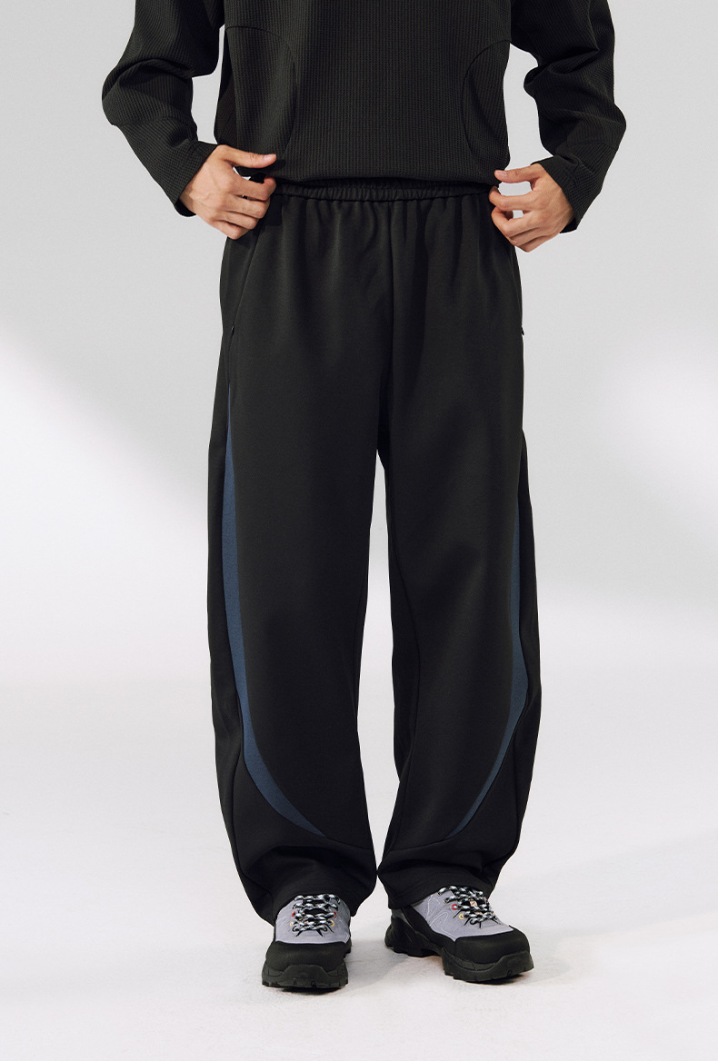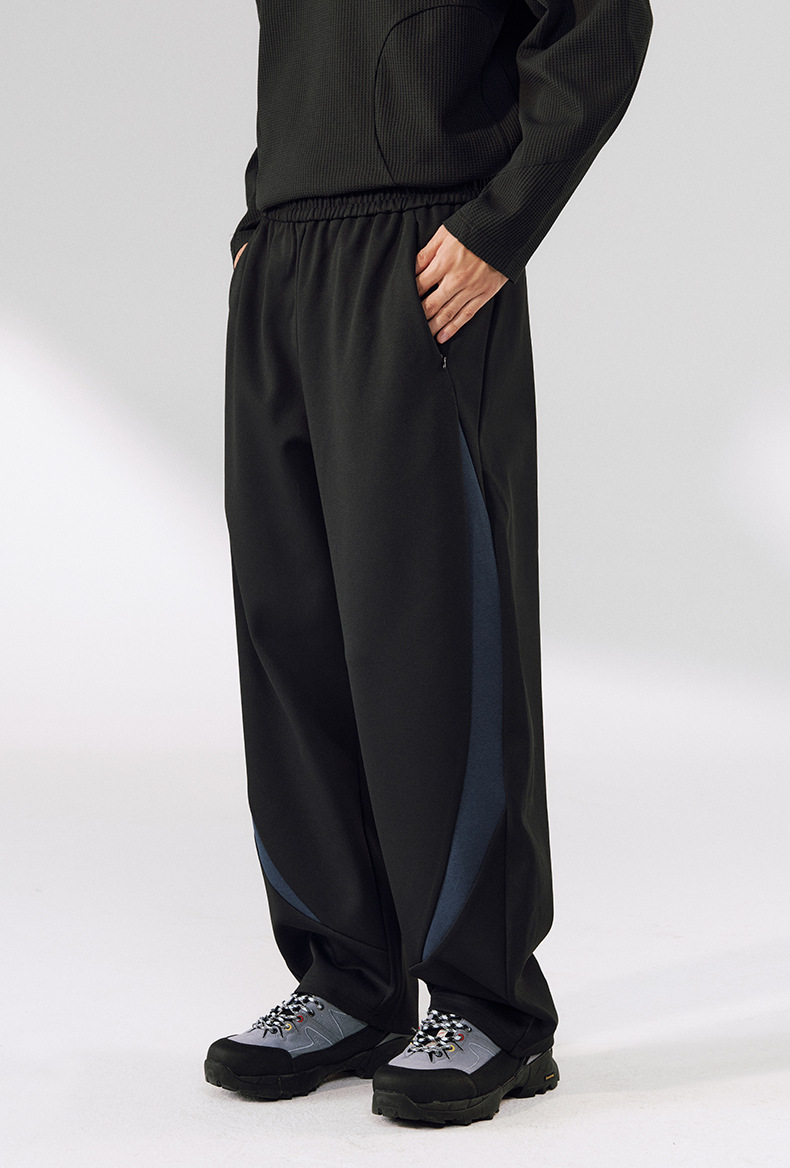 입체적인 곡선 절개와 배색 포인트로 스타일과 기능성을 모두 갖춘 편안한 와이드 트랙 팬츠입니다.