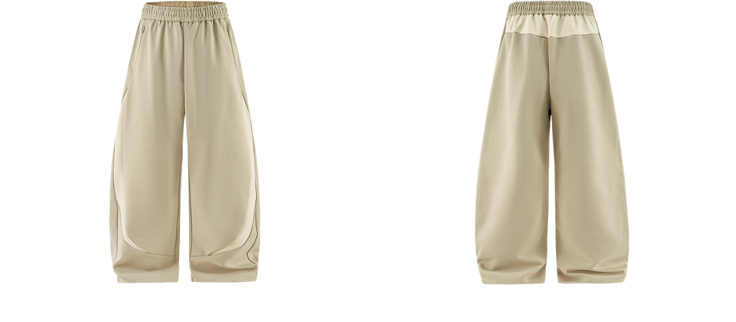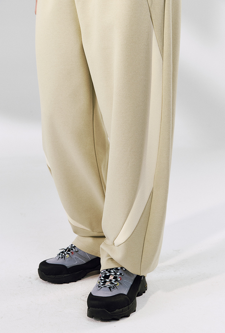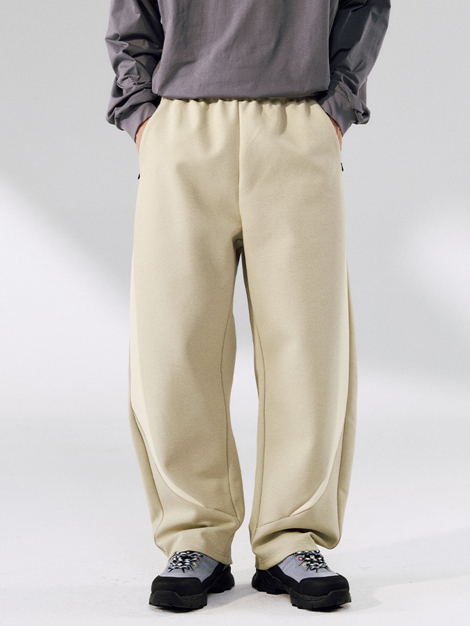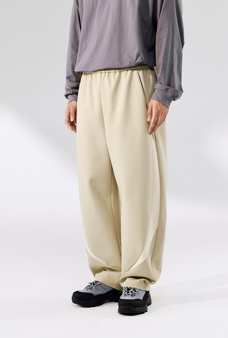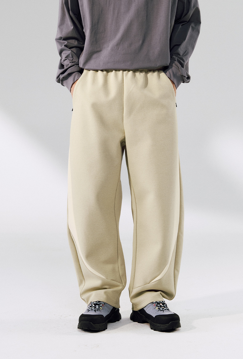 입체적인 곡선 절개와 배색 포인트로 스타일과 기능성을 모두 갖춘 편안한 와이드 트랙 팬츠입니다.