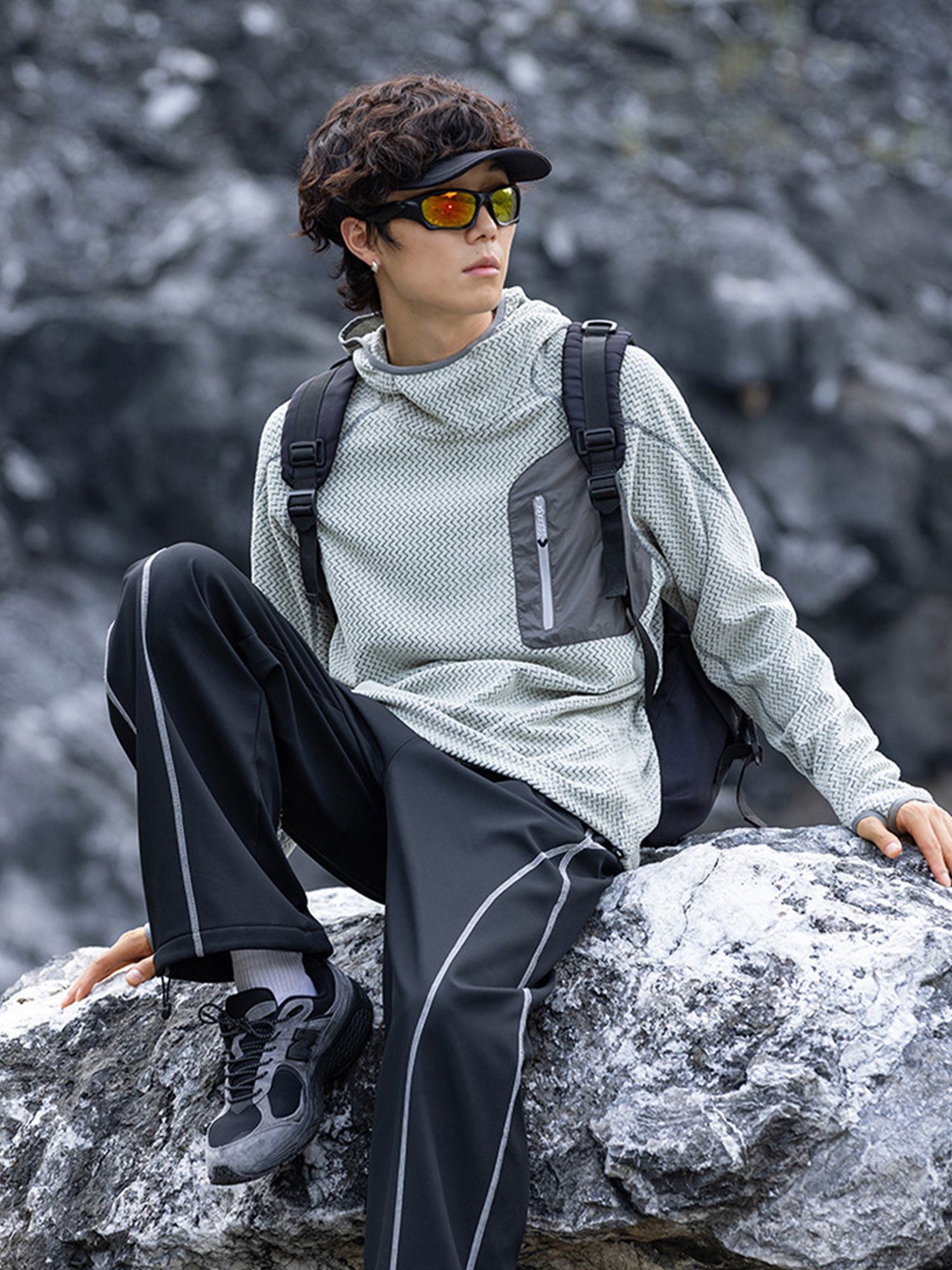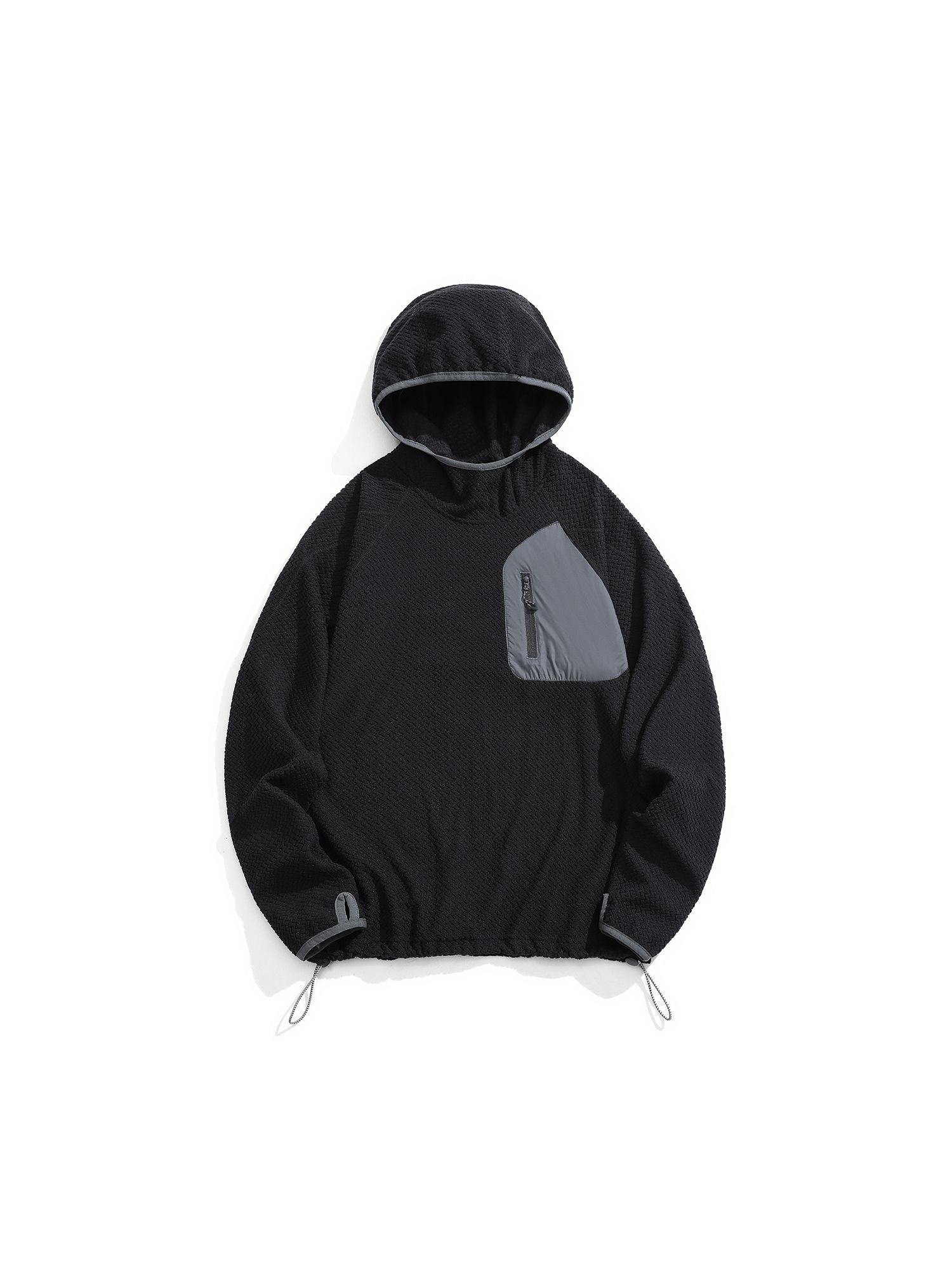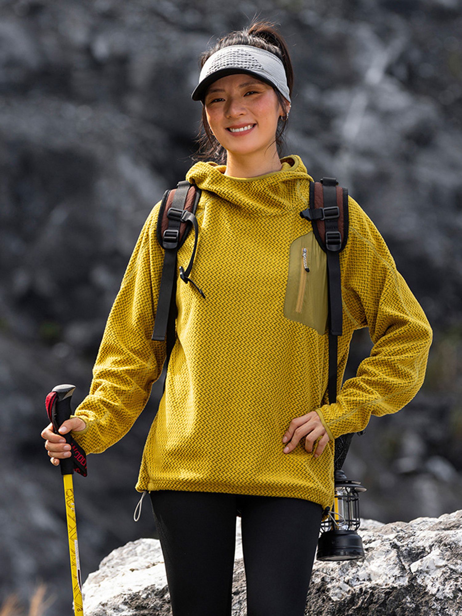 기능성 보온 원단으로 제작된 후드 하이넥 티셔츠로, 가볍지만 따뜻하게 체온을 유지해주는 아웃도어 웨어입니다.