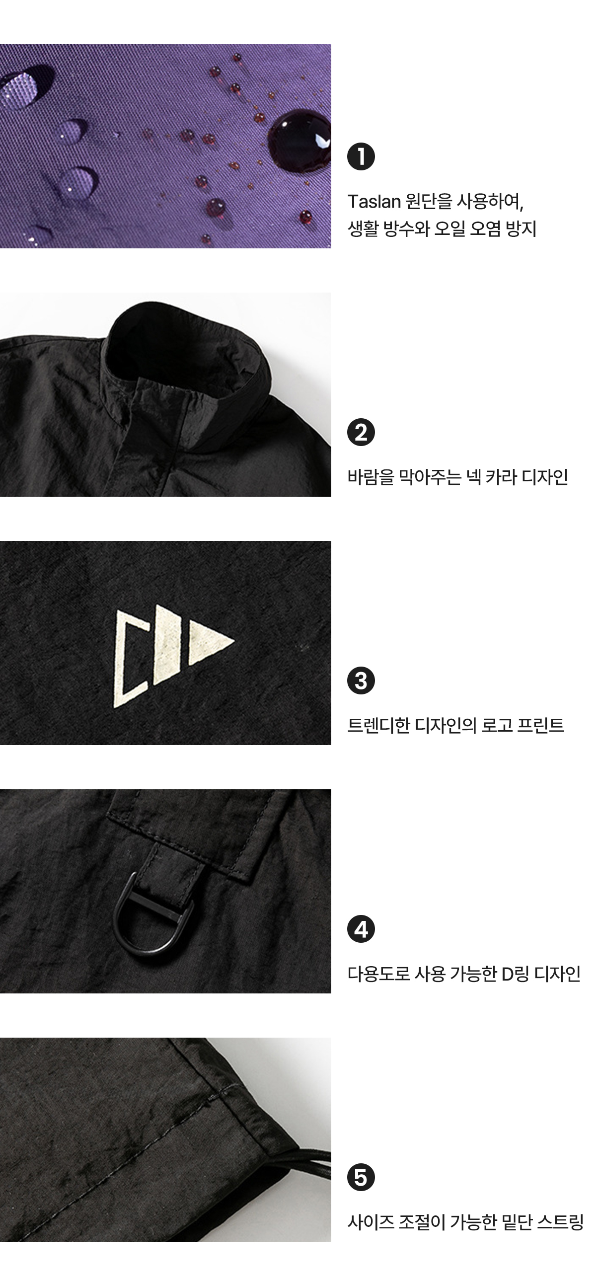 - 기능성 원단을 사용하여 생활 방수 가능