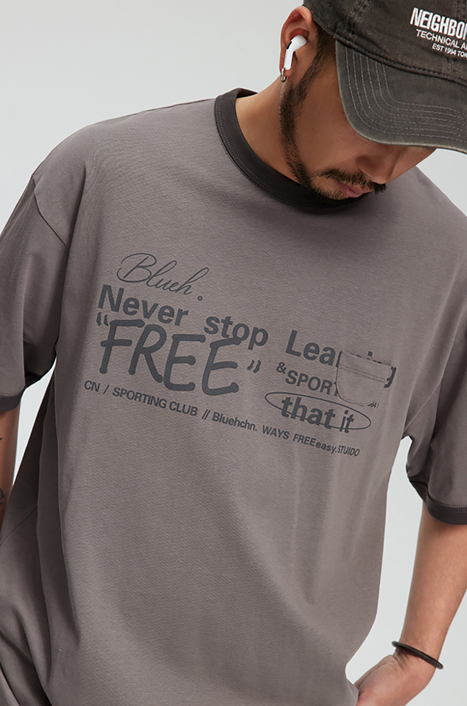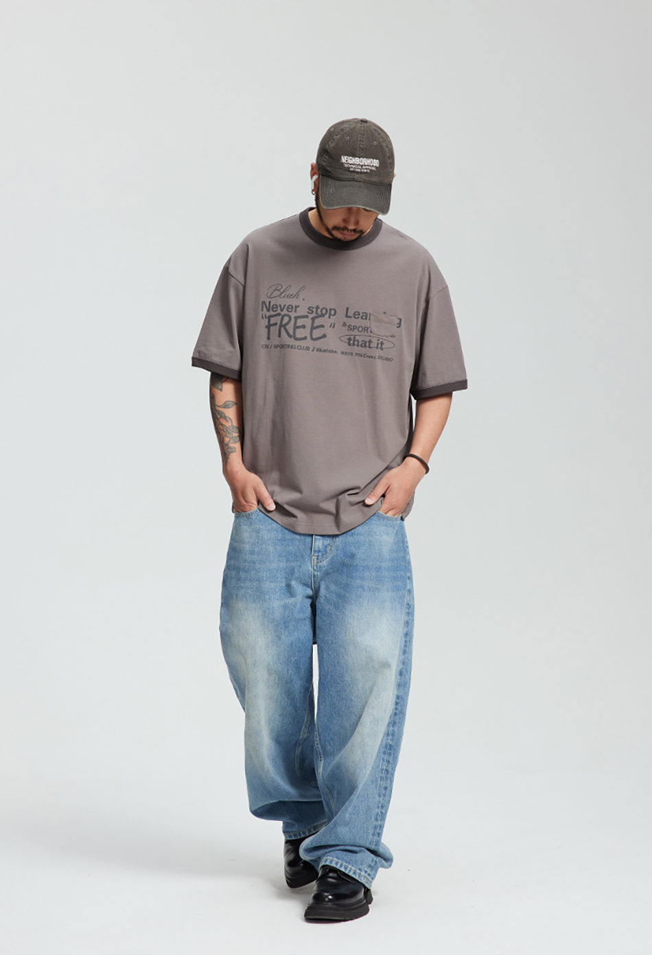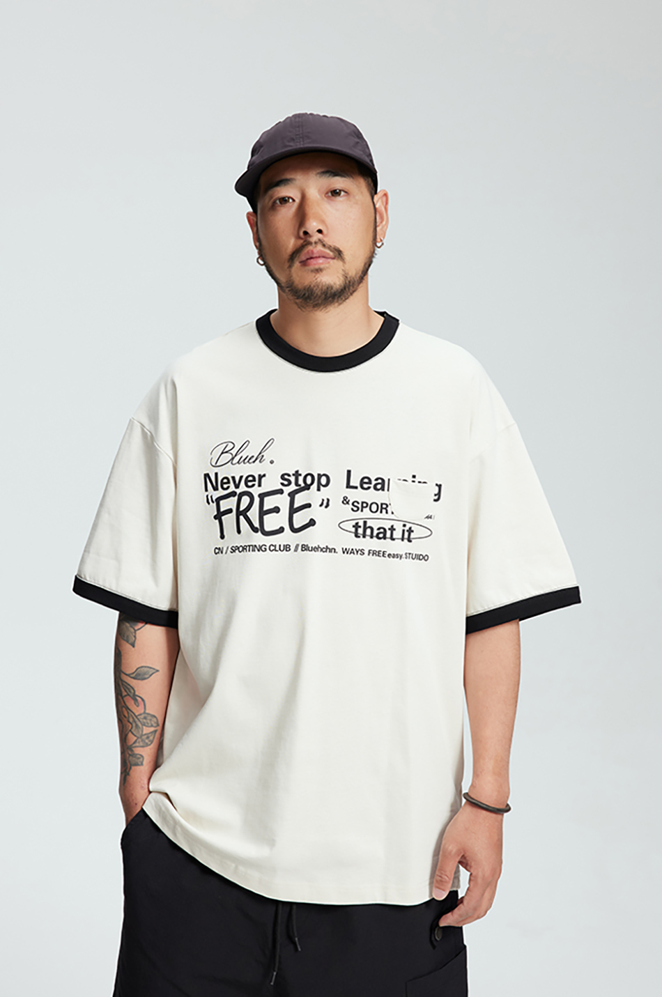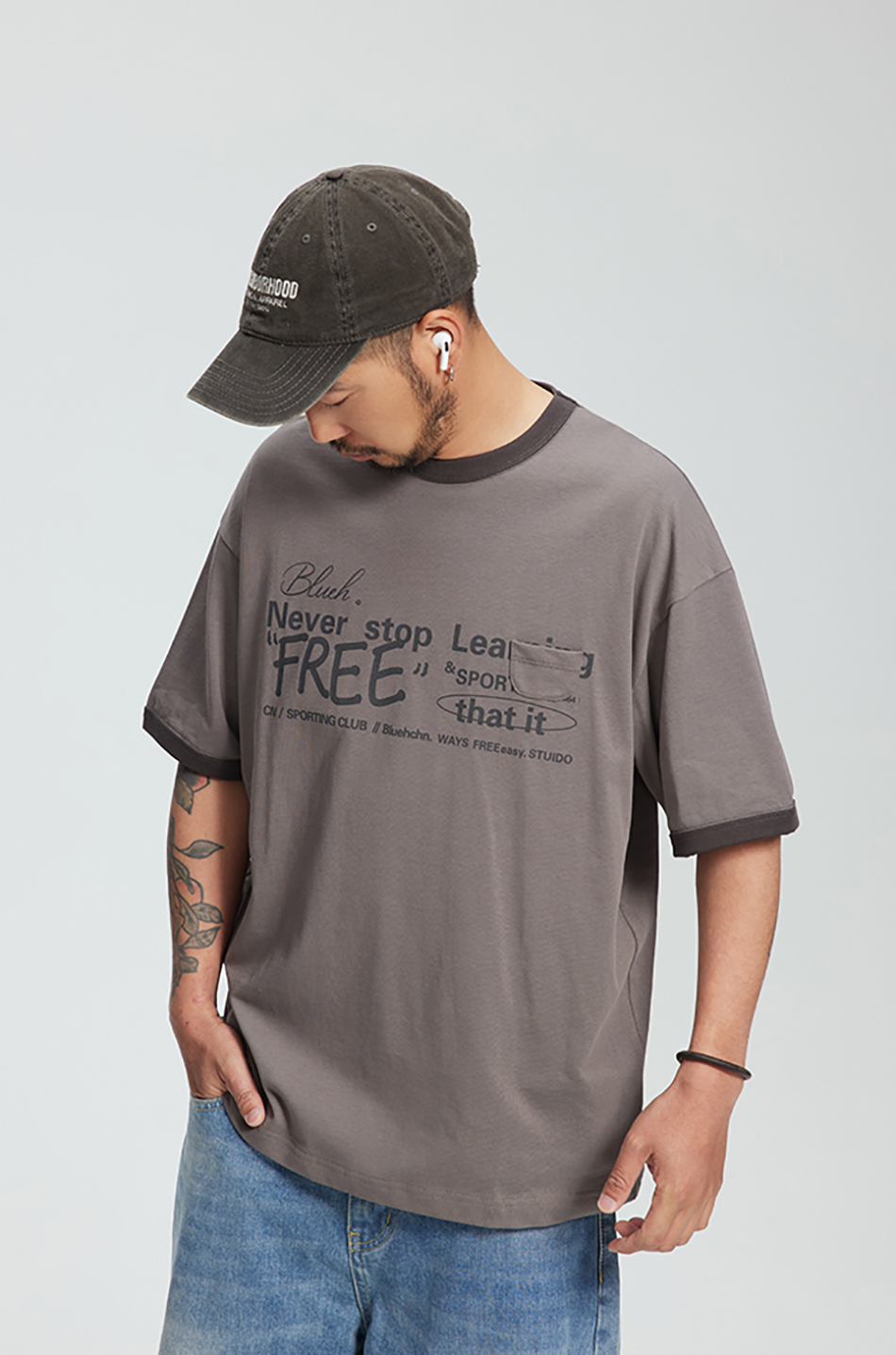 다양한 폰트와 레이아웃이 특색있는 핏감이 살아있는 루즈핏의 티셔츠입니다.