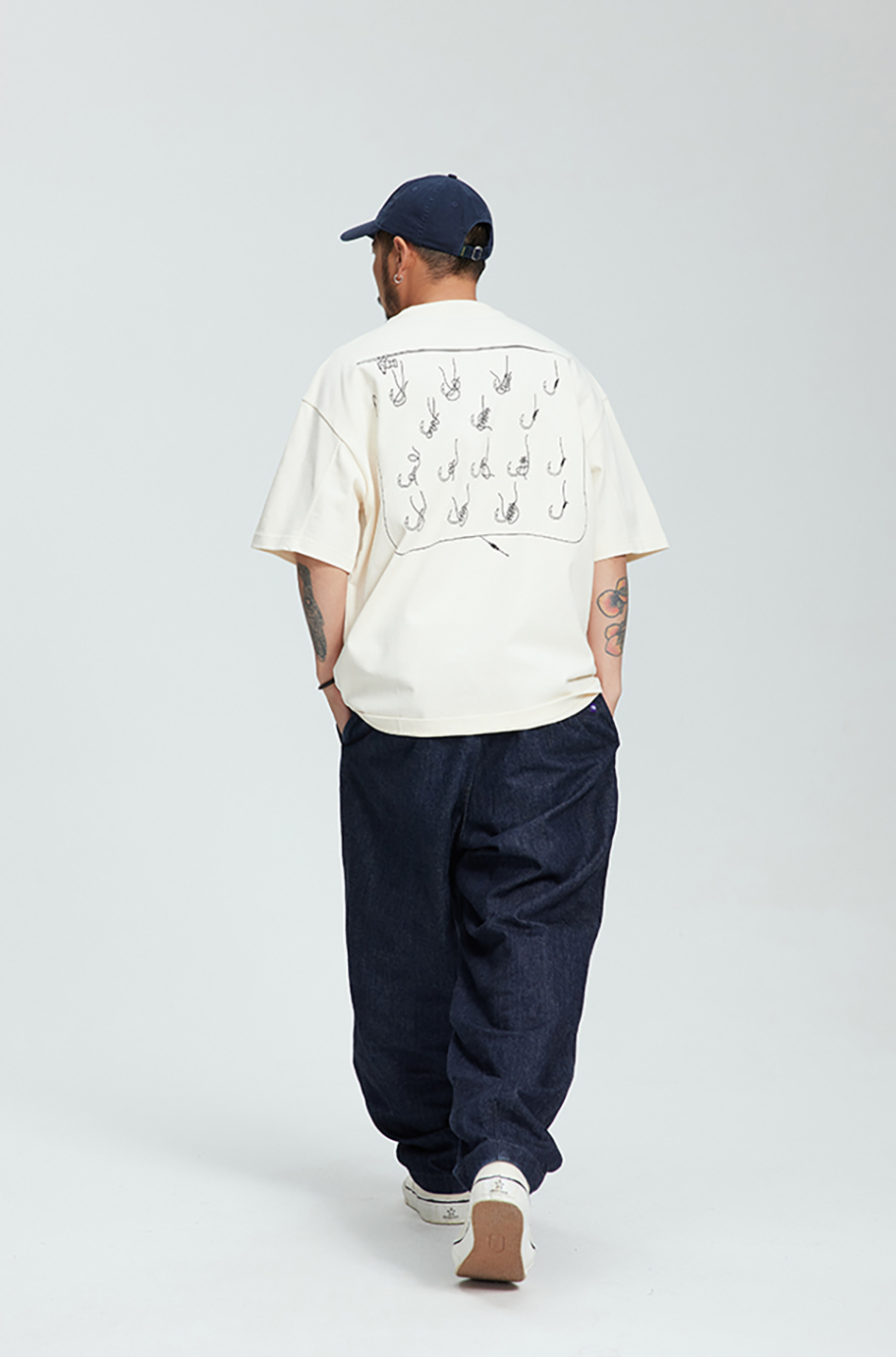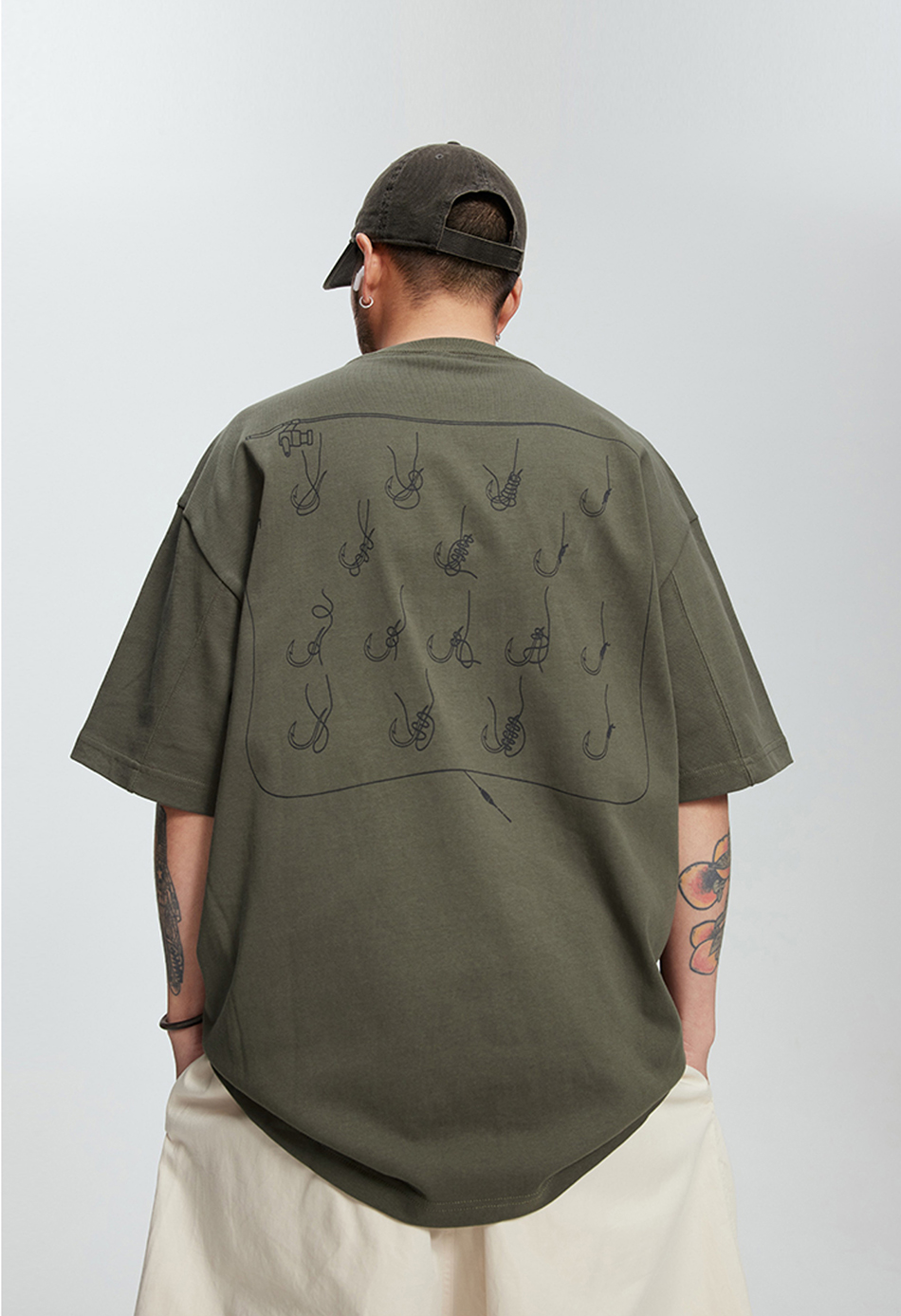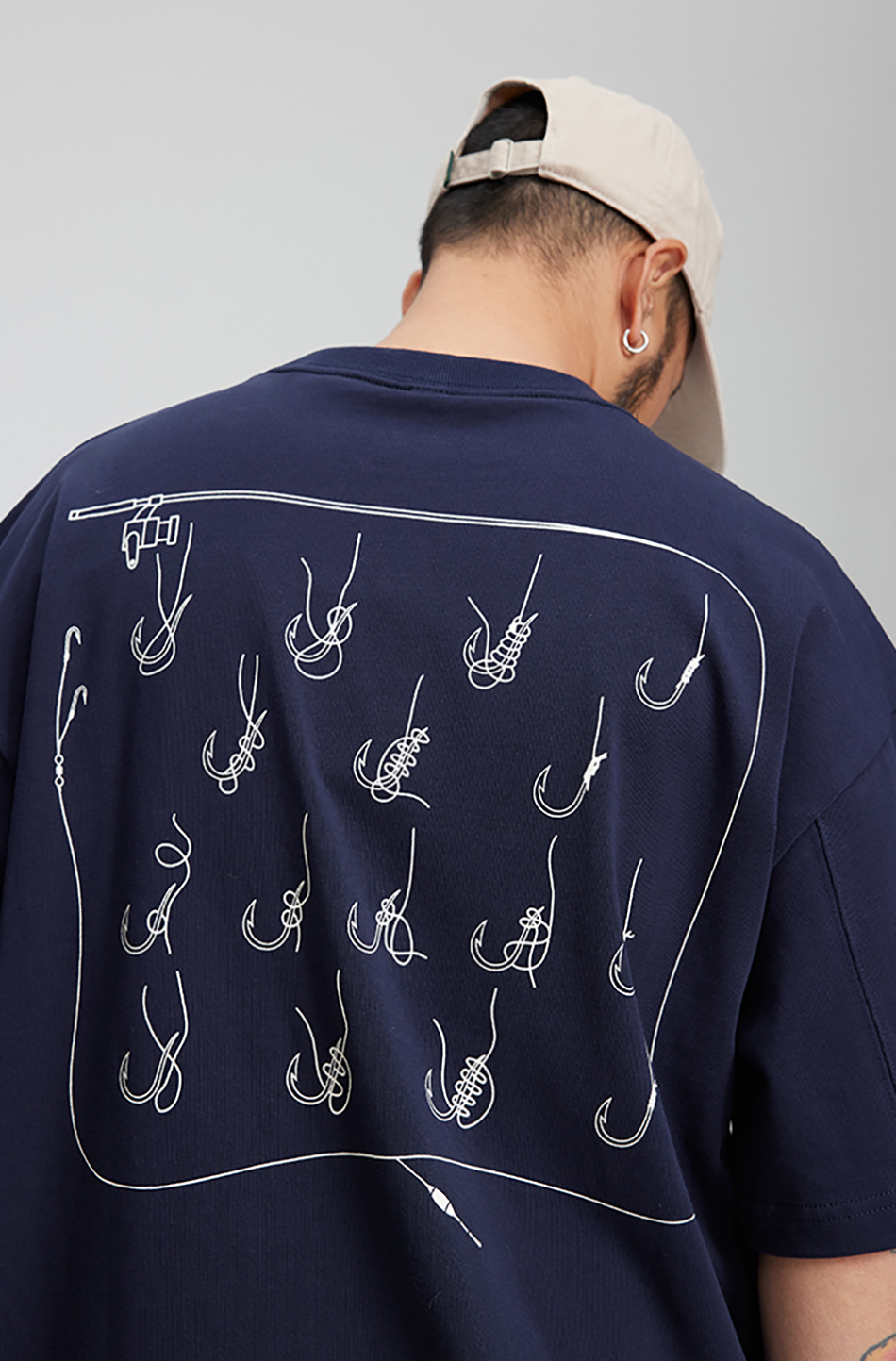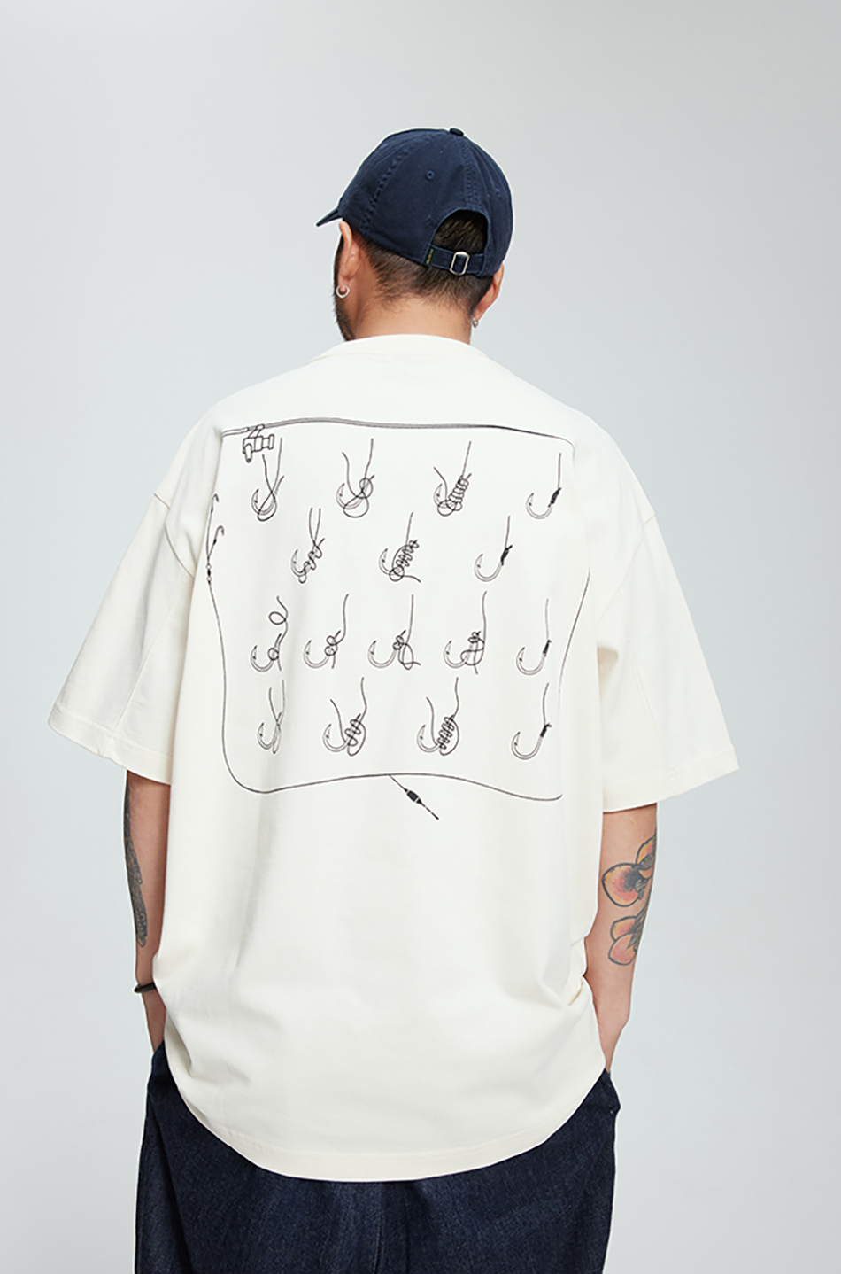 등판에 낚싯바늘과 낚싯줄의 다양한 모양으로 프린트가 포인트인 루즈핏의 티셔츠입니다.