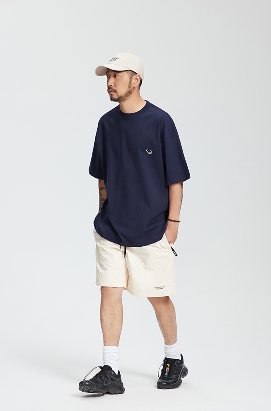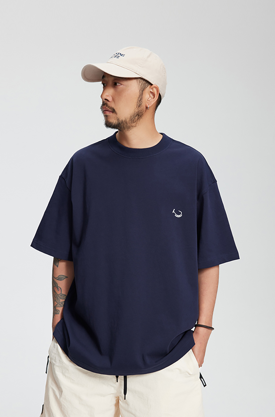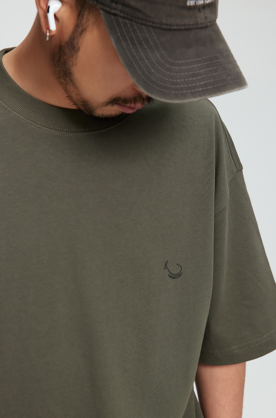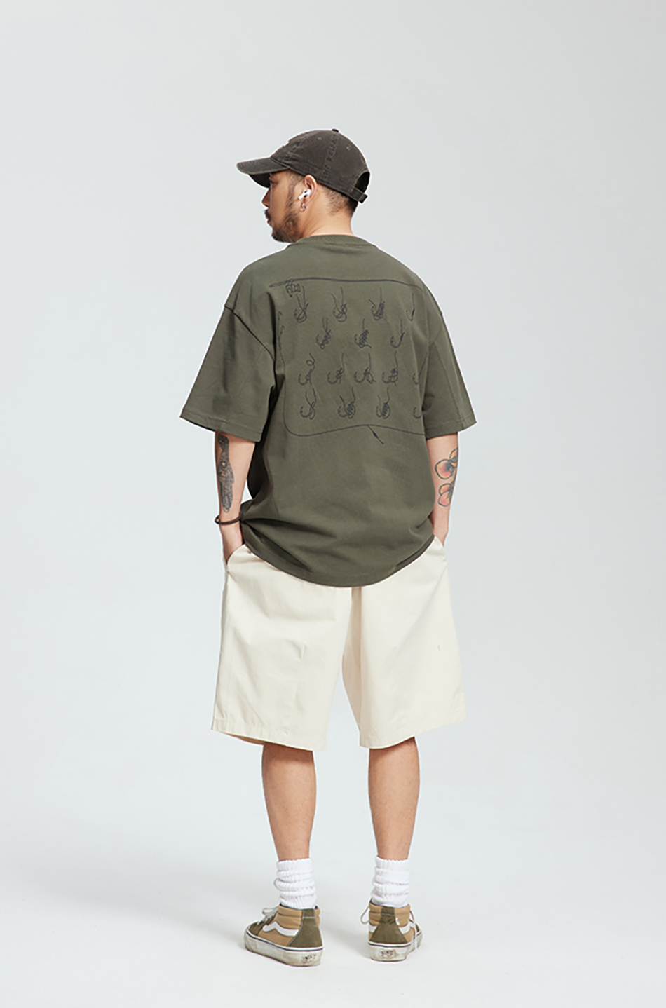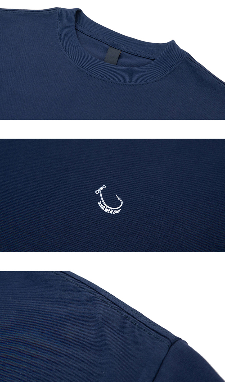 등판에 낚싯바늘과 낚싯줄의 다양한 모양으로 프린트가 포인트인 루즈핏의 티셔츠입니다.