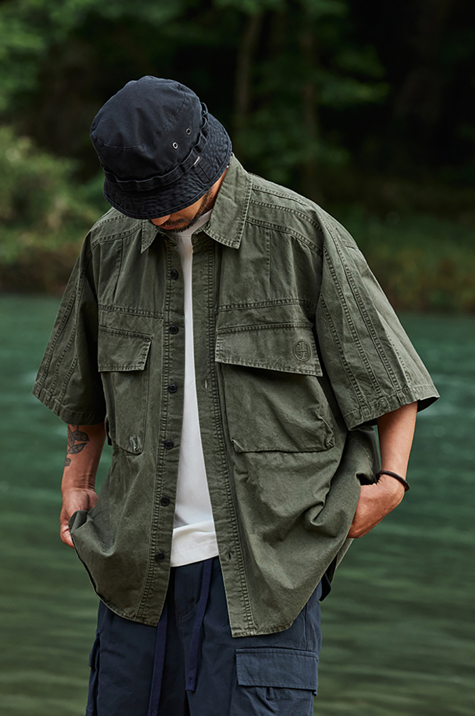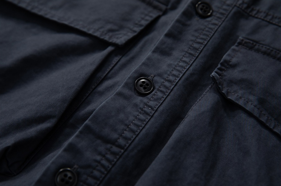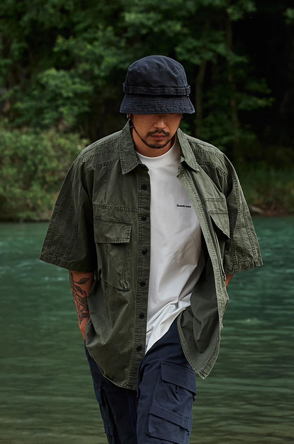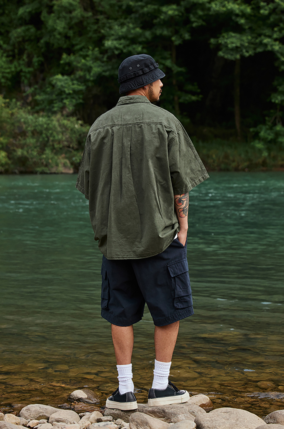 워싱과 디스트레스트 디테일을 넣어 빈티지한 무드를 보여주는 워크 셔츠입니다.