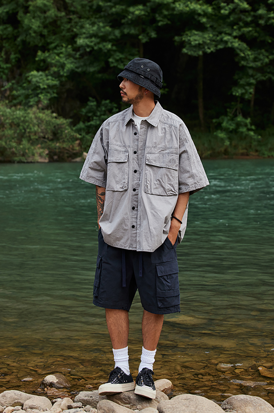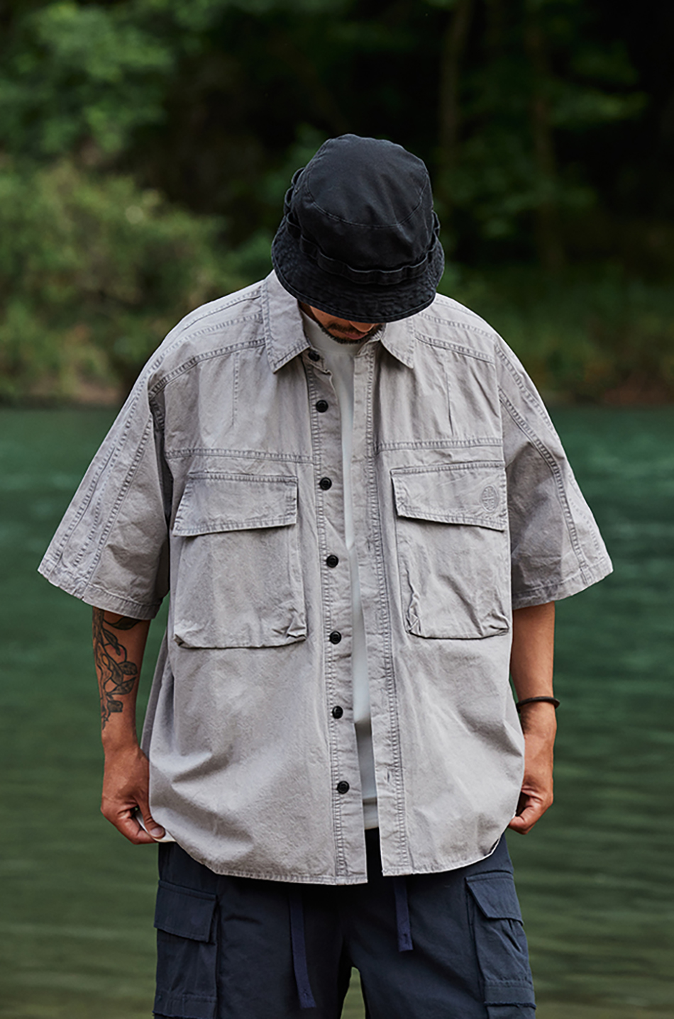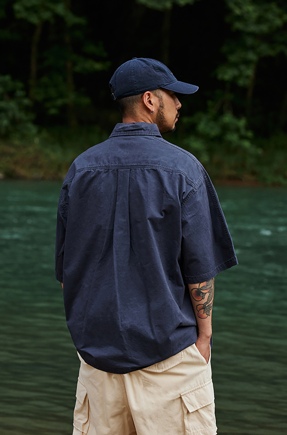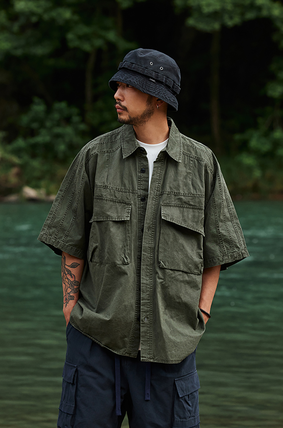 워싱과 디스트레스트 디테일을 넣어 빈티지한 무드를 보여주는 워크 셔츠입니다.