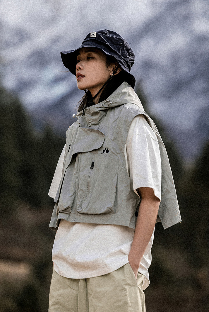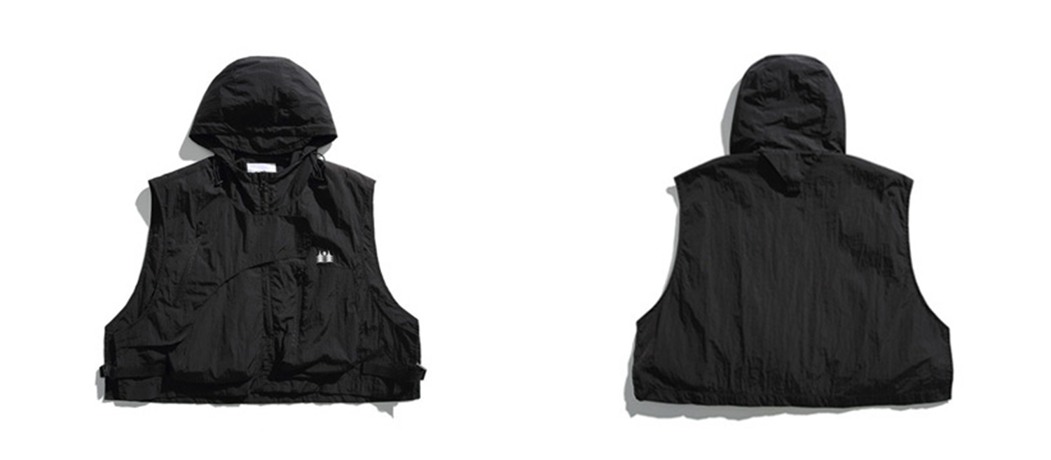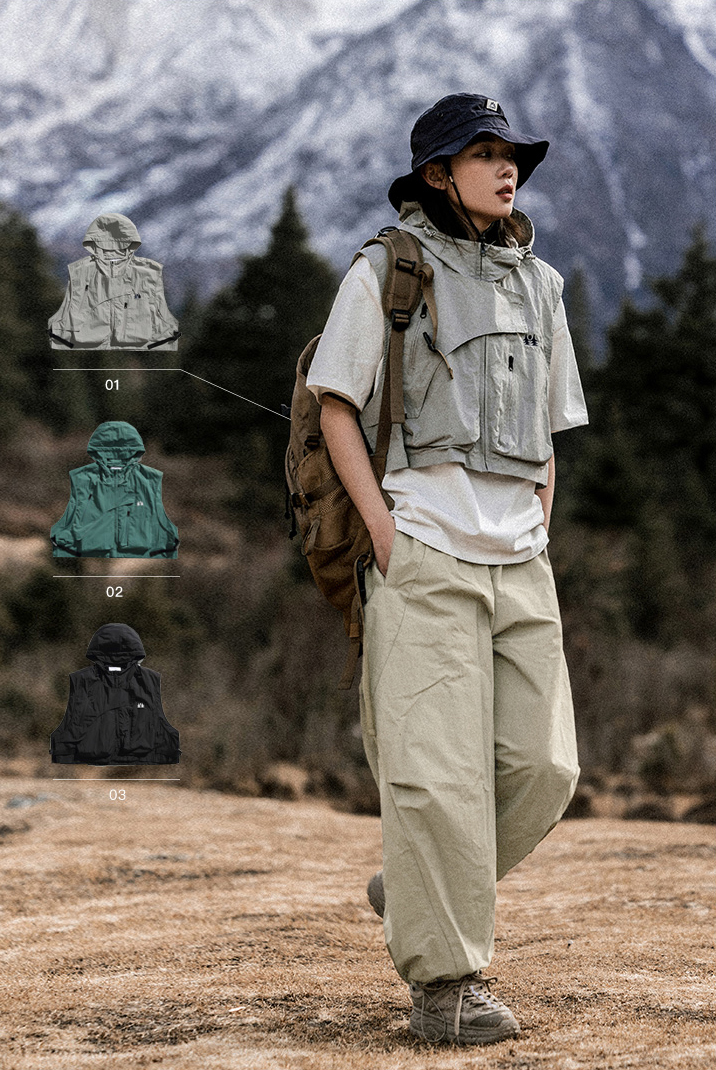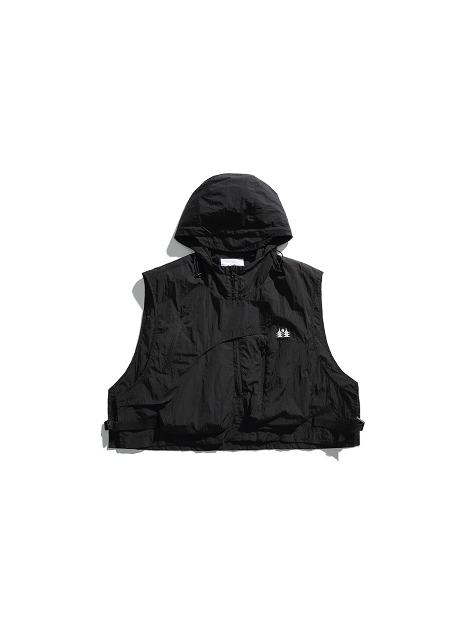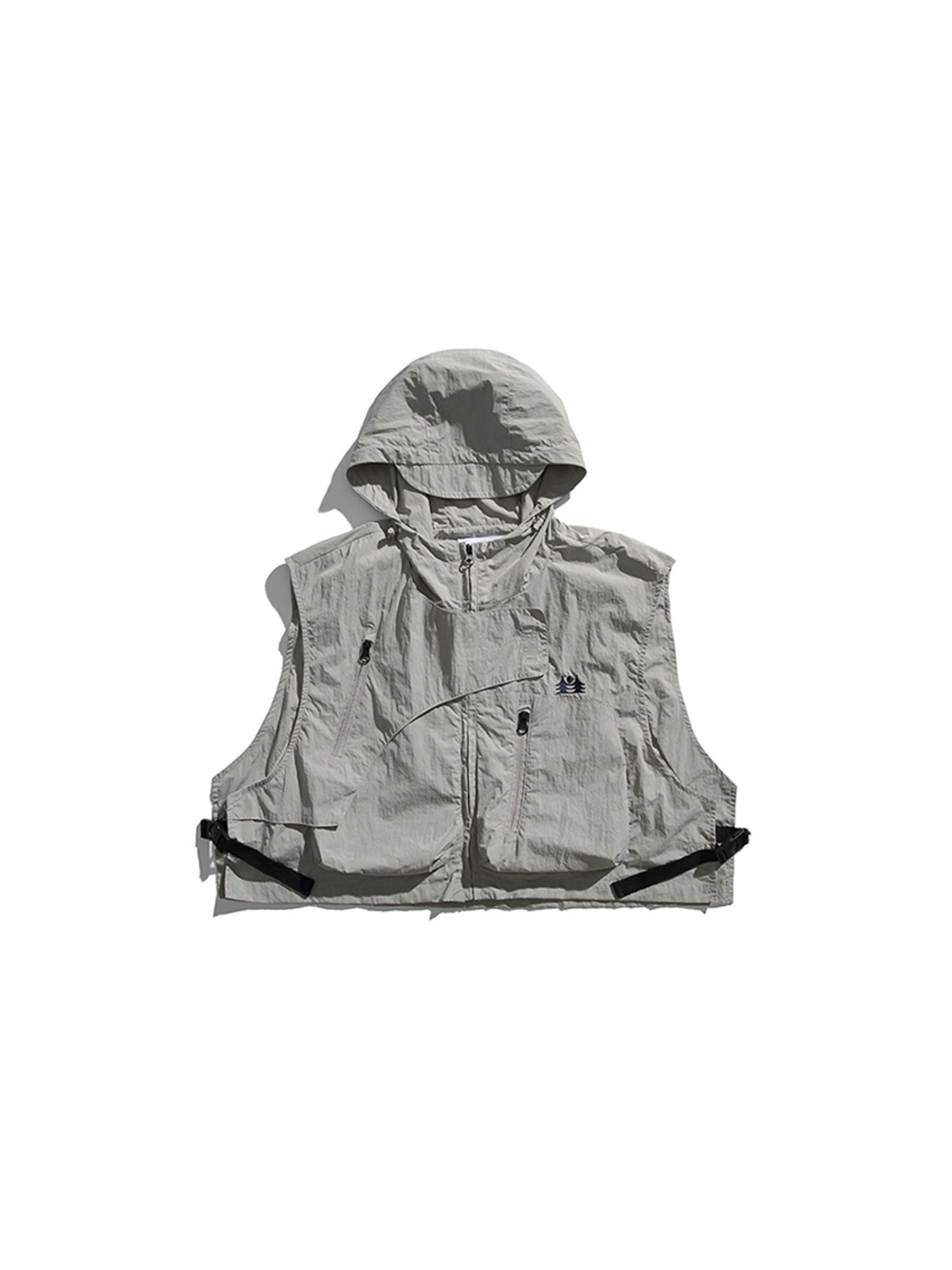 크롭한 기장과 & 후드 디자인으로 포인트를 준 아웃도어 베스트입니다.