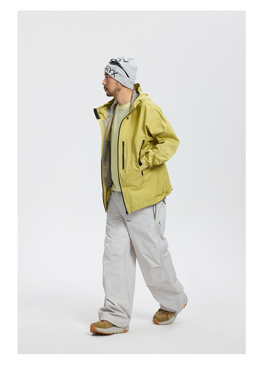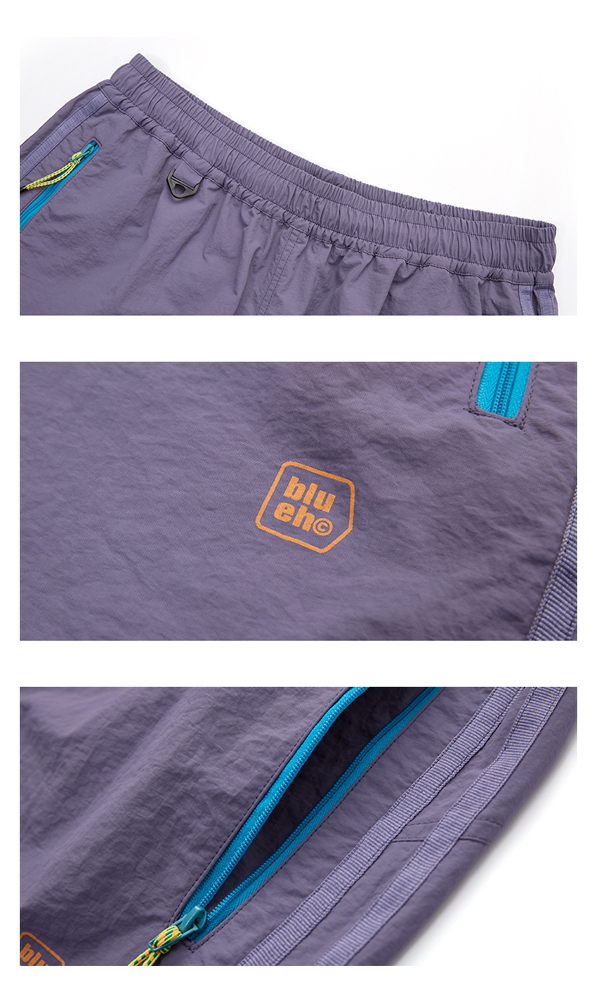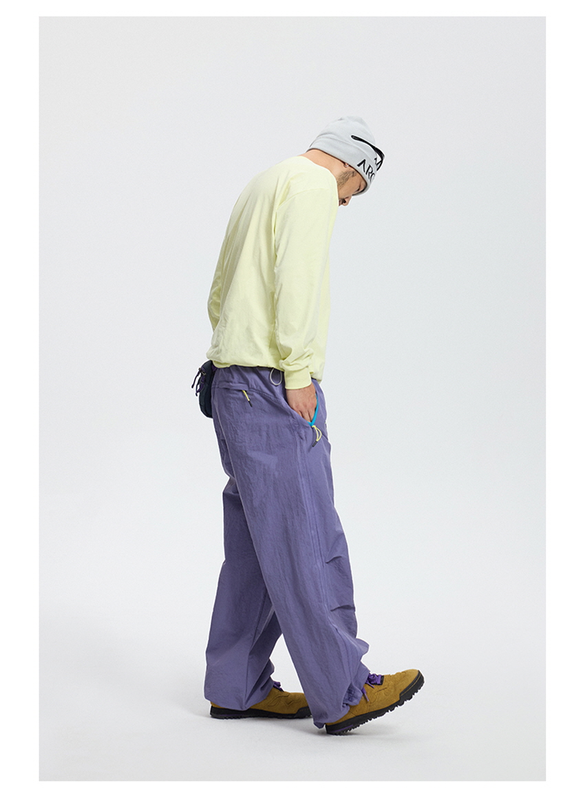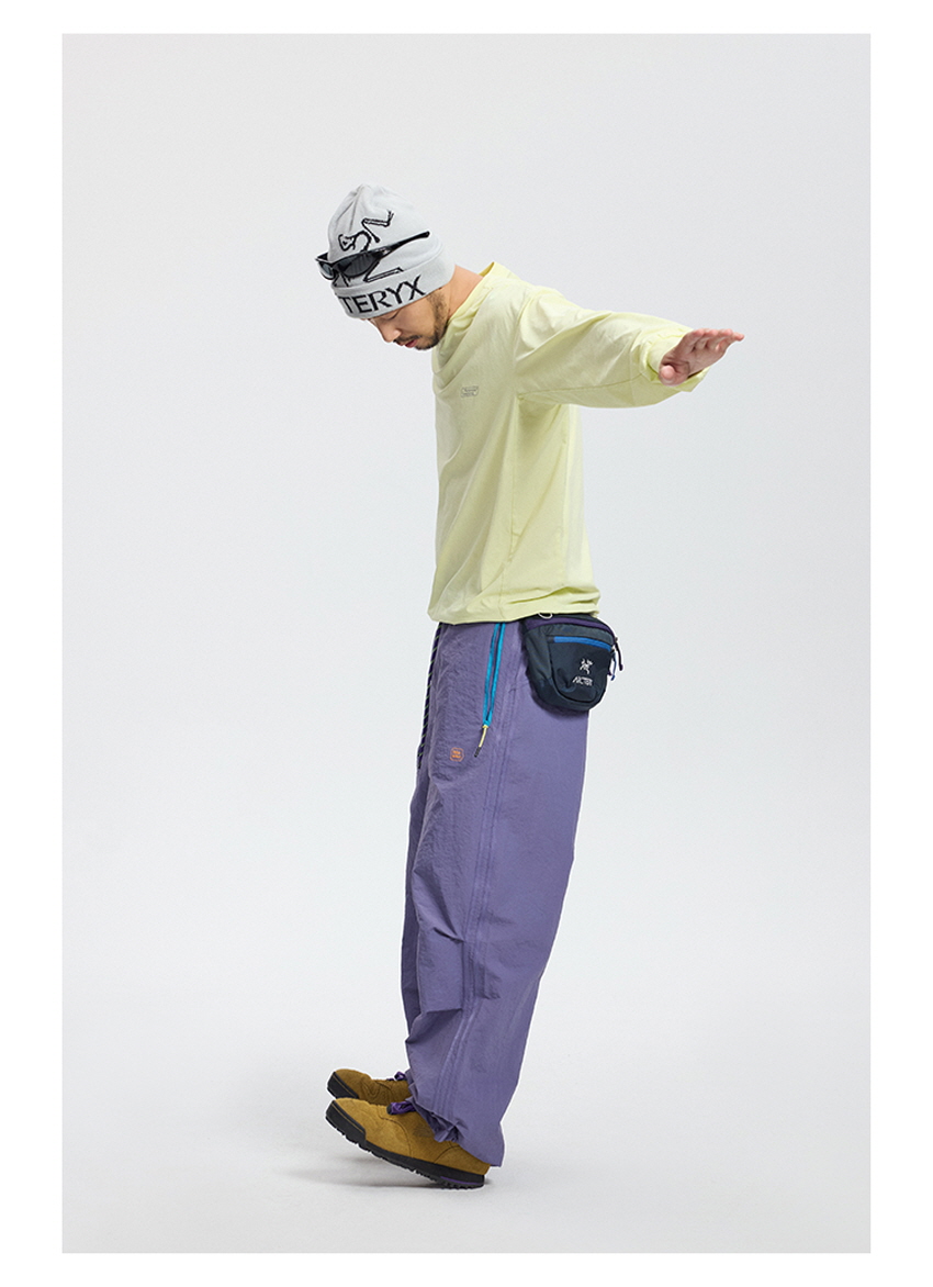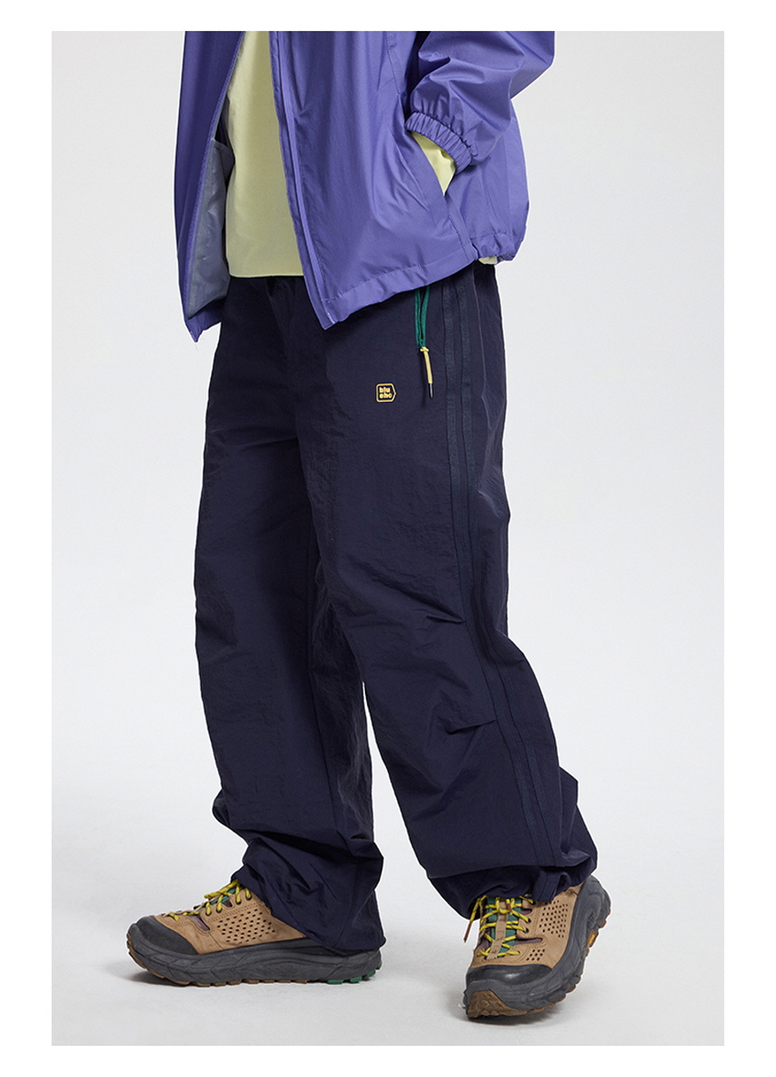 무릎 부분 플리츠 디테일과 사이드 웨빙으로 스포티한 무드를 보여주는 아웃도어 팬츠입니다.