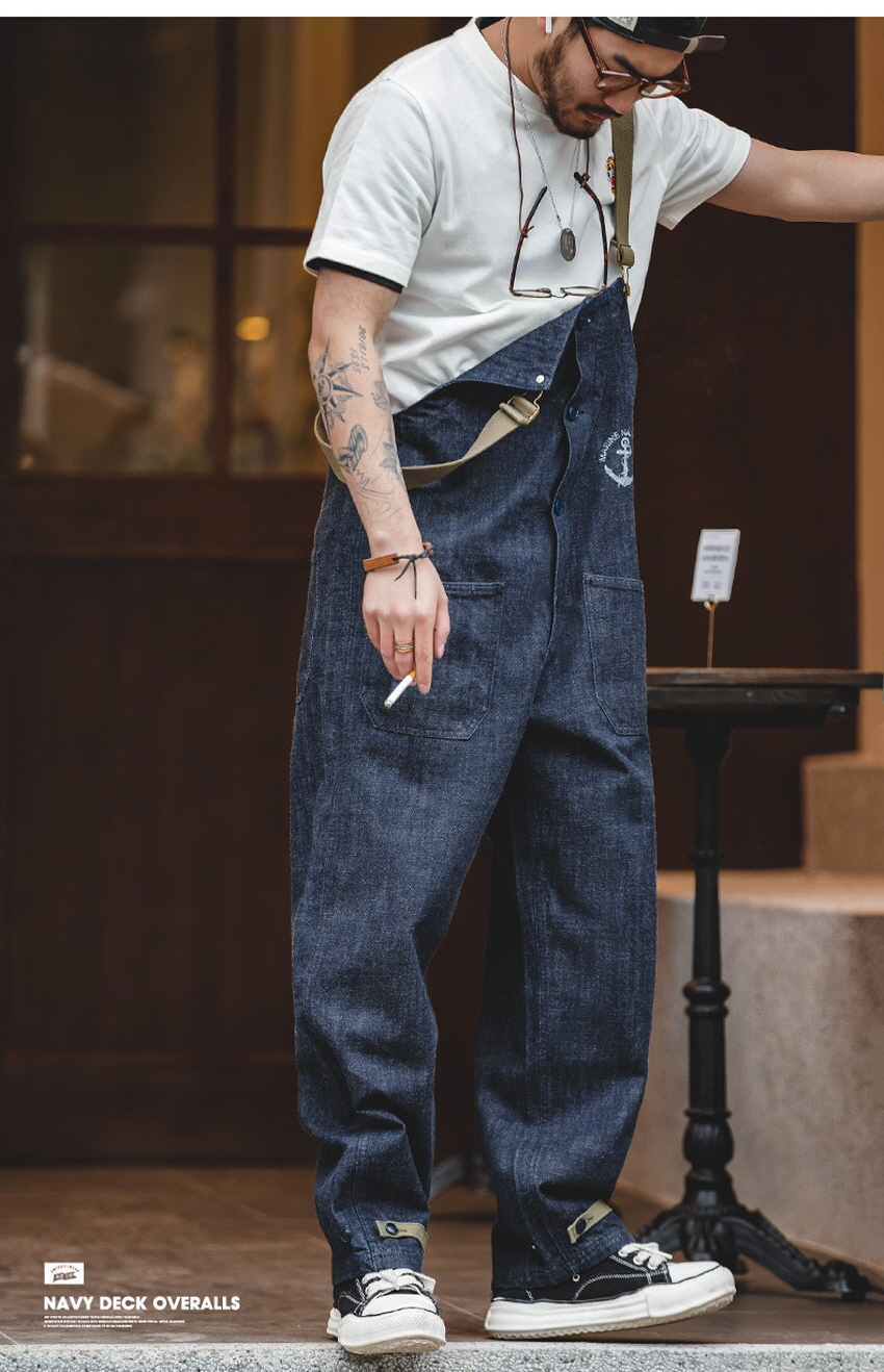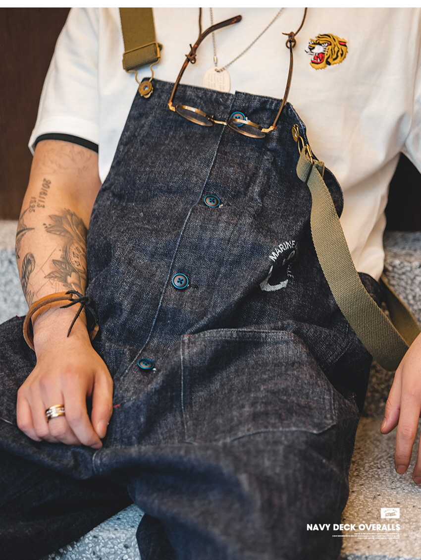 해군 군복을 모티브로 디자인된 밀리터리 무드의 덱 오버롤 셀비지 진입니다.