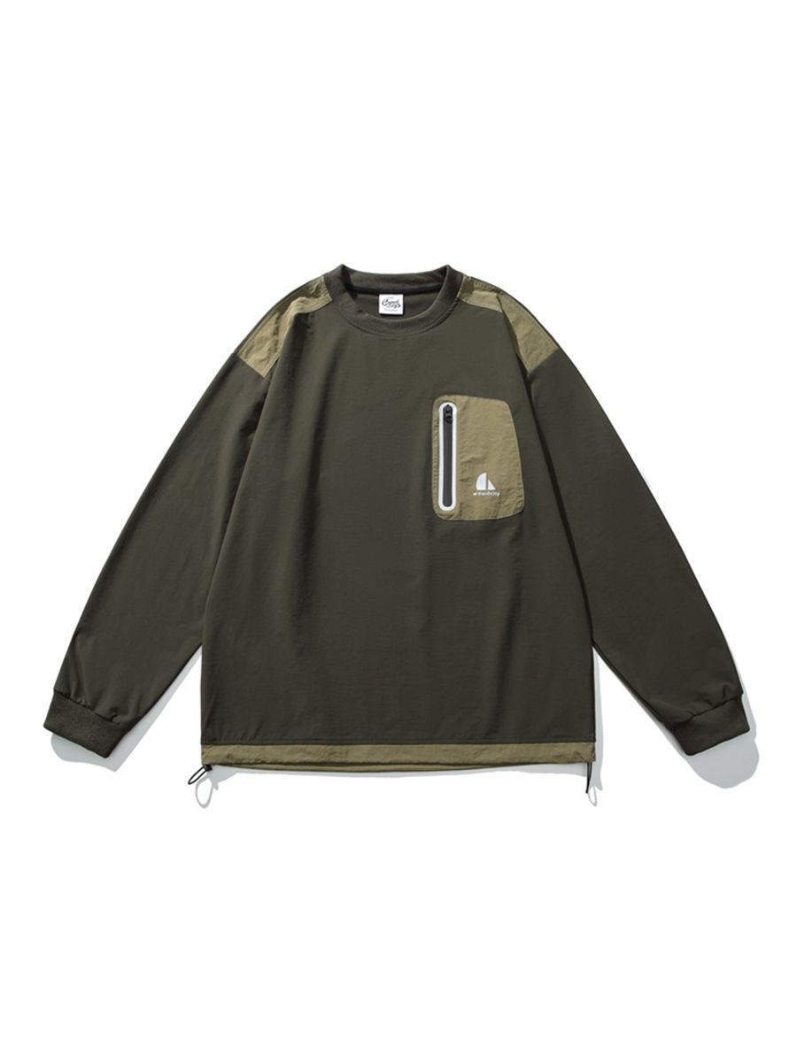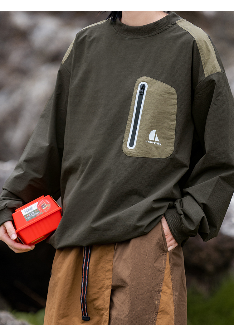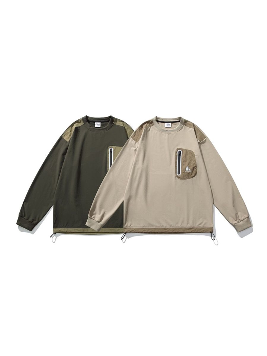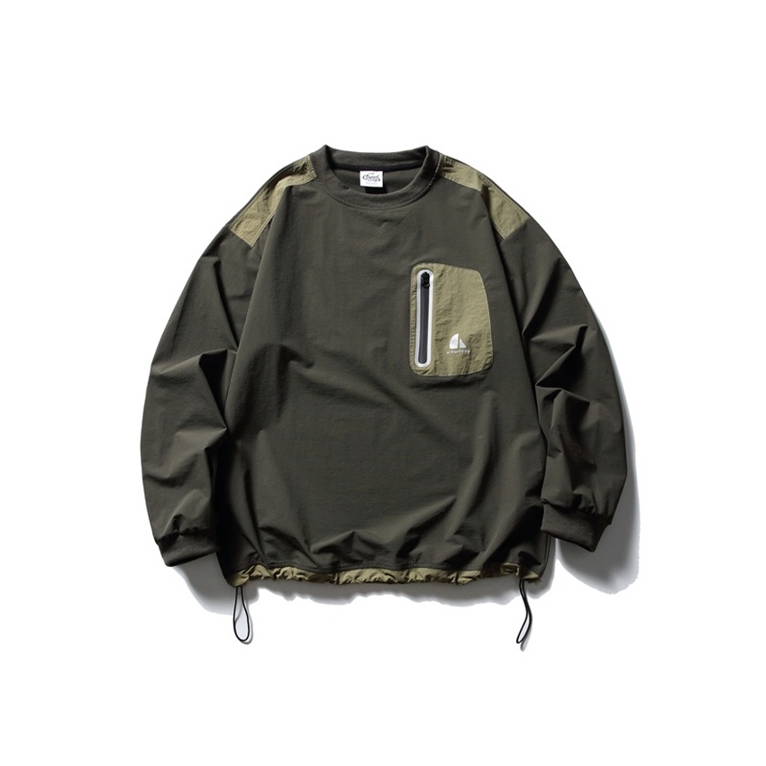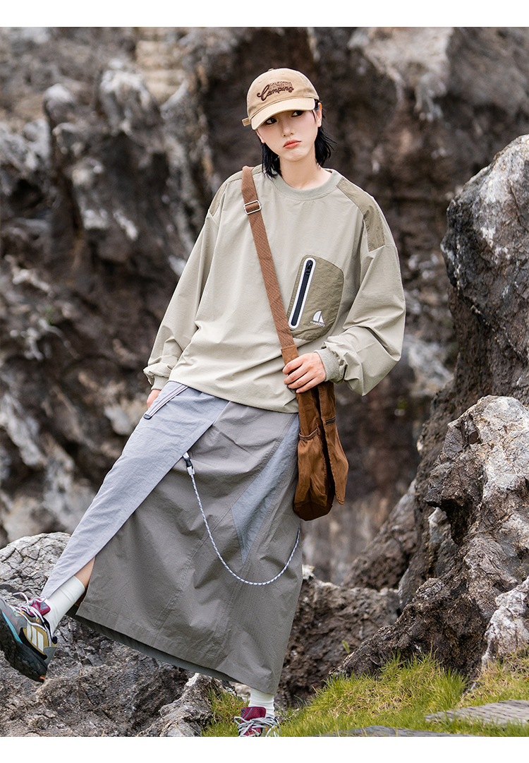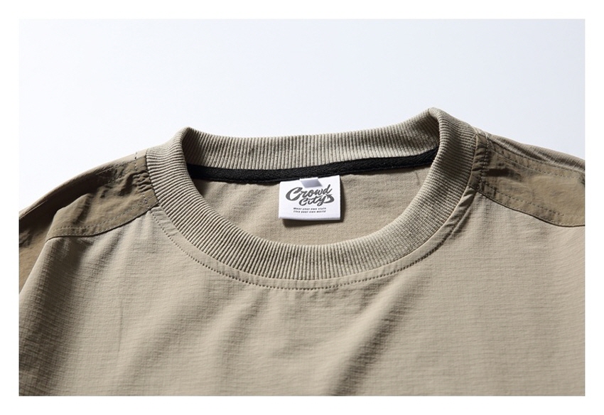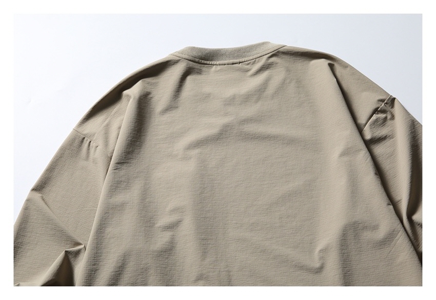포켓 디테일과 나일론 소재로 아웃도어 무드를 보여주는 루즈핏 티셔츠입니다.