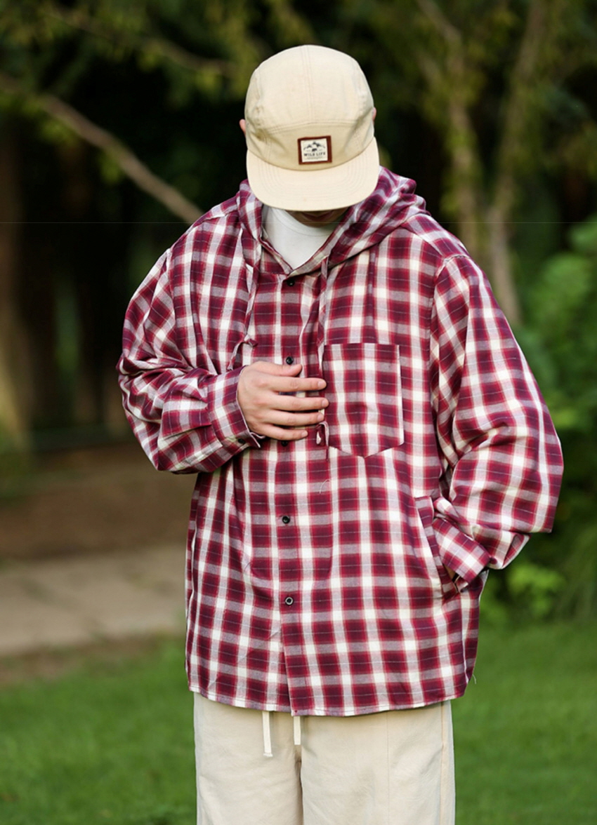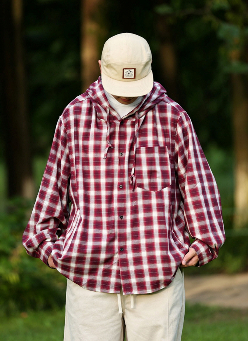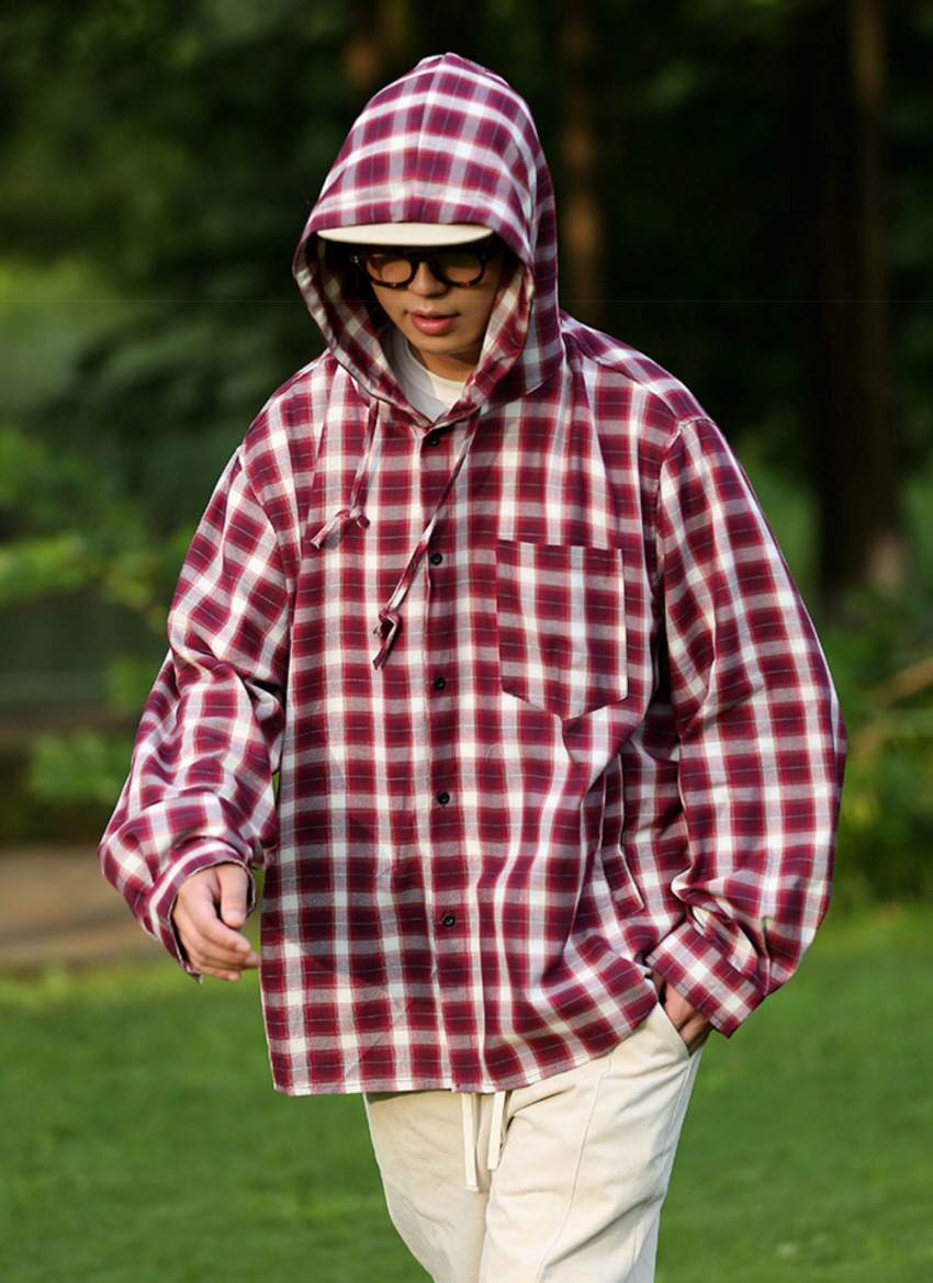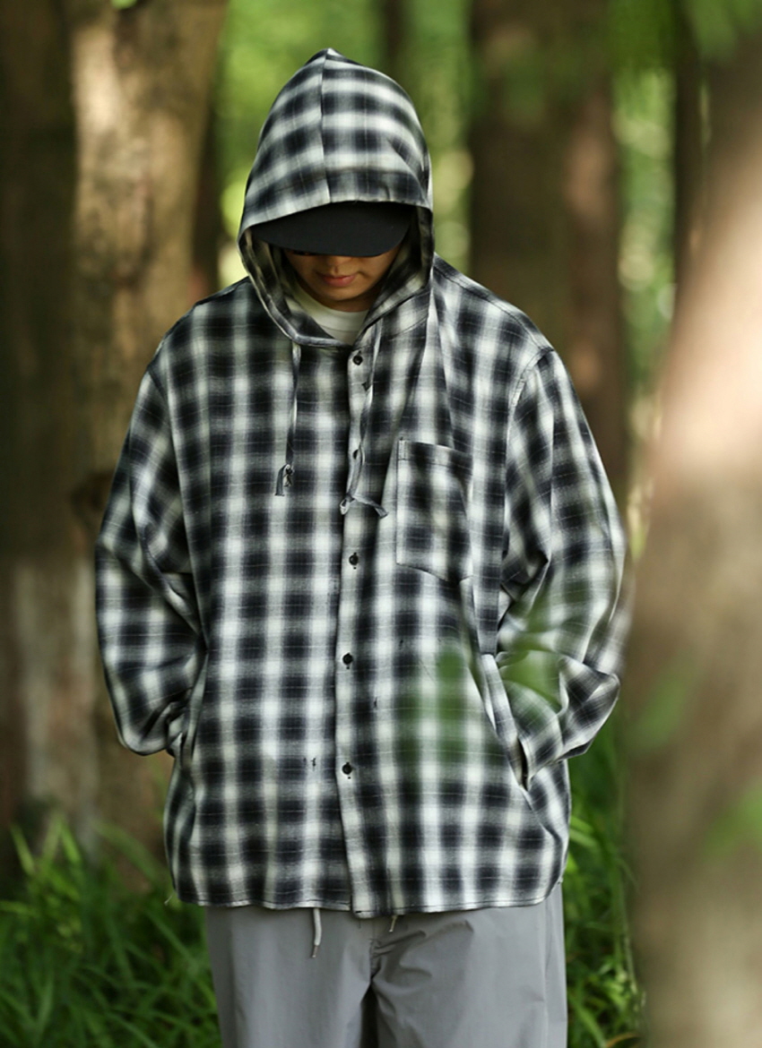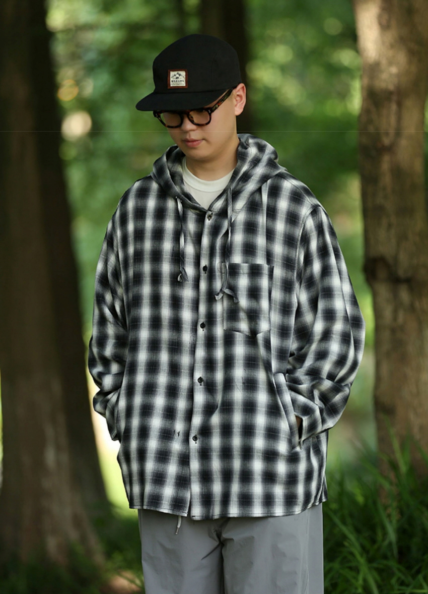 데일리로 입기 좋은 빈티지한 무드의 체크 패턴 후드 셔츠입니다.