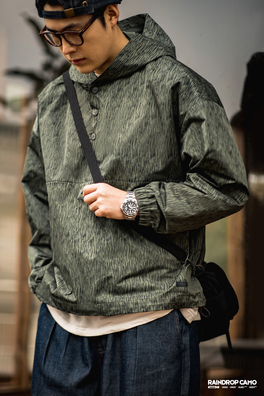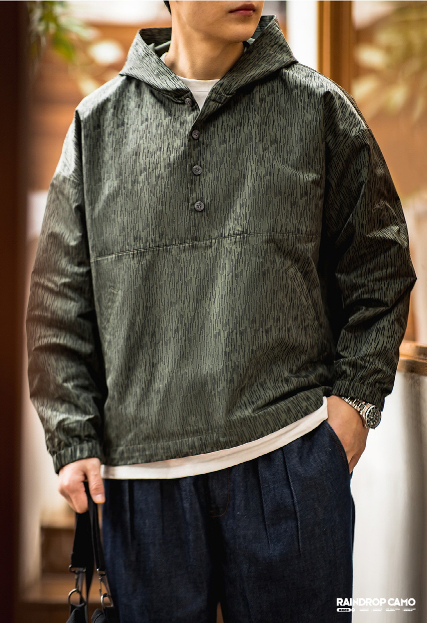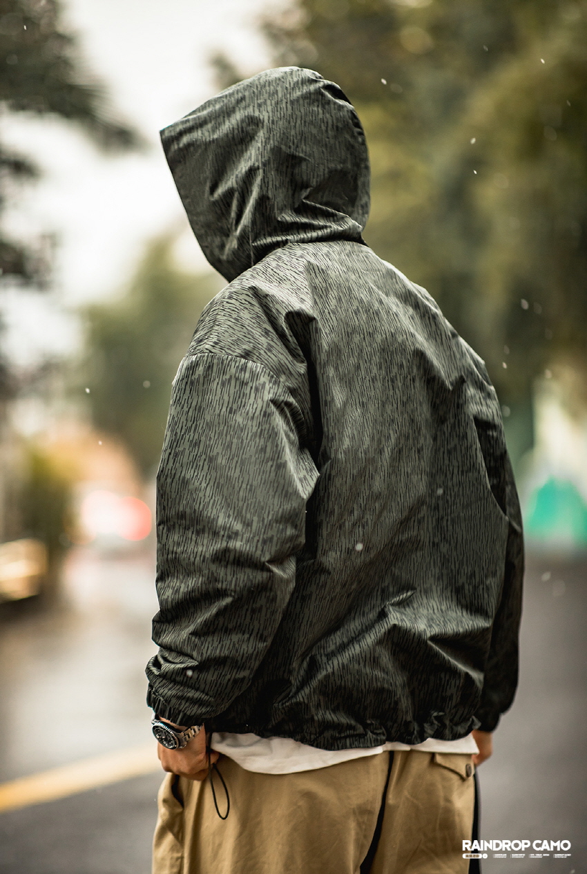 방수기능이 있는 카모플라주 디자인의 윈드브레이커입니다.