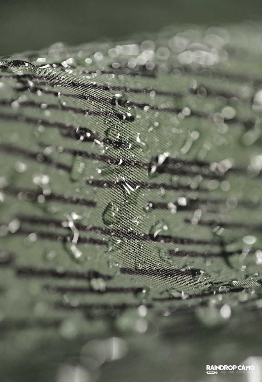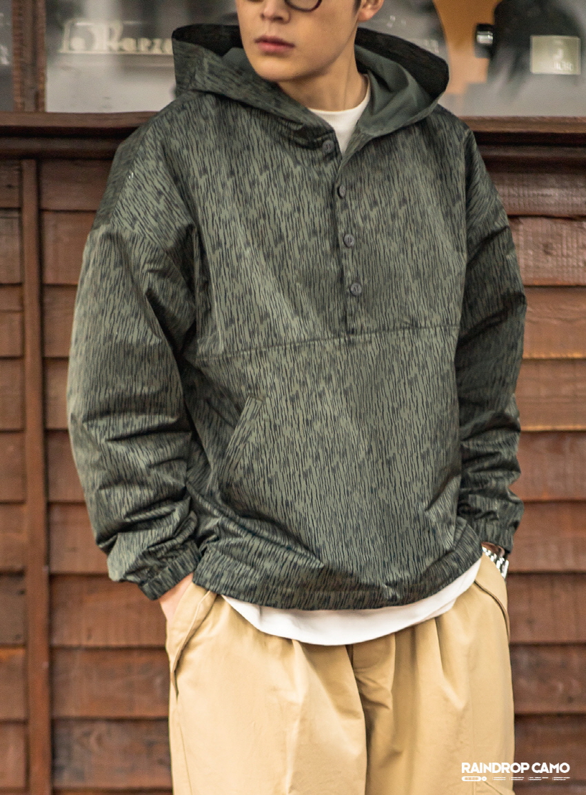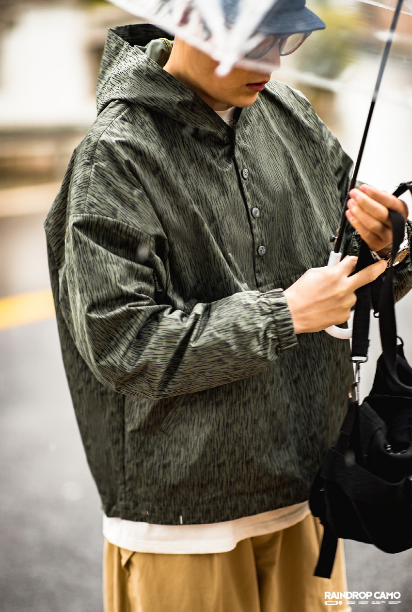 방수기능이 있는 카모플라주 디자인의 윈드브레이커입니다.