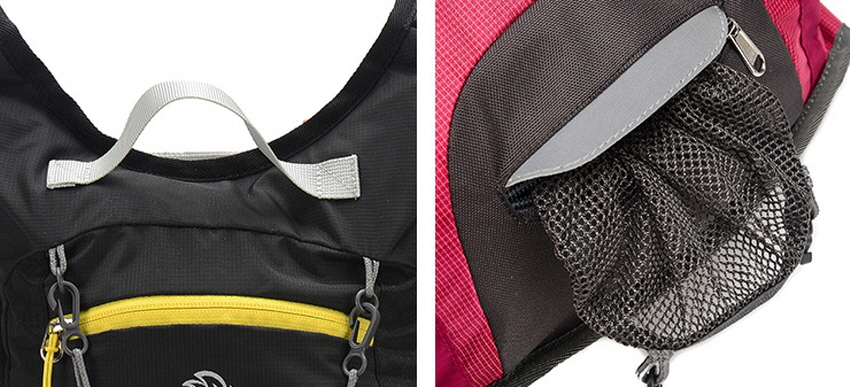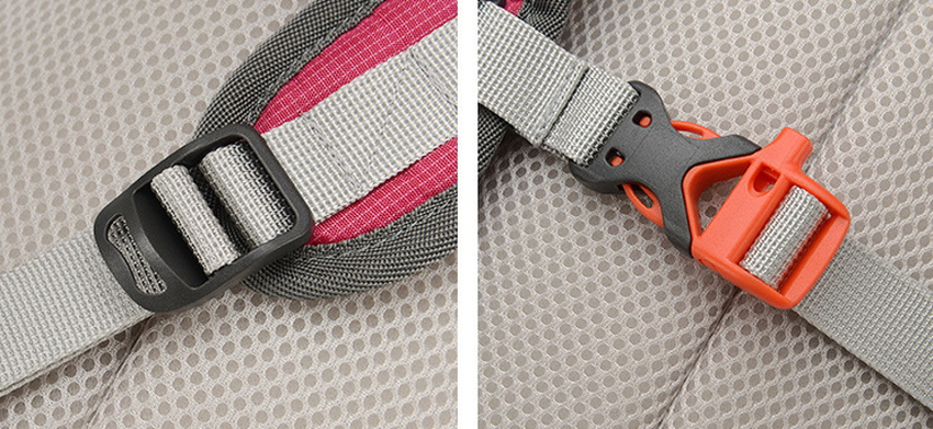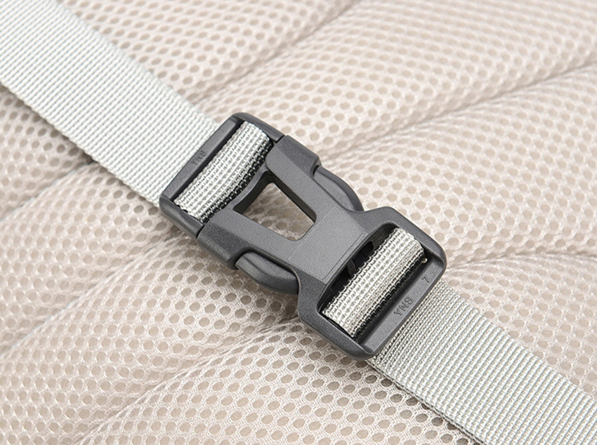 - 백팩 상단에 메쉬 포켓을 걸 수 있는 버클이 있습니다.