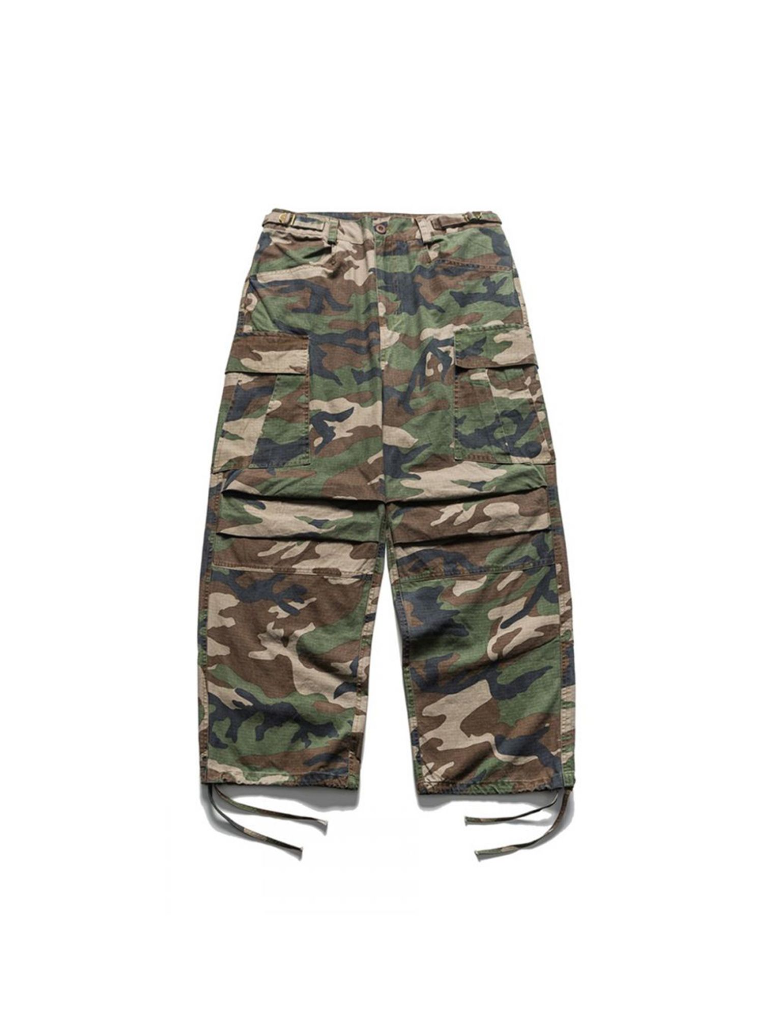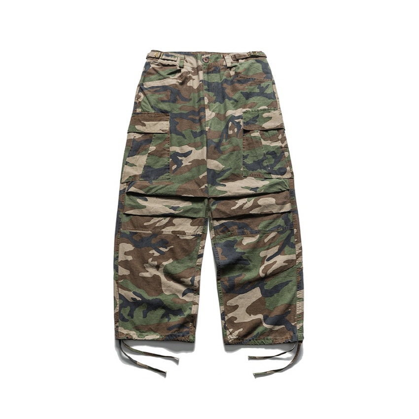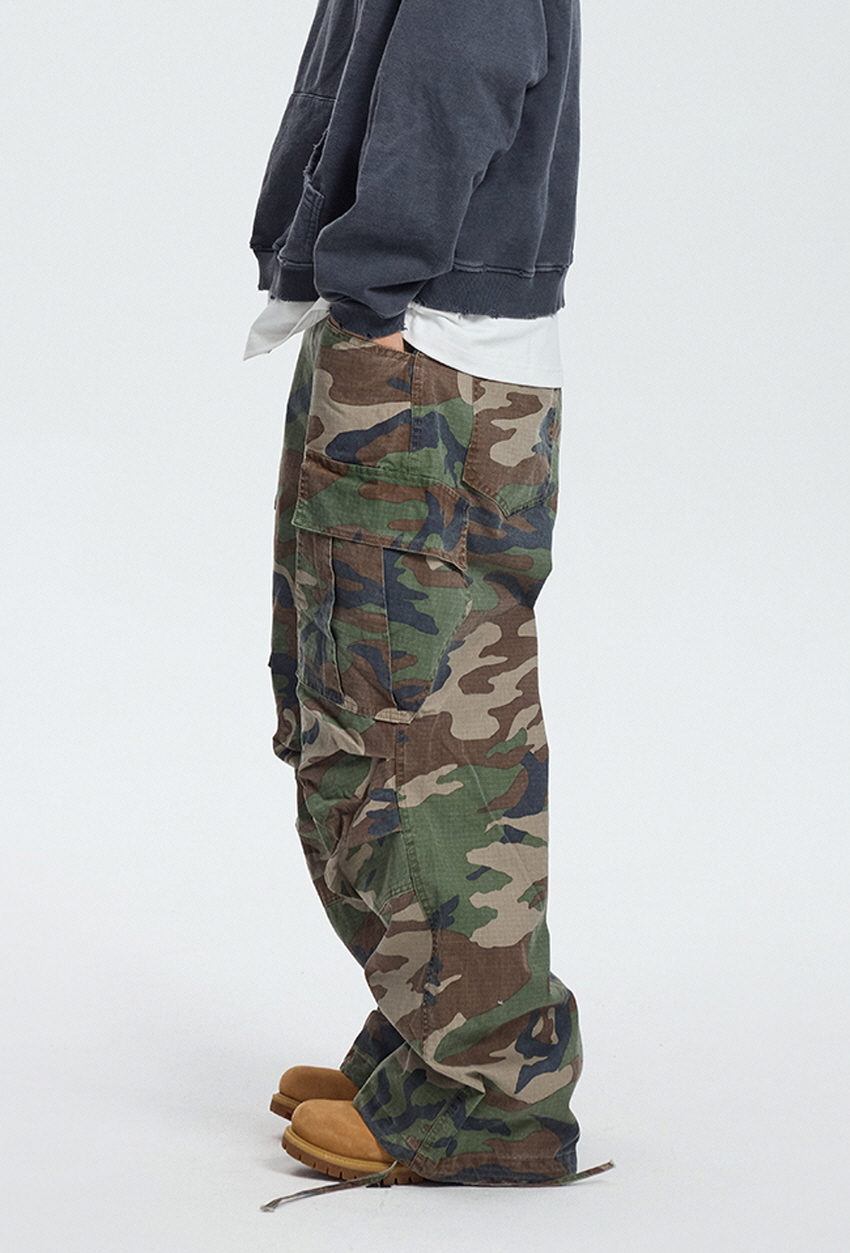 와이드한 핏의 카모플라주 카고 팬츠입니다.