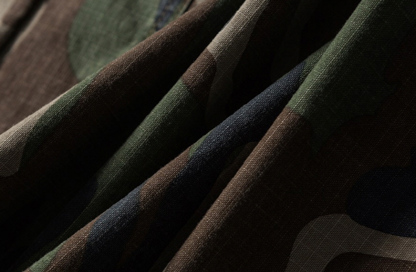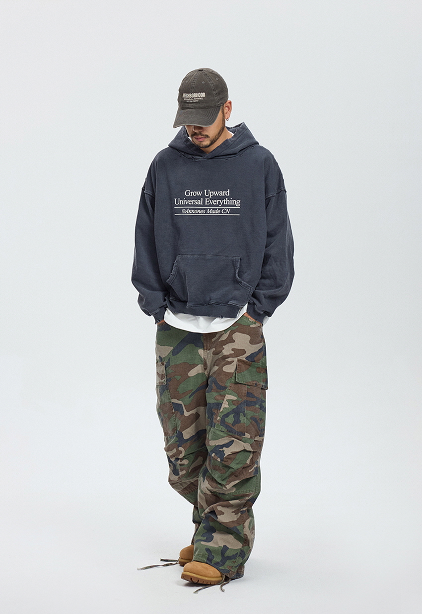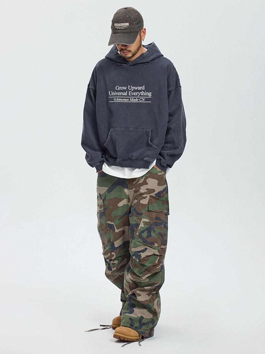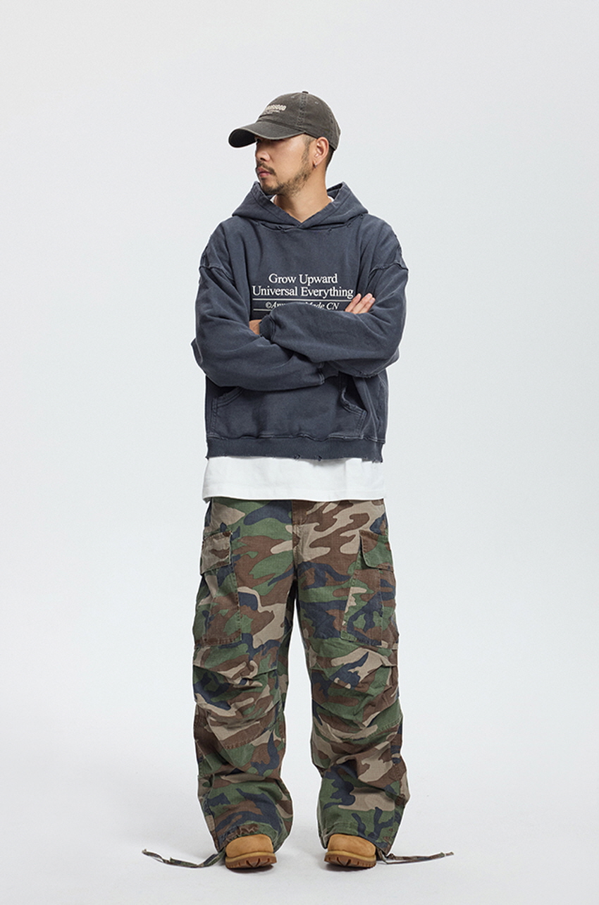 와이드한 핏의 카모플라주 카고 팬츠입니다.