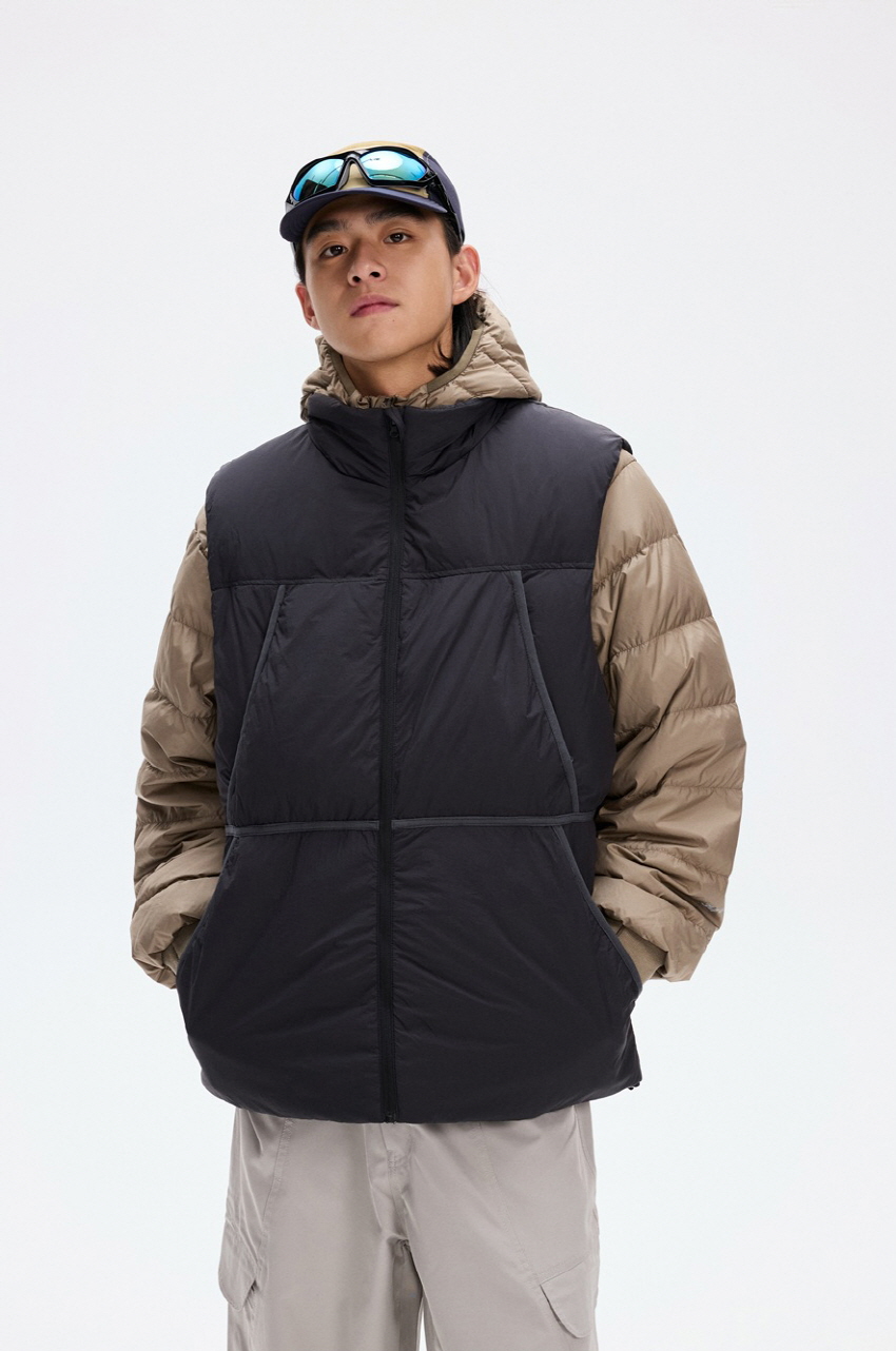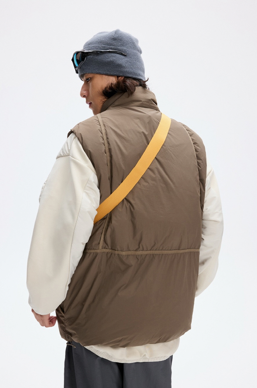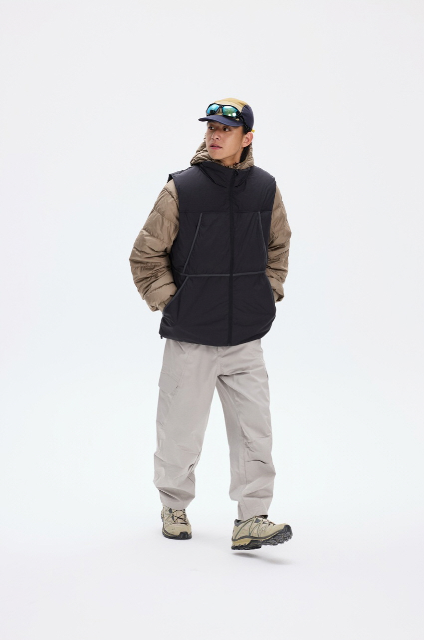 레트로한 무드의 라인과 배색이 포인트인 따뜻한 아웃도어 패딩 조끼입니다.